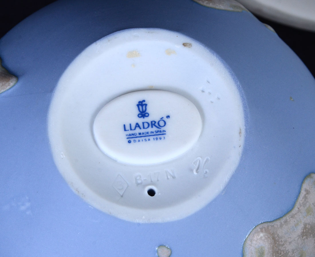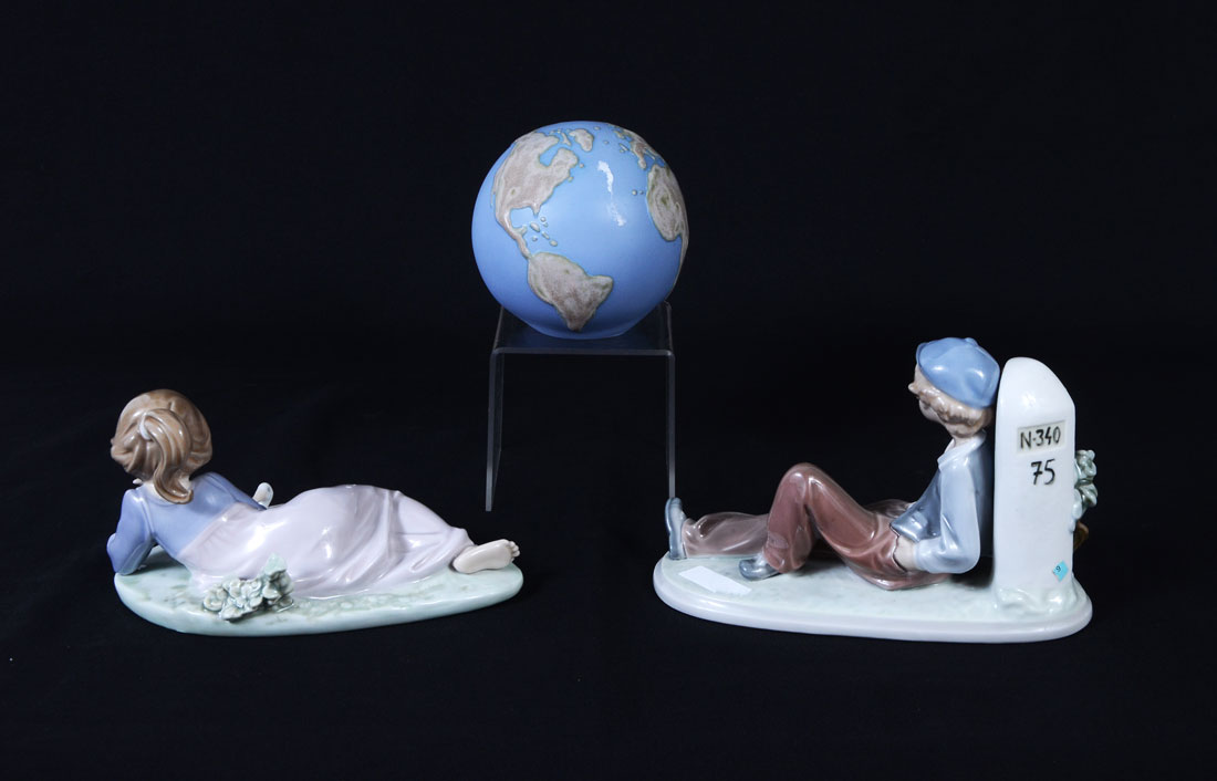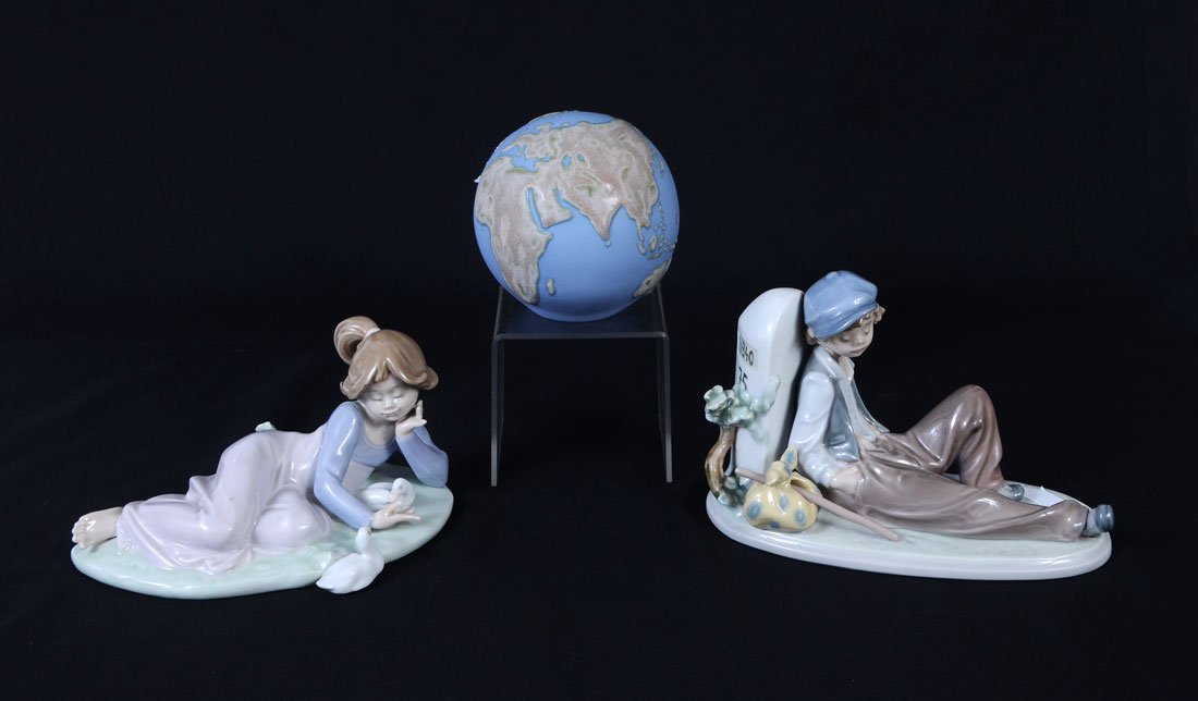 3 LLADRO PORCELAIN FIGURINES & GLOBE: 3 pieces total to include 1) Playful Friends, issued 1989, retired 1995, 3 1/2'' h. 2) Time to Rest, issued 1987, retired 1993, 4 3/4'' h. 3) Globe paperweight, issued 1994, retired 1996. No boxes.