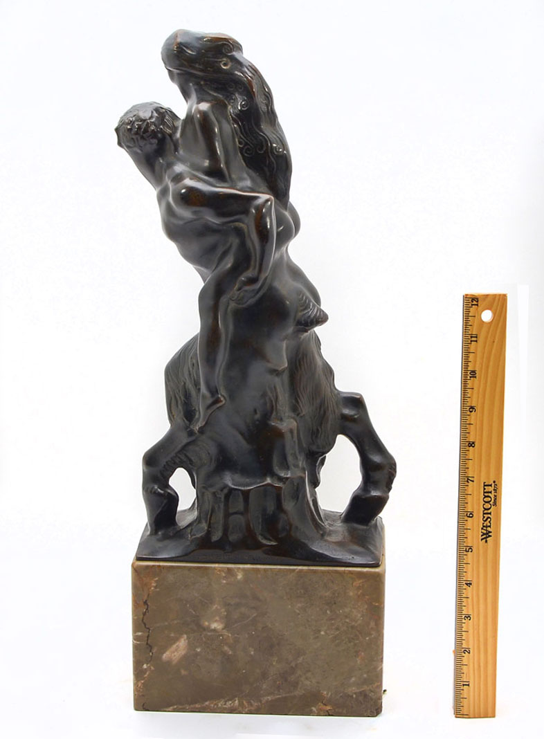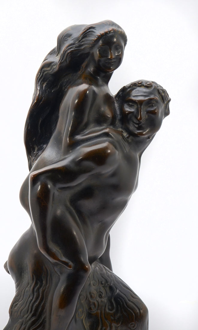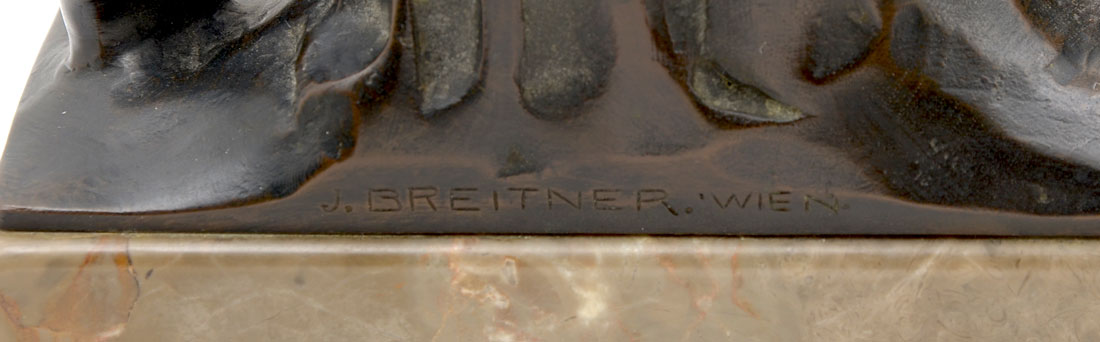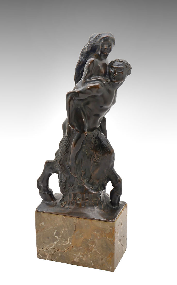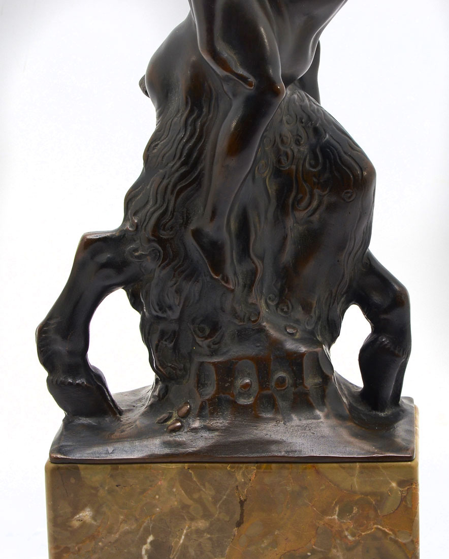 JOSEPH BREITNER ''SATYR & NUDE'' BRONZE SCULPTURE: This whimsical bronze sculpture of a Satyr in stride with a nude woman on his back, was created by Joseph Breitner (Vienna 1864-1930). Mounted to a grayish-brown marble pedestal with veins of white and toffee throughout. Approx. 19'' h x 7.25'' l x 4.25'' w.