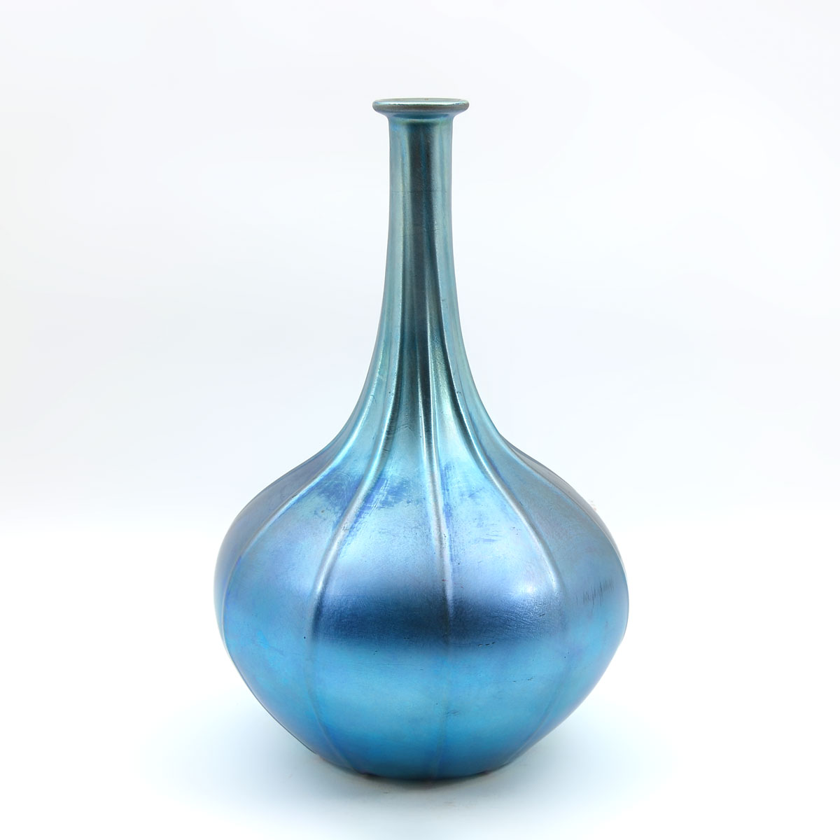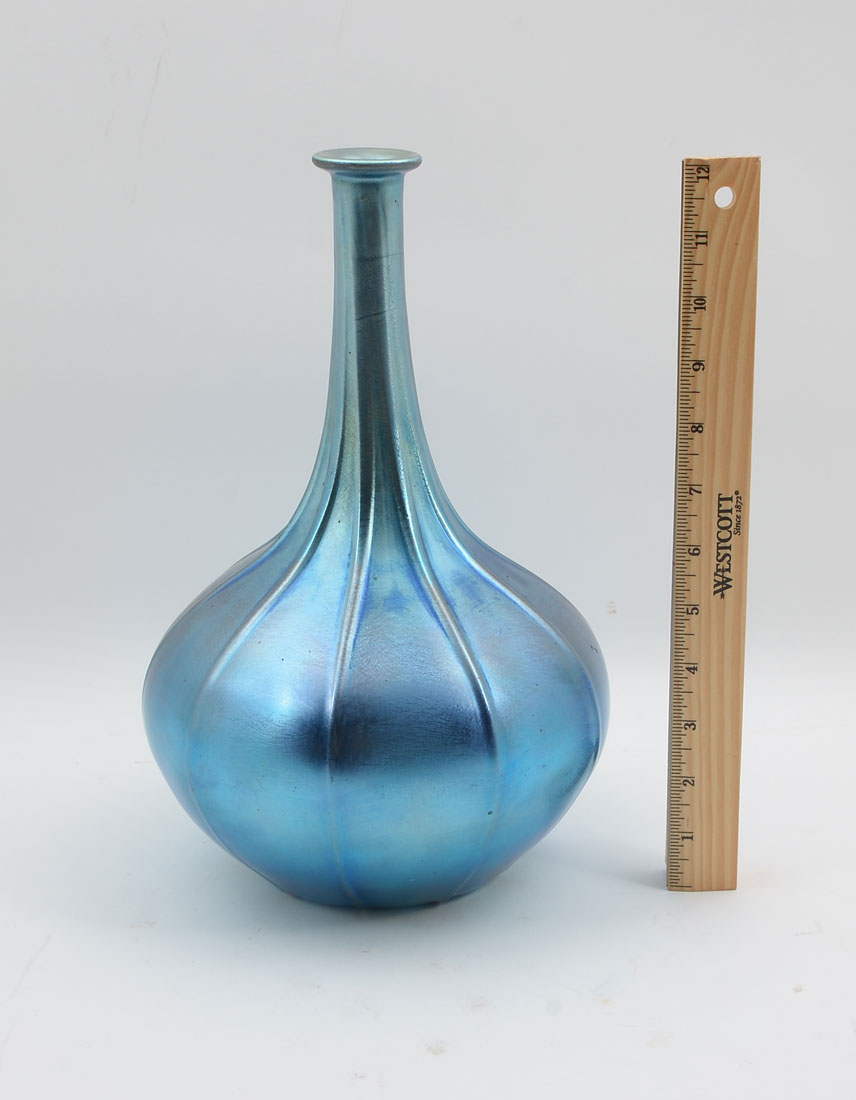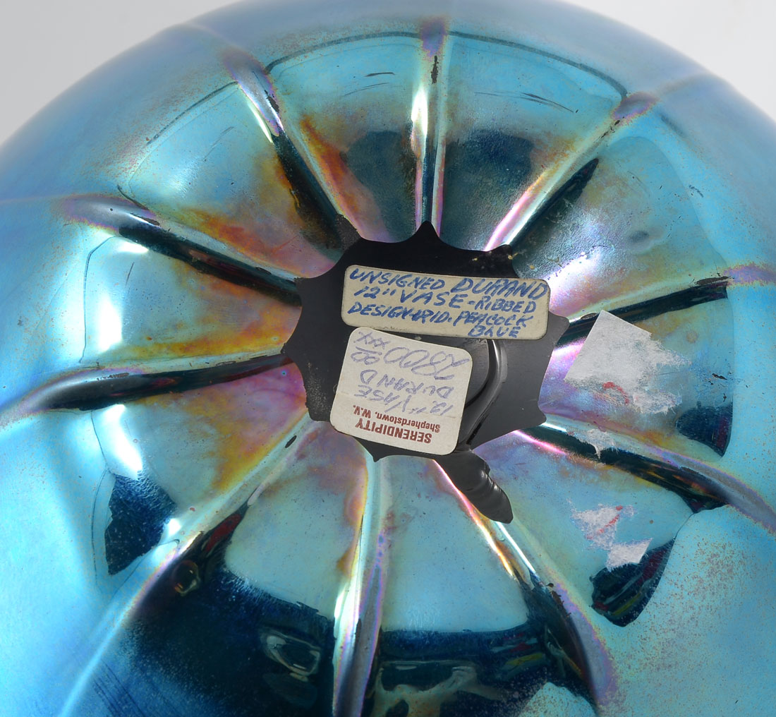 IRIDESCENT PEACOCK BLUE DURAND RIBBED GENIE BOTTLE: This is a less common Durand bud vase/genie bottle with an iridescent Peacock Blue in a ribbed pattern. Durand art glass was only produced for 6 years (1924-1931). Original purchase sticker on bottom with a price of $2,800. Approx. 12.25'' h 8'' w.