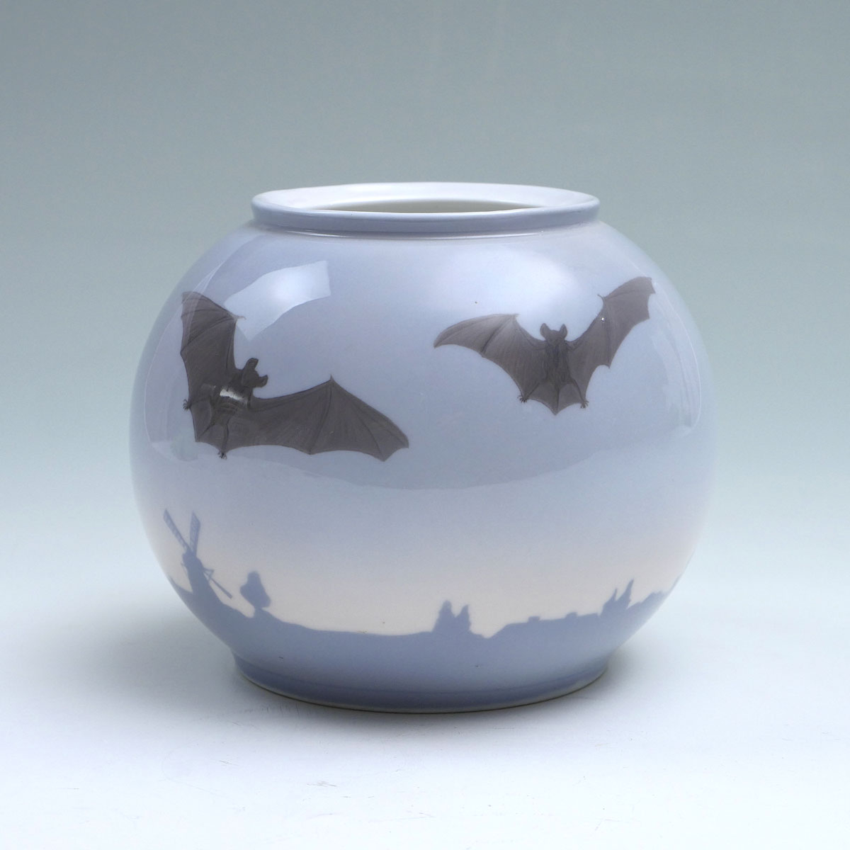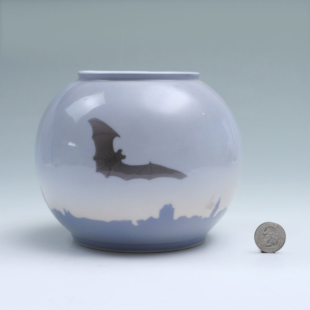ROYAL COPENHAGEN BAT MOTIF VASE: This vase was masterfully crafted circa. 1900 in Denmark by Royal Copenhagen. Hand painted with Danish skyline at dusk and flying Bat motif. Incised and painted marks underside. Approx. 5.5'' h x 6.75'' w.