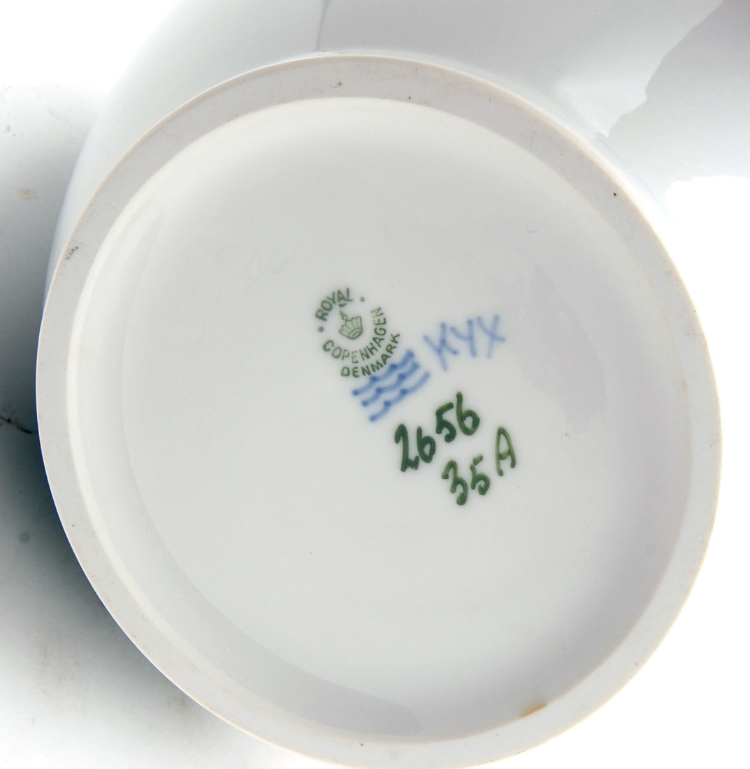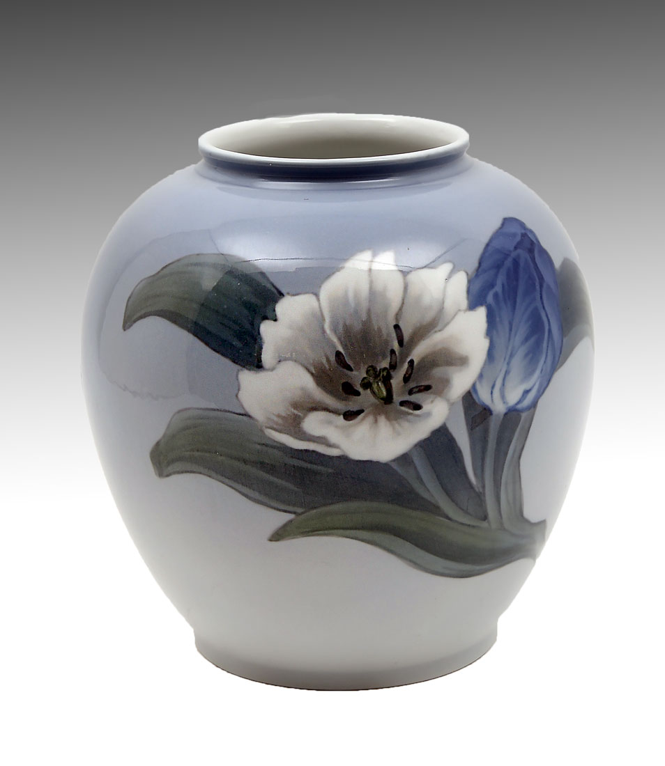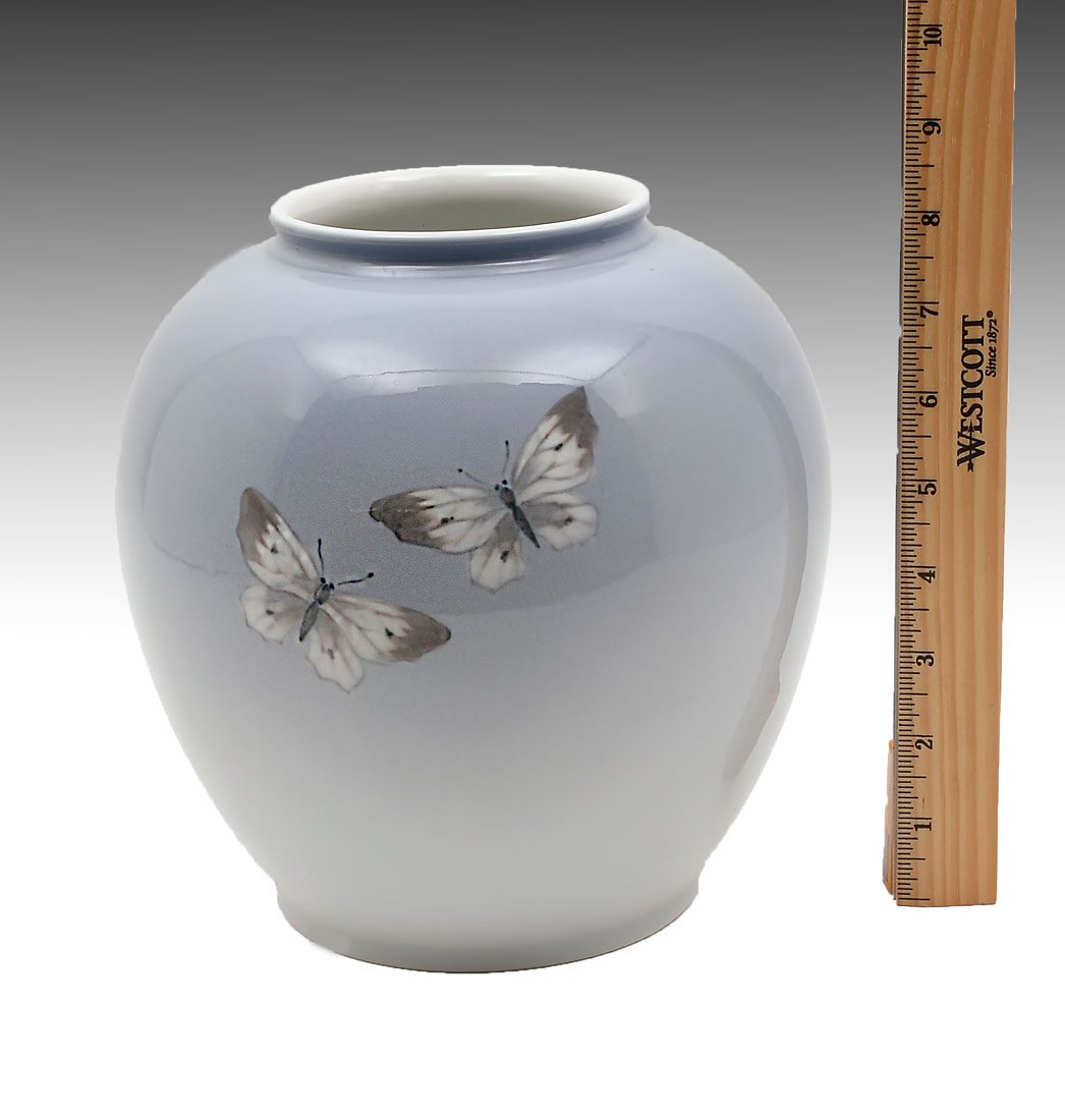 ROYAL COPENHAGEN FLOWER & BUTTERFLY VASE: Made in 1953 by Royal Copenhagen of Denmark. Hand painted flowers on front and butterflies on verso. Stamped bottom with line under the ''A'' in Royal. Approx. 8.25'' h x 8'' w.