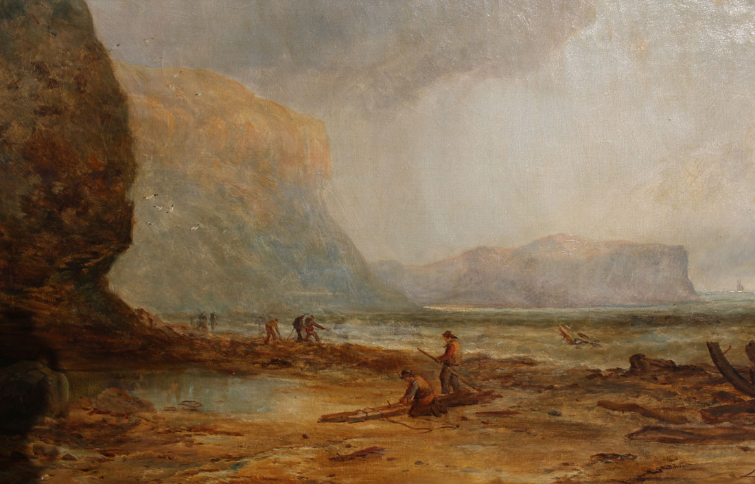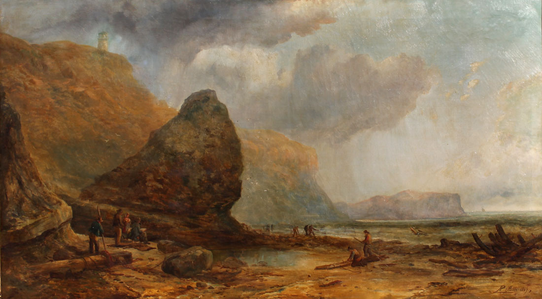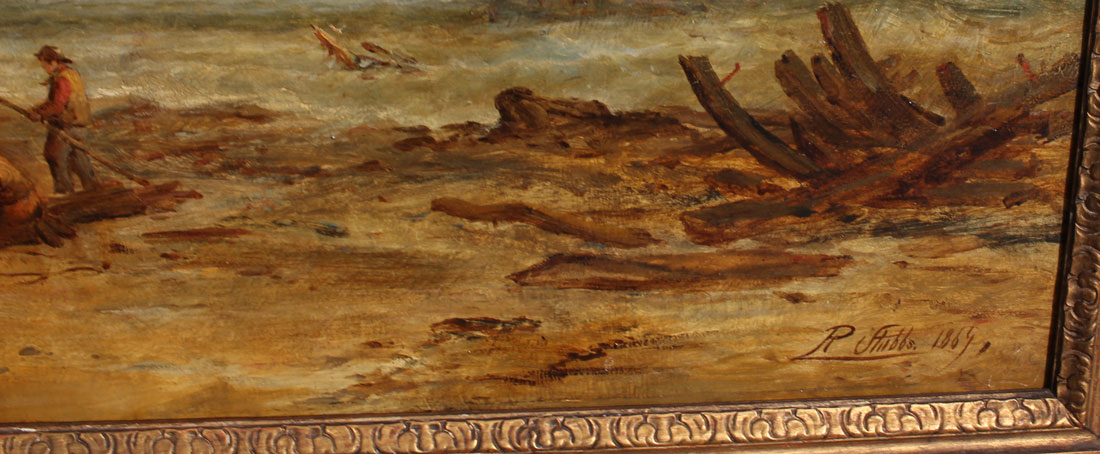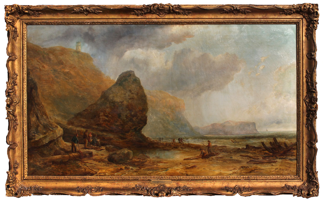 STUBBS, Ralph, (British, 1823-1879): Yorkshire Coast ''Figures Collecting Debris After the Storm'', Oil/Canvas, 30'' x 54'', signed lower right and dated 1869, pierced carved and gesso frame is 37'' x 60.50''.