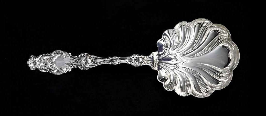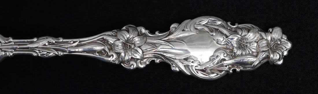 WHITING LILY STERLING SILVER SERVING SPOON: Whiting large fluted bowl serving spoon in the Lily pattern, 9''. Approx. 3.745 Troy ounces.