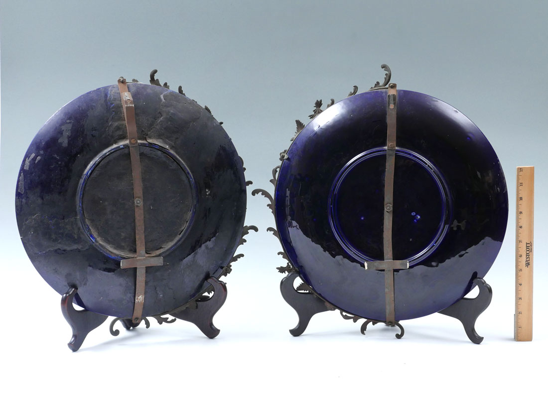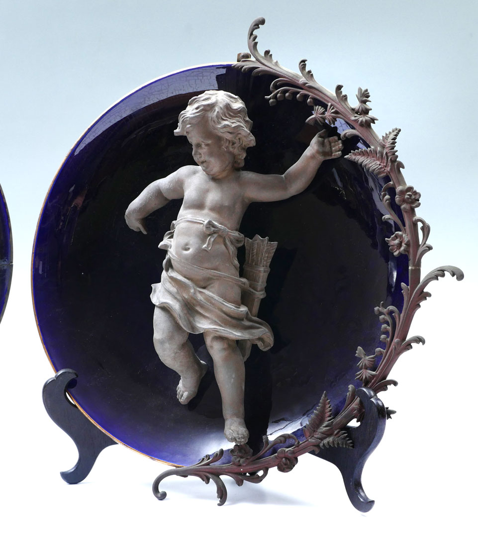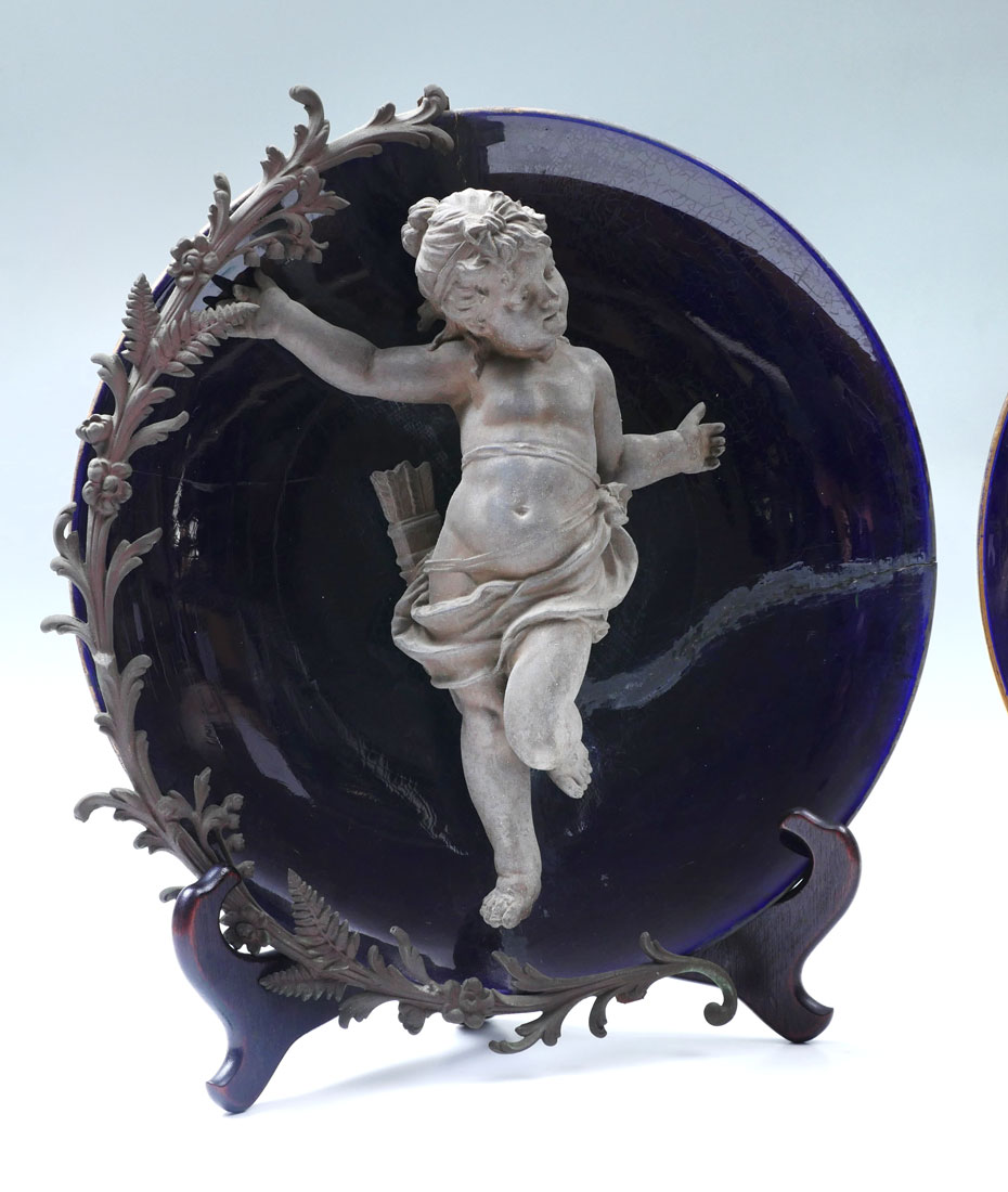 PAIR OF FRENCH CERAMIC CHARGERS WITH SPELTER PUTTI: 2 Large cobalt blue glazed French ceramic chargers with opposing male and female cupids made of spelter. Mounted through center of charger. Scrolling foliate spelter attached on one side of each. Approx. 18.75'' h x 18'' l x 4'' w.