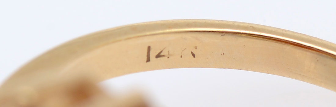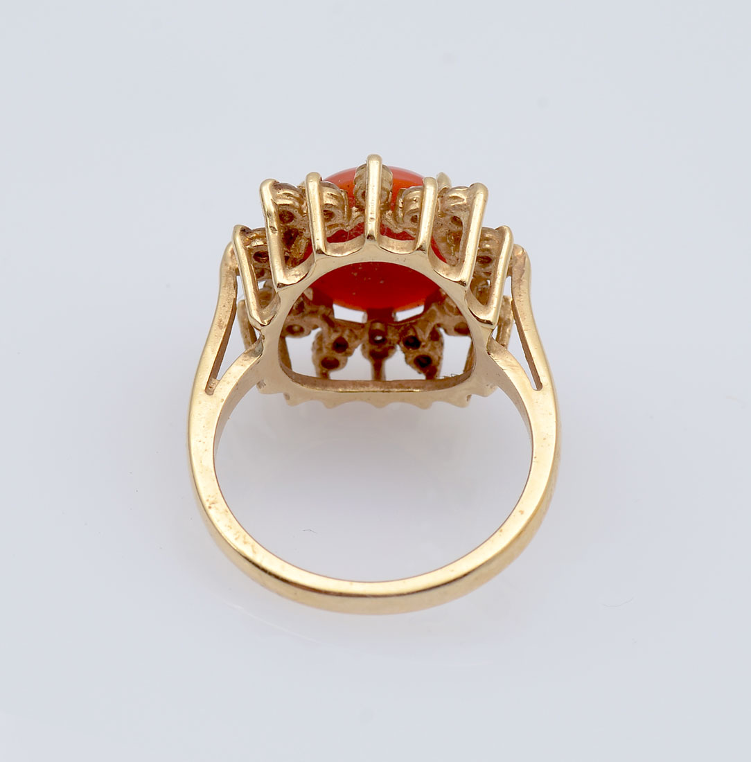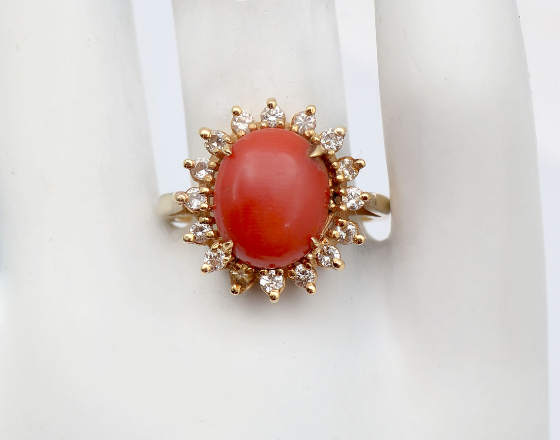 14K CORAL & DIAMOND RING: 14K yellow gold ring contains 16 round cut full cut diamonds. Weight: .50 Ct. Rated VS in clarity and H -I in color. One 16.00 x 12.00 mm cabochon piece of red coral. Weight: 5.3 grams Size: 7.5.