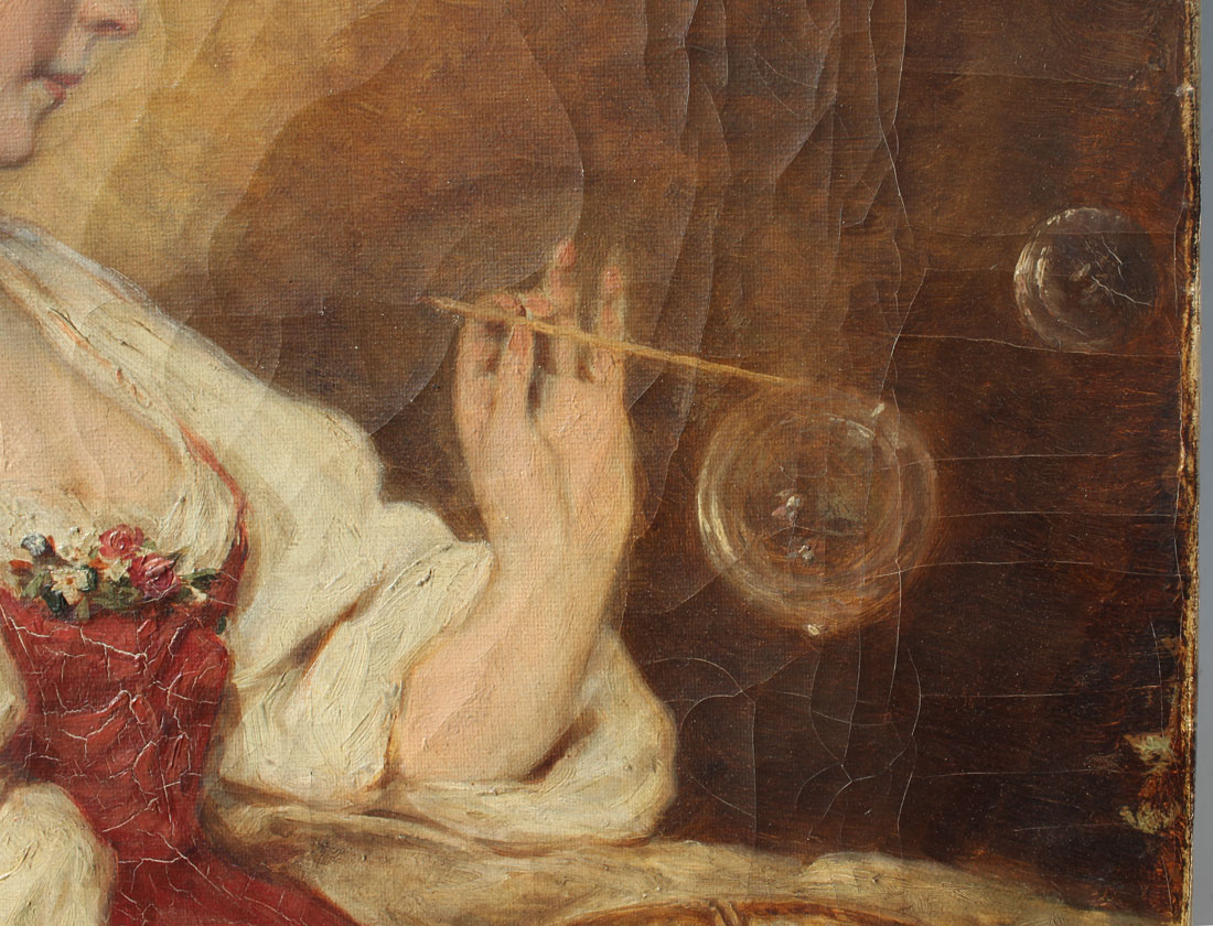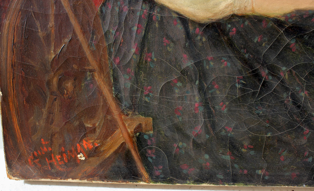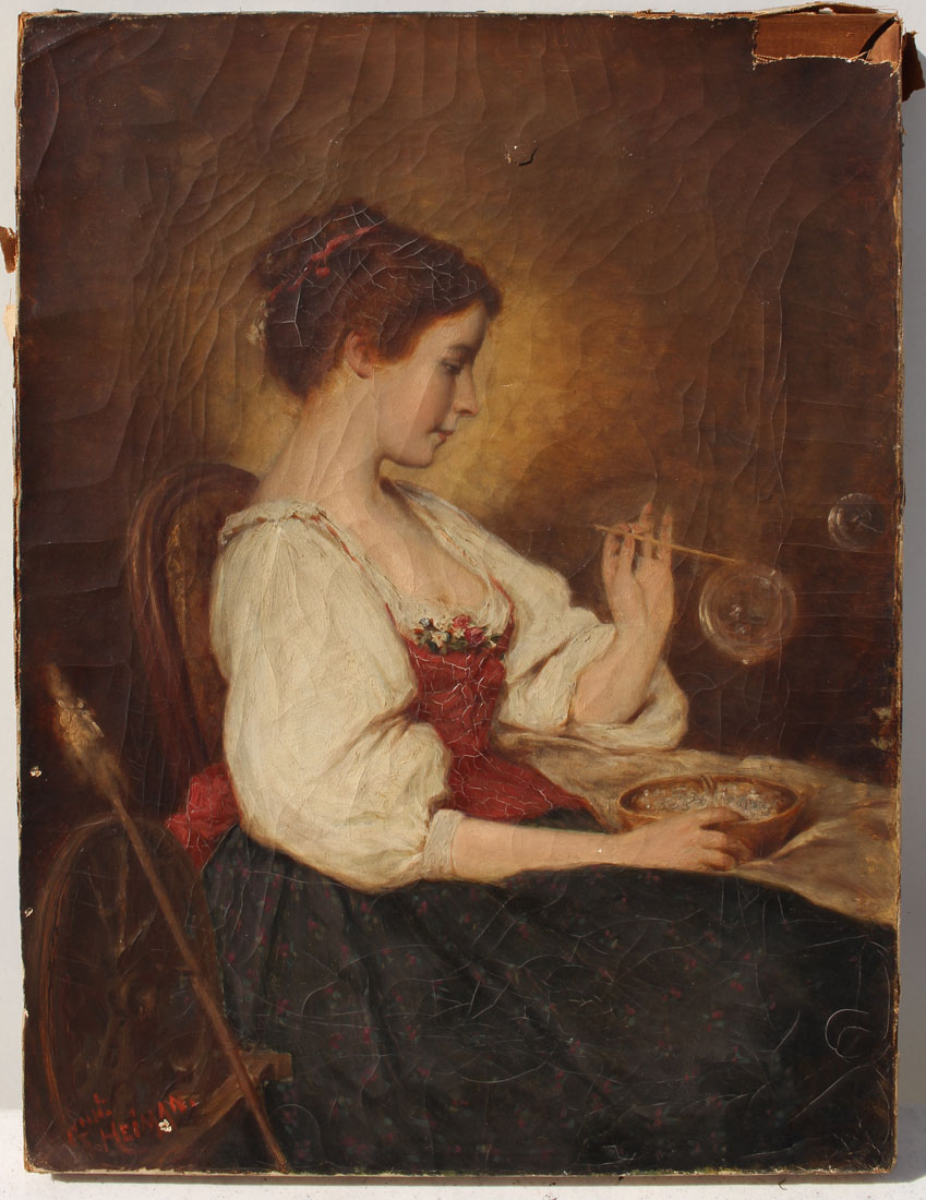 HEIMAN, Gustav, (German, 19th C.): Young Beauty Blowing Bubbles, Oil/Canvas, 16'' x 12'', signed lower left, period gilded liner, 21.5'' x 17.5''.