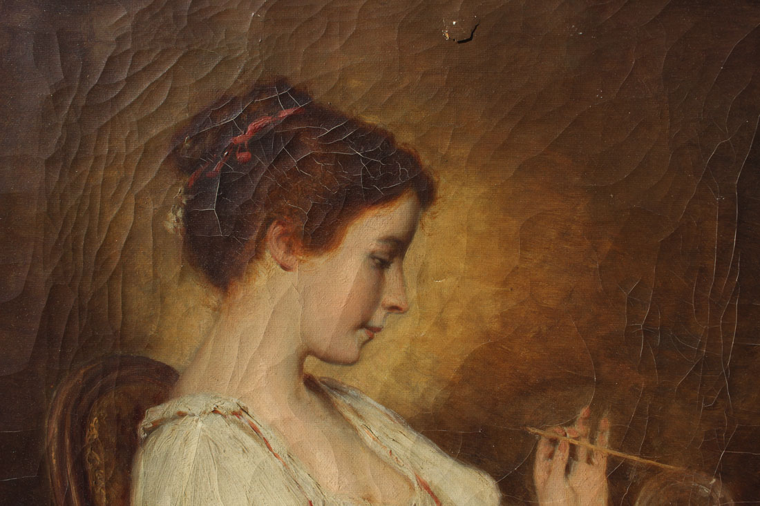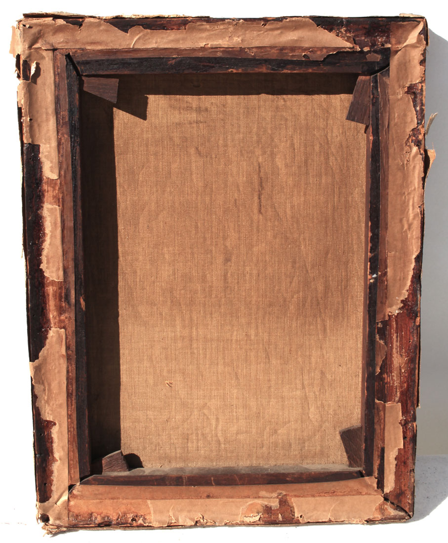 CONDITION: Craquelure throughout, missing canvas upper right, several small punctures, not firmly affixed to stretcher, canvas will need strip lining.