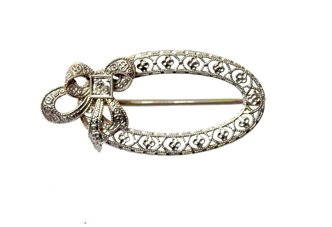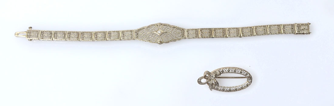 14K FILIGREE DIAMOND BRACELET AND PIN: 14K white gold filigree bracelet and pin contain 2 round full cut diamonds. WEIGHT: .10 Ct. Approx. Rated VS in clarity and H-I in color. The diamonds are prong set. Weight: 12.0 grams. Length: 7''