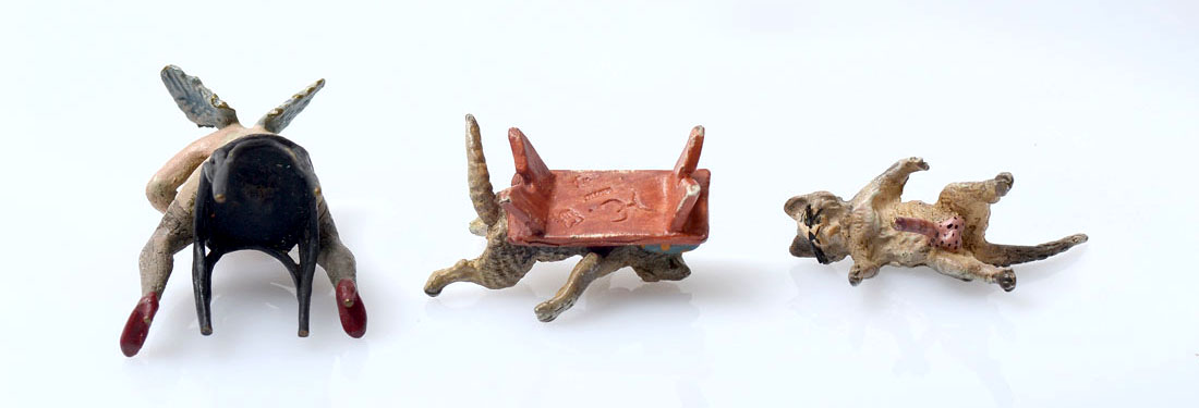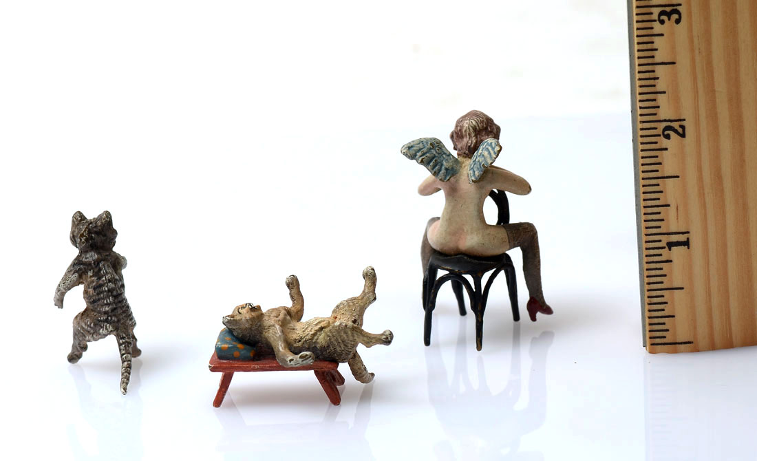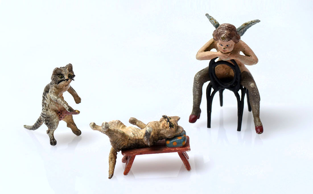 FRANZ BERGMAN EROTIC CATS AND SITTING NUDE ANGEL: 2 anatomically correct fornicating cats on a table. Cold painted bronze and marked underside. Nude angel sitting backwards in chair with chin resting on back support as if watching something. Cold painted bronze with a barely legible mark underside. Angel Approx. 2'' h x 1.75'' l x 1.25'' w. Cats Approx. 1.5'' h x 2.25'' l x 1'' w.