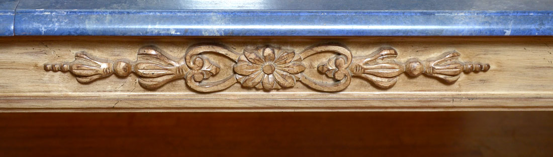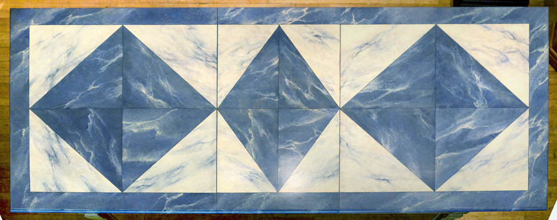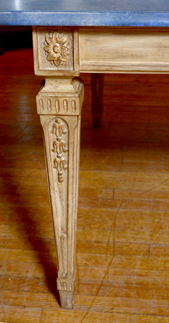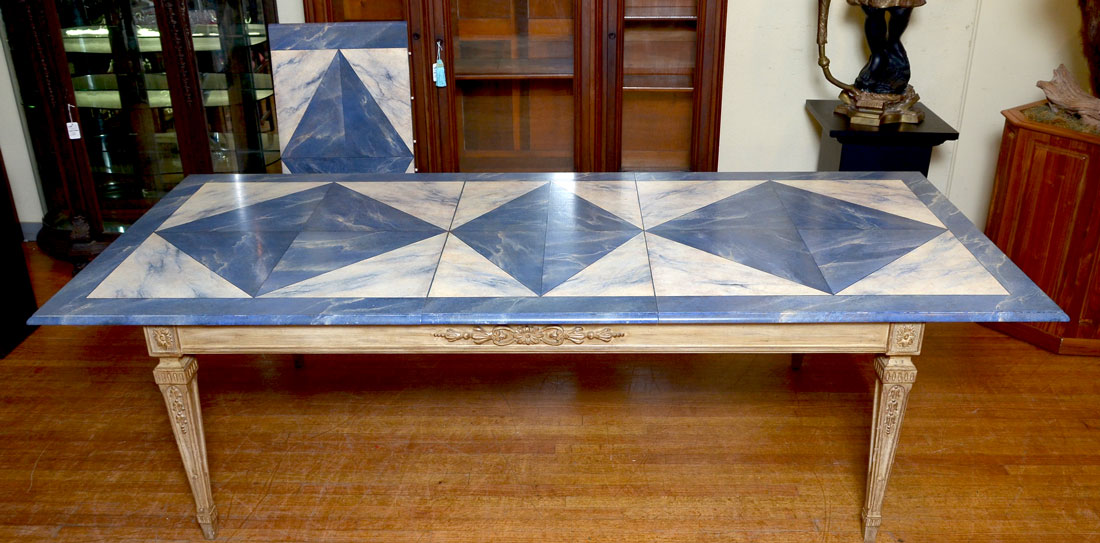 LOUIS SOLOMON FAUX MARBLE DINING TABLE WITH 2 LEAVES: This Louis Solomon, of New York, dining table has been skillfully painted to look like real marble. Painted with blue faux diamonds painted in center with white faux marble triangles painted between. Blue marble painted border. Antique style French base and legs. Tapered legs carved with medallions at top on each corner. Includes 2 leaves that are Approx. 23.5'' l x 46.25'' w. Approx. 30.5'' h x 82'' l x 46.25'' w.
