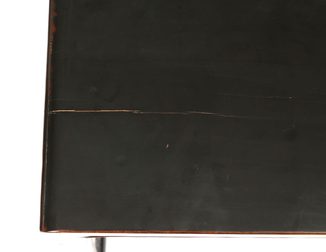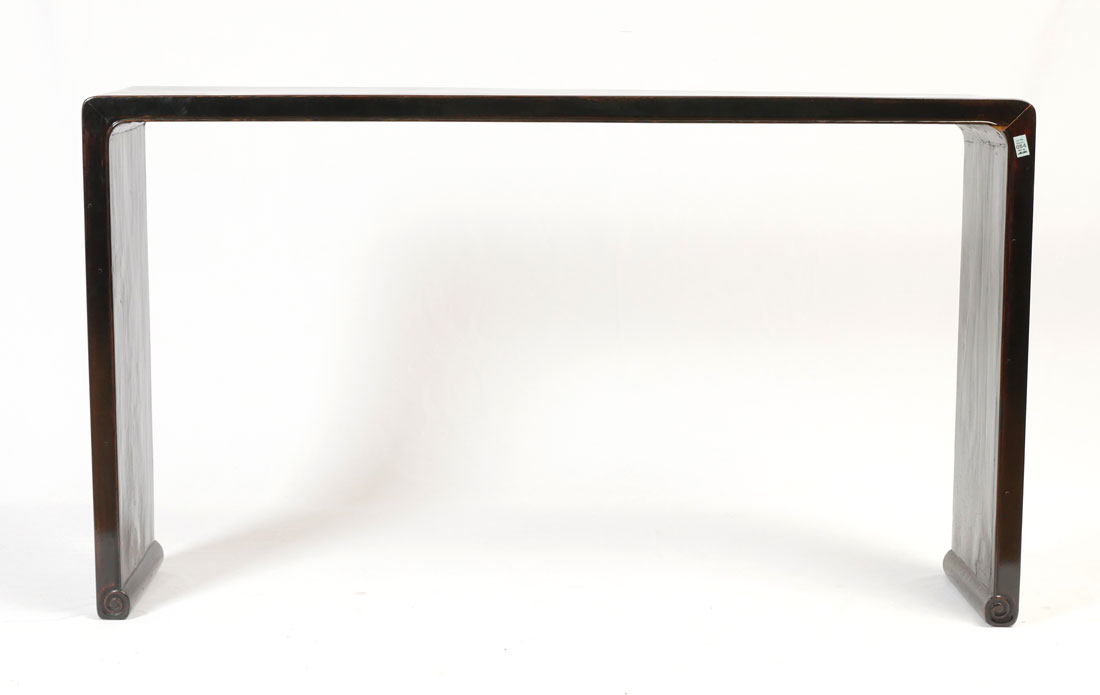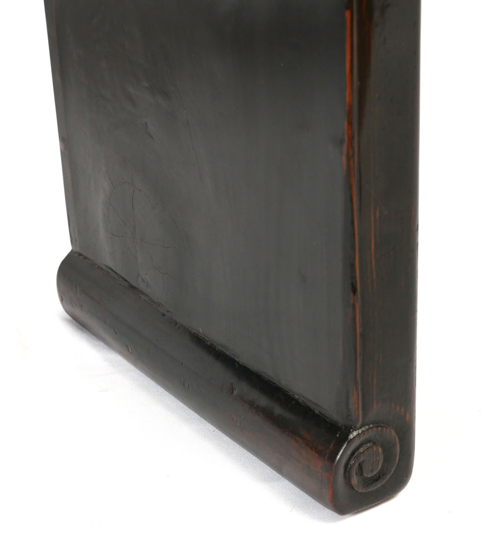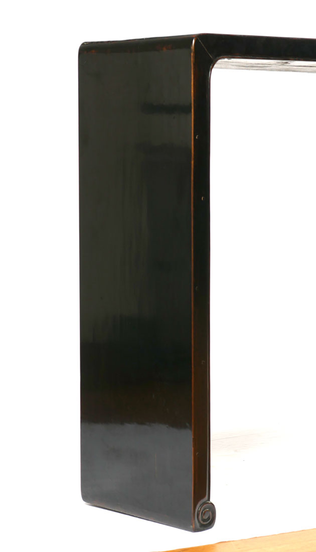 QING DYNASTY BLACK LACQUERED LUTE TABLE: This less common Chinese Lute table was generally used by calligraphers. Elm with a black lacquer finish and incised border on face and verso and carved scroll feet. Purchased from Hollywood Road in Hong Kong, China. Approx. 33'' h x 58'' l x 11.75'' w.