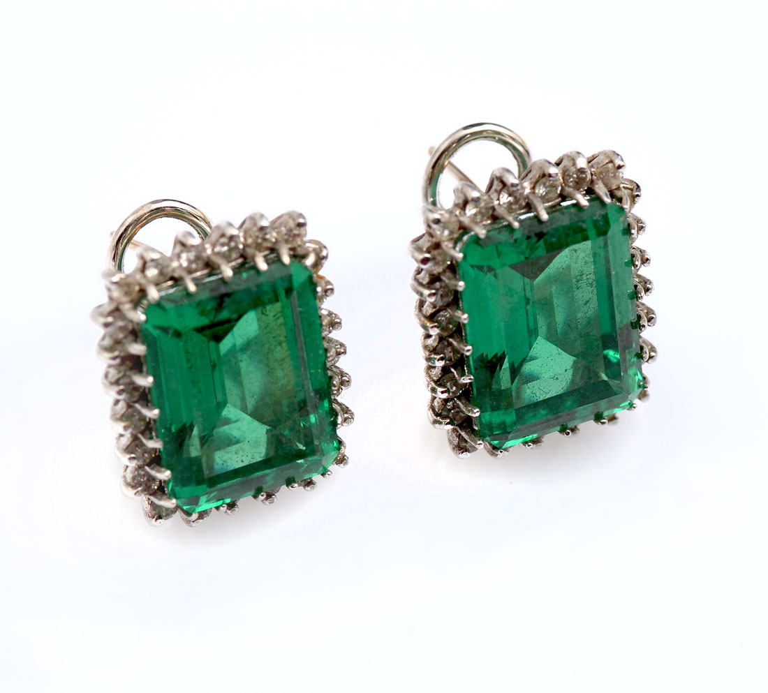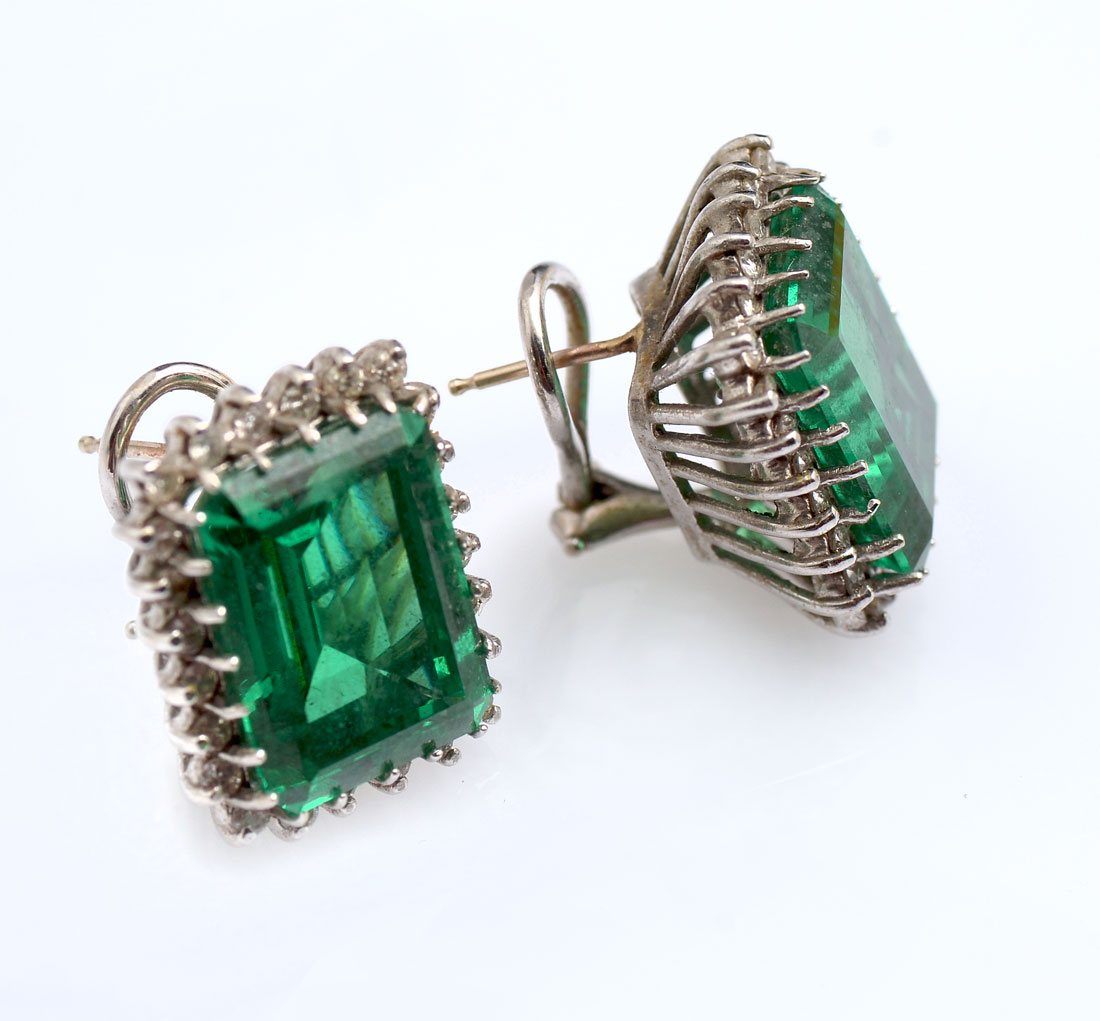 14K DIAMOND & GREEN STONE EARRINGS: 14K white gold earrings contains 48 round full cut diamonds. WEIGHT: 1.50 Ct. Approx. Rated SI-I1 in clarity and H-I in color. Two 17.00 x 13.00 emerald cut synthetic green spinel. Post and nut closures. Gold Weight: 16.2 grams.