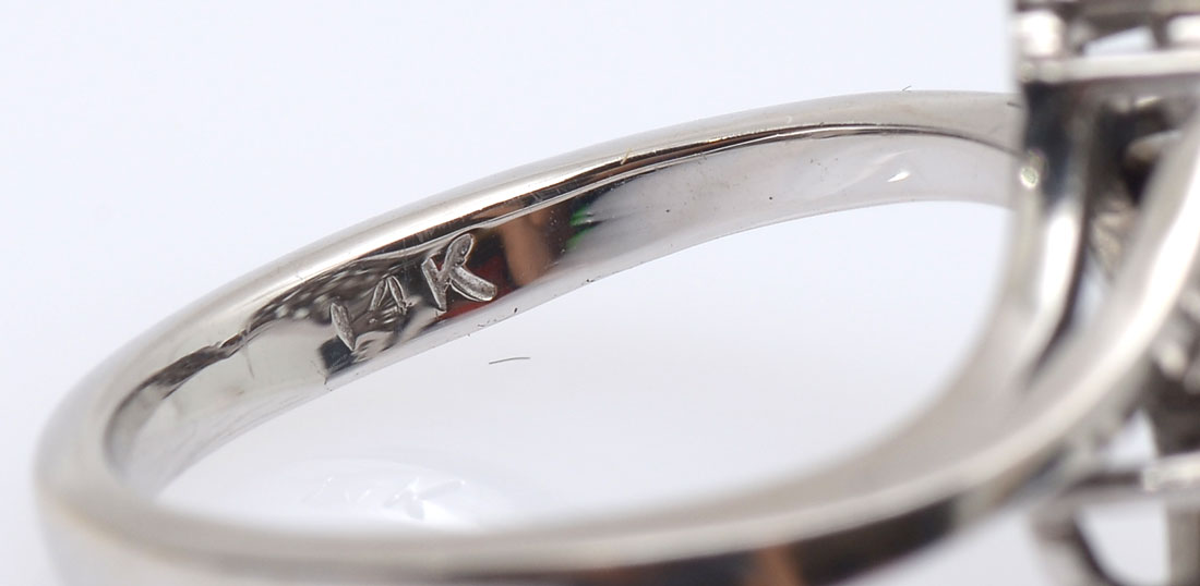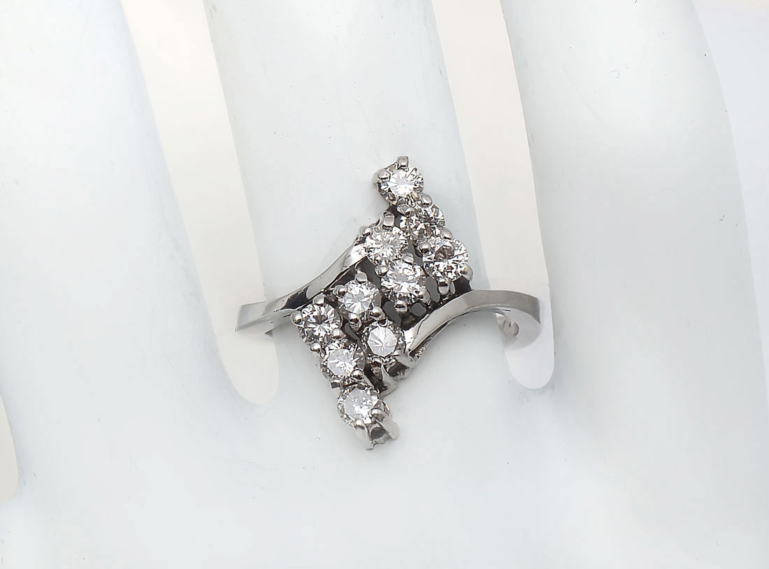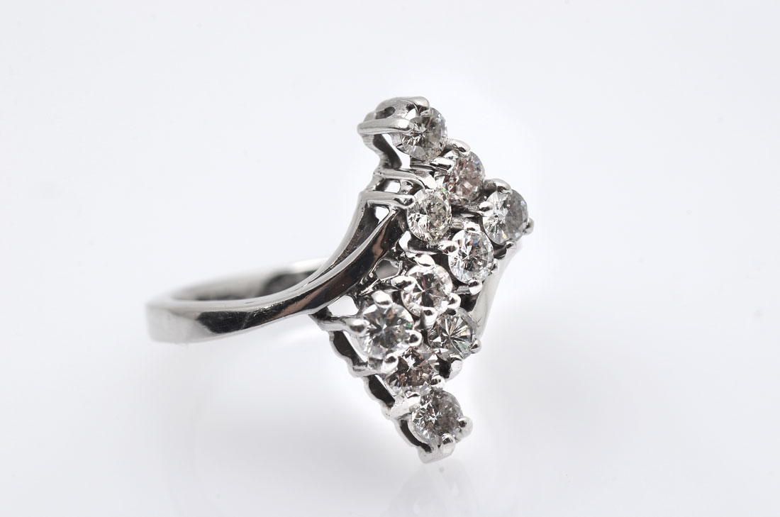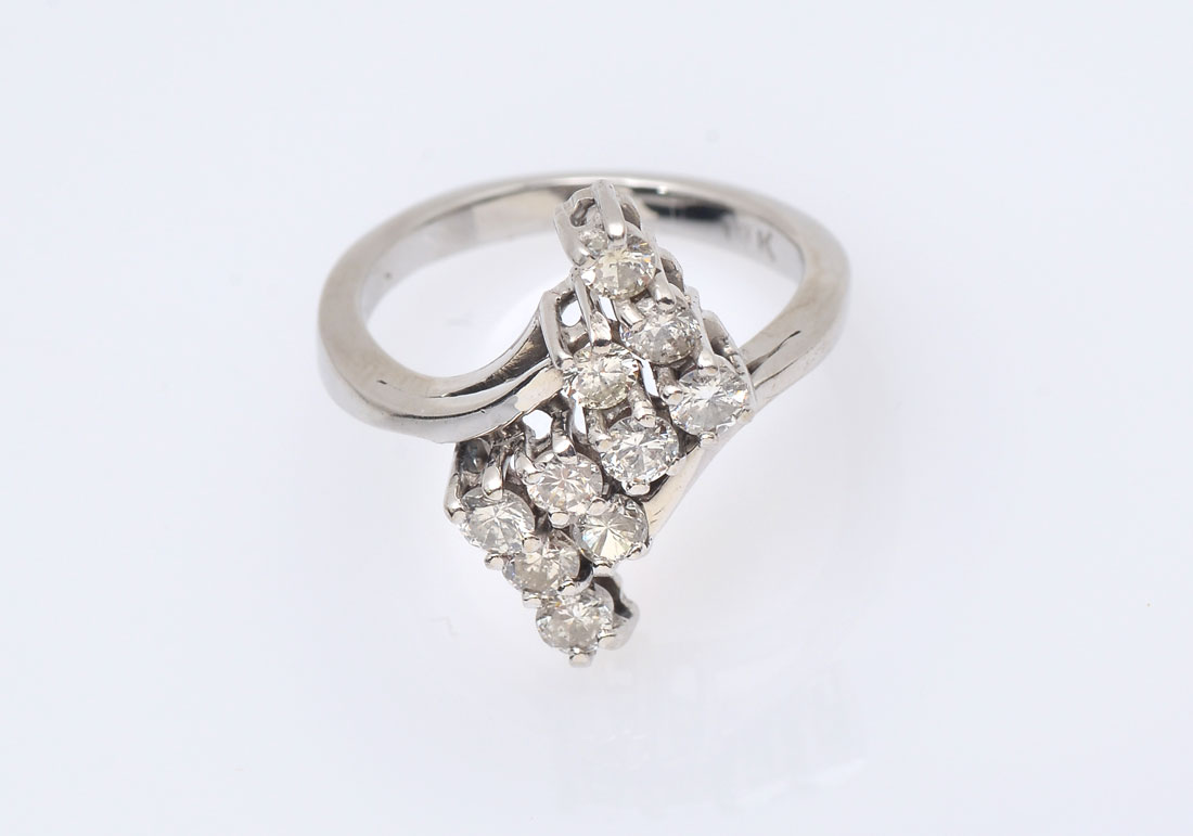 14K .85 CTW DIAMOND RING: 14K white gold ring contains 10 round full cut diamonds. WEIGHT: .85 Ct. Approx. Rated VS in clarity and G-H in color. The diamonds are prong set. Weight: 3.8 grams. Size: 6