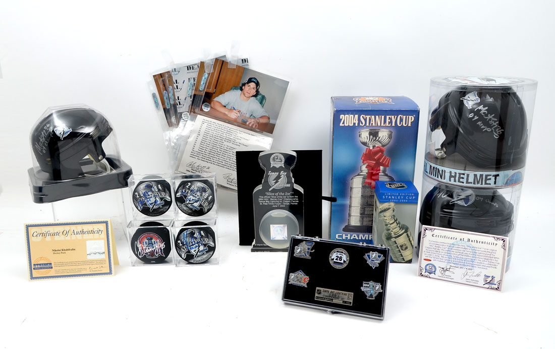 TAMPA BAY LIGHTNING STANLEY CUP CHAMPION MERCHANDISE COLLECTION: To include; 3 autographed NHL mini helmets with COA's (2 Martin St. Louis & 1 Vincent Lecavalier), 1 Limited edition 2005-2006 mini Stanley cup, 1 2004 champions Stanley cup given to season ticket holders, 1 acrylic plaque 2004 with ''slice of ice'' #111/4000 from the championship with COA, 1 2004 championship set of 5 pins in case #244/300, and 4 autographed 2004 championship pucks (2 Martin St Louis, 1 Vincent Lacavalier, 1 Nikolai Khabibulin.