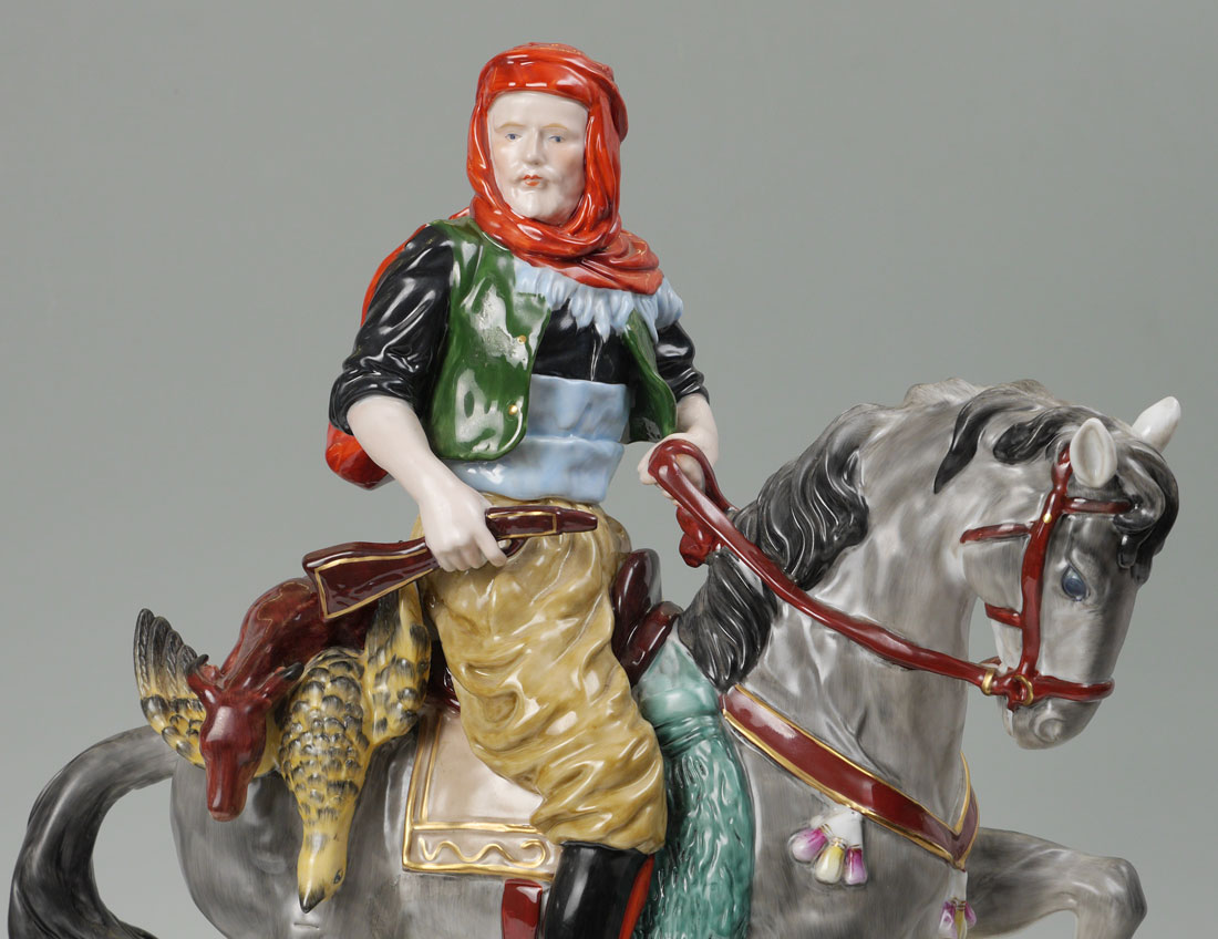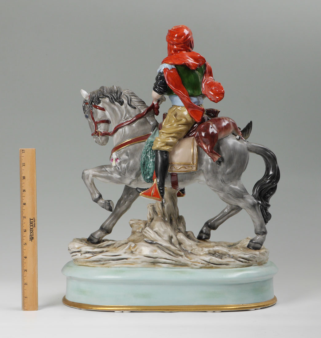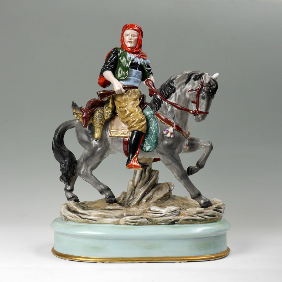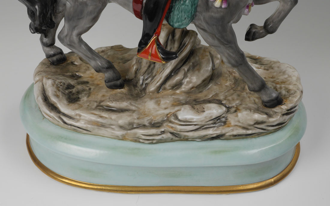 LARGE GERMAN PORCELAIN HUNTER FIGURAL GROUP: Large figure of a hunter on a horse with deer and bird slung over back of horse. Marked with 20th century crown over S on base, overall measures 21 3/4'' h. x 17 1/2'' x 10 1/4''.