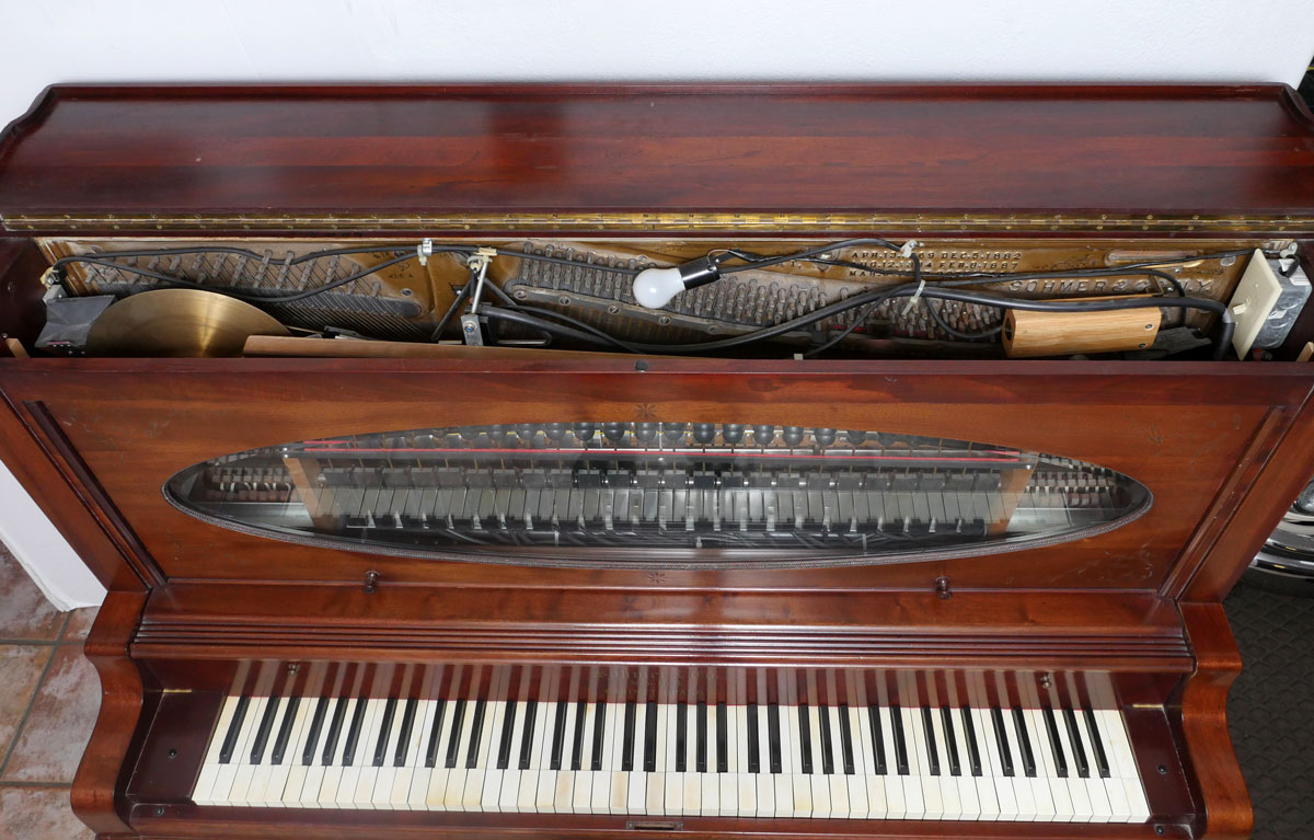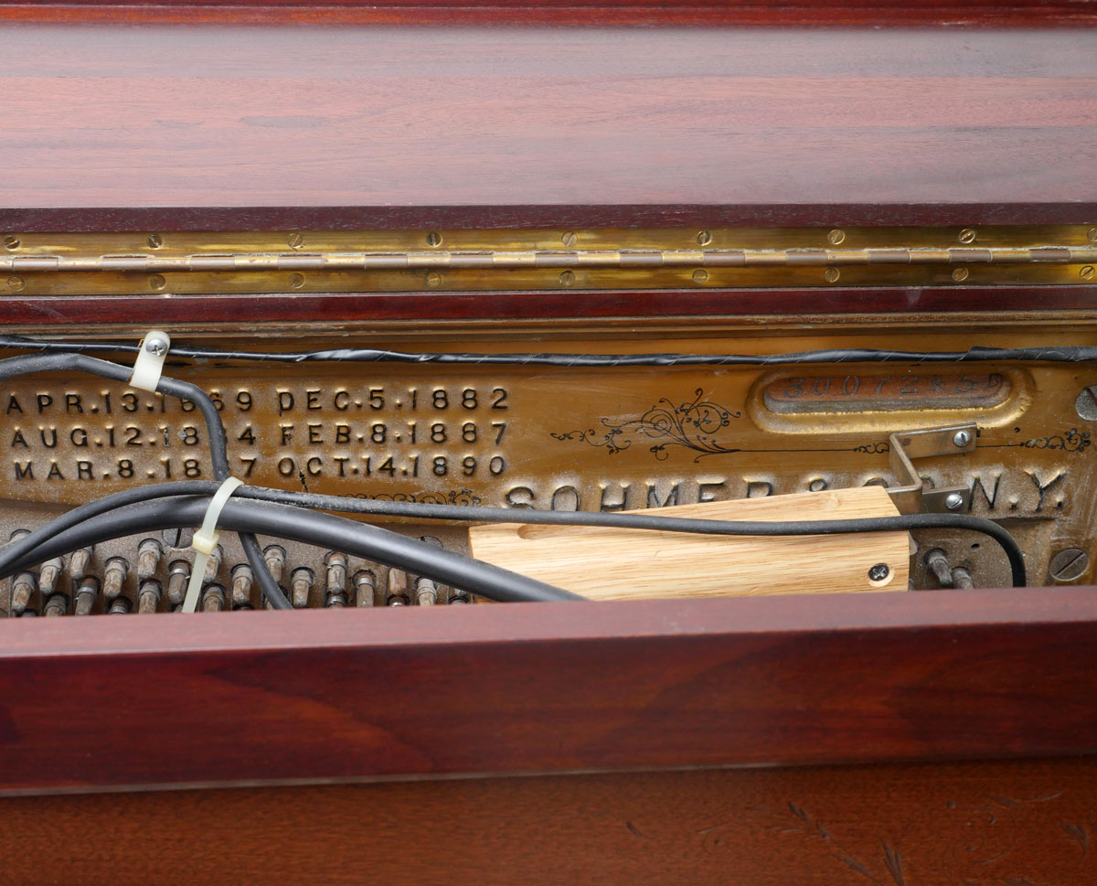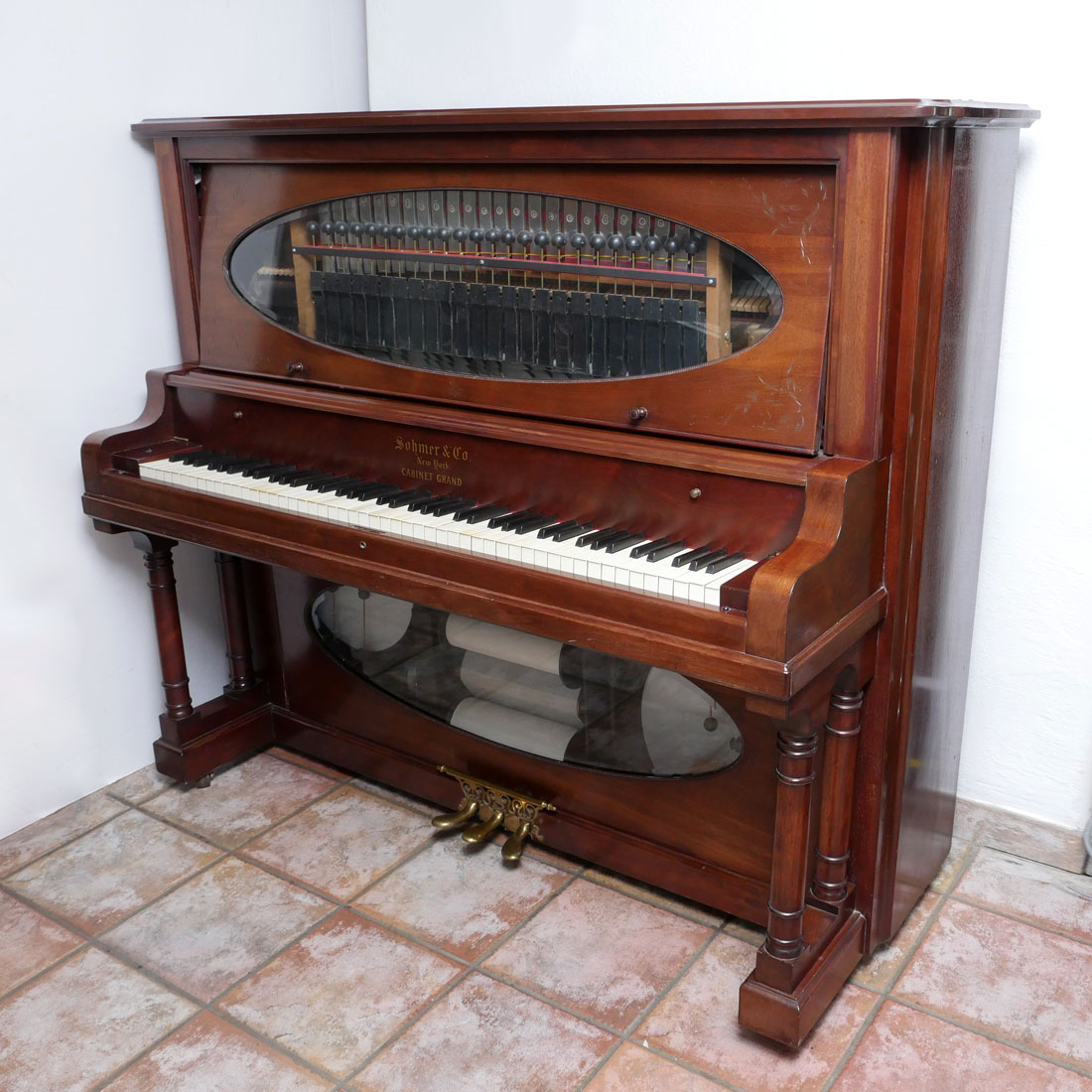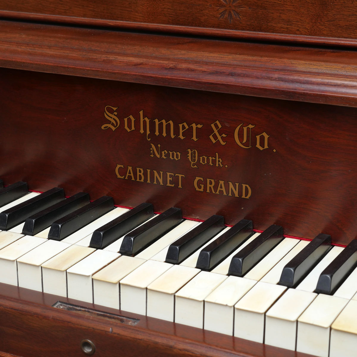 SOHMER & CO., N.Y. CABINET GRAND PLAYER PIANO: This Sohmer & Co. uptight Cabinet Grand piano has 1 beveled oval glass under the keys, which exposes the 2 drums and tambourine, another beveled glass above the keys that exposes the xylophone, symbol, and timber drum. The top compartment lights up. Empire style construction with subtly carved scrolling and stylized flowers. Also includes 5 extra player rolls. Approx. 54'' h x 63'' l x 28'' w.