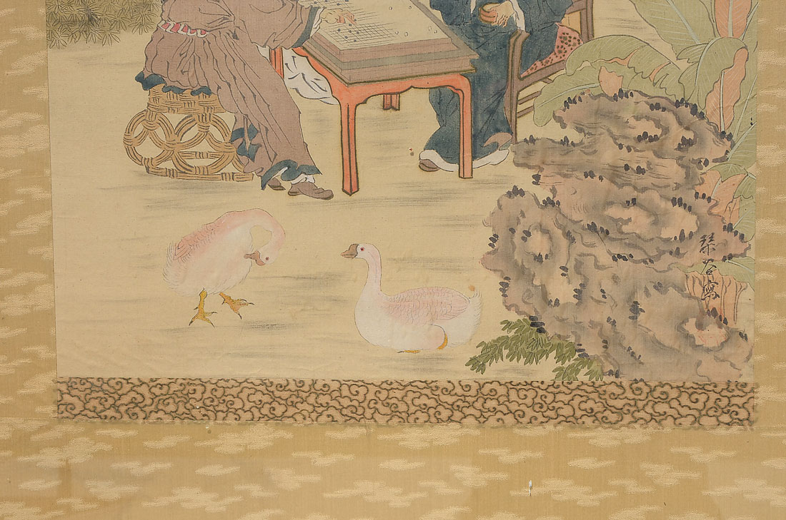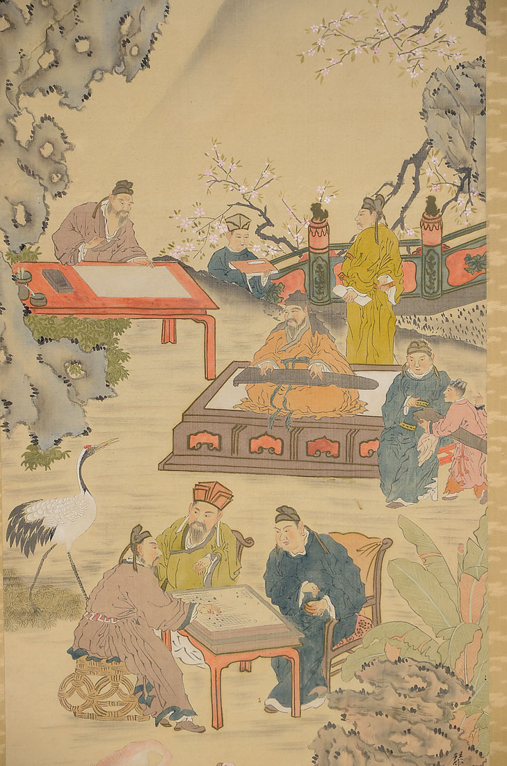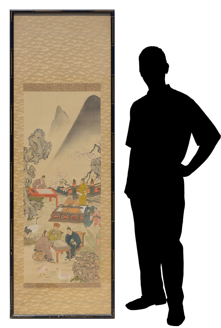 LARGE JAPANESE WATERCOLOR SCHOOL PAINTING: Scene Depicts Scholars at Work and Play in the Shadow of Mountains, Watercolor/Silk, image size is 48'' x 19'', framed 77.50'' x 26''.