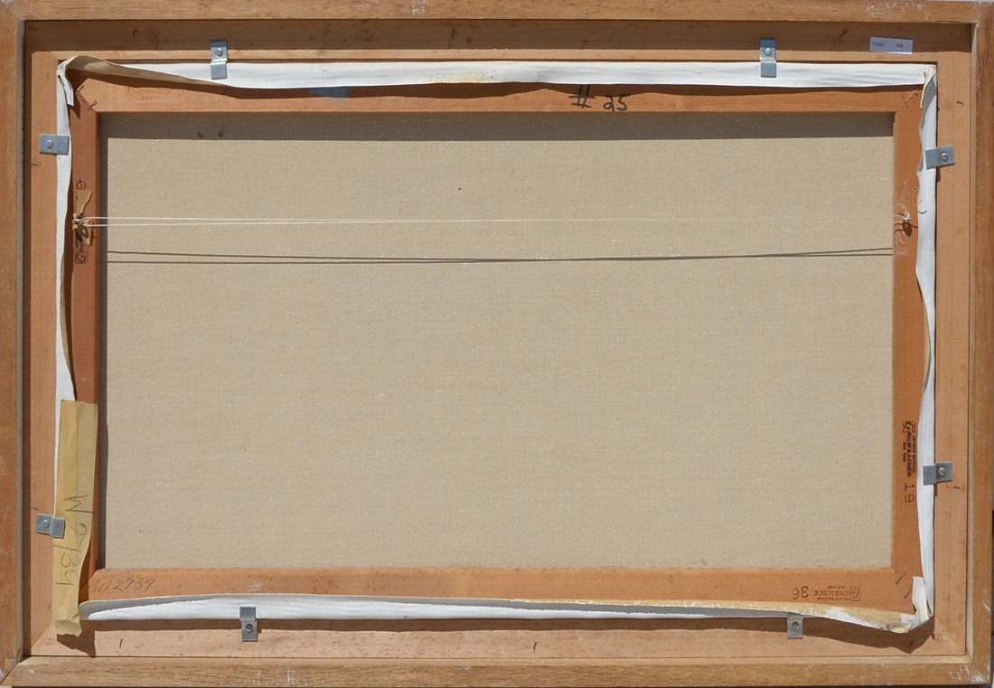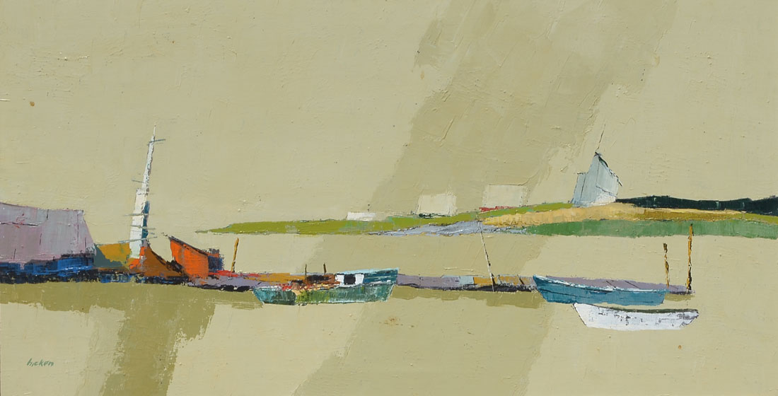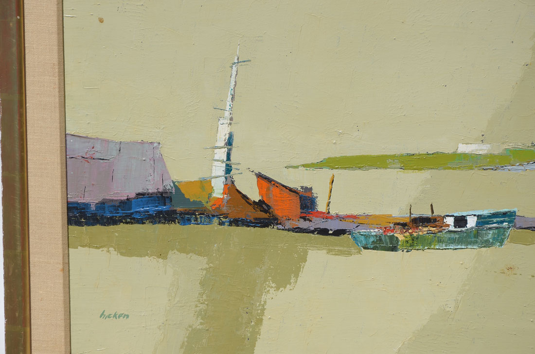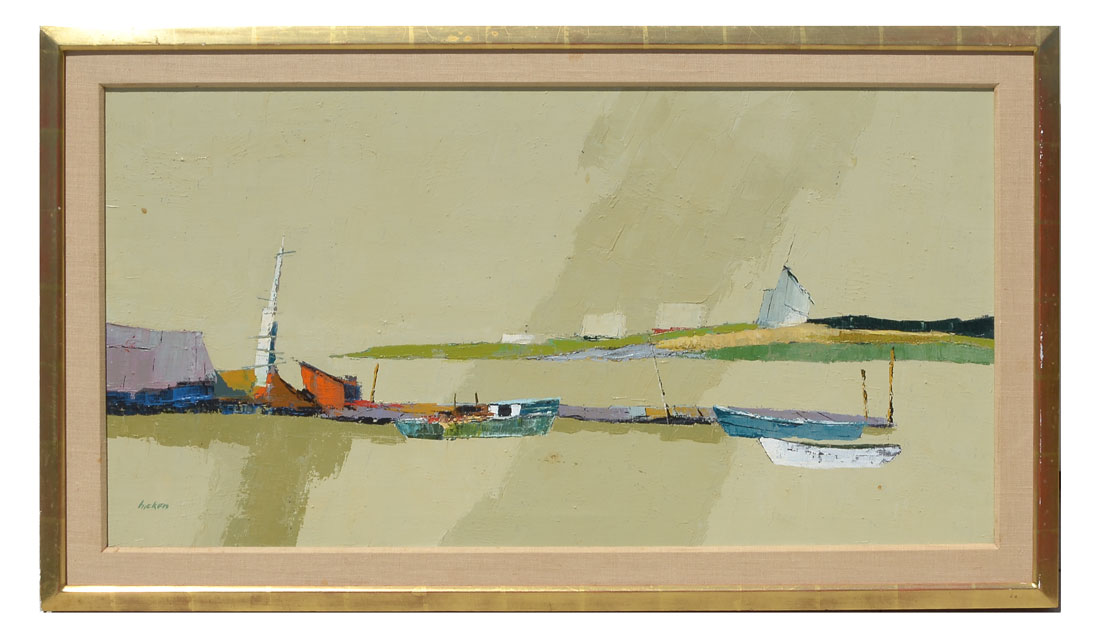 HICKEN, Philip, (American, 1910-1985): ''Headland'', Modernist Harbor Scene Painting, Acrylic/Canvas, 19'' x 36'', signed lower left, framed 23.50'' x 40.50''.
