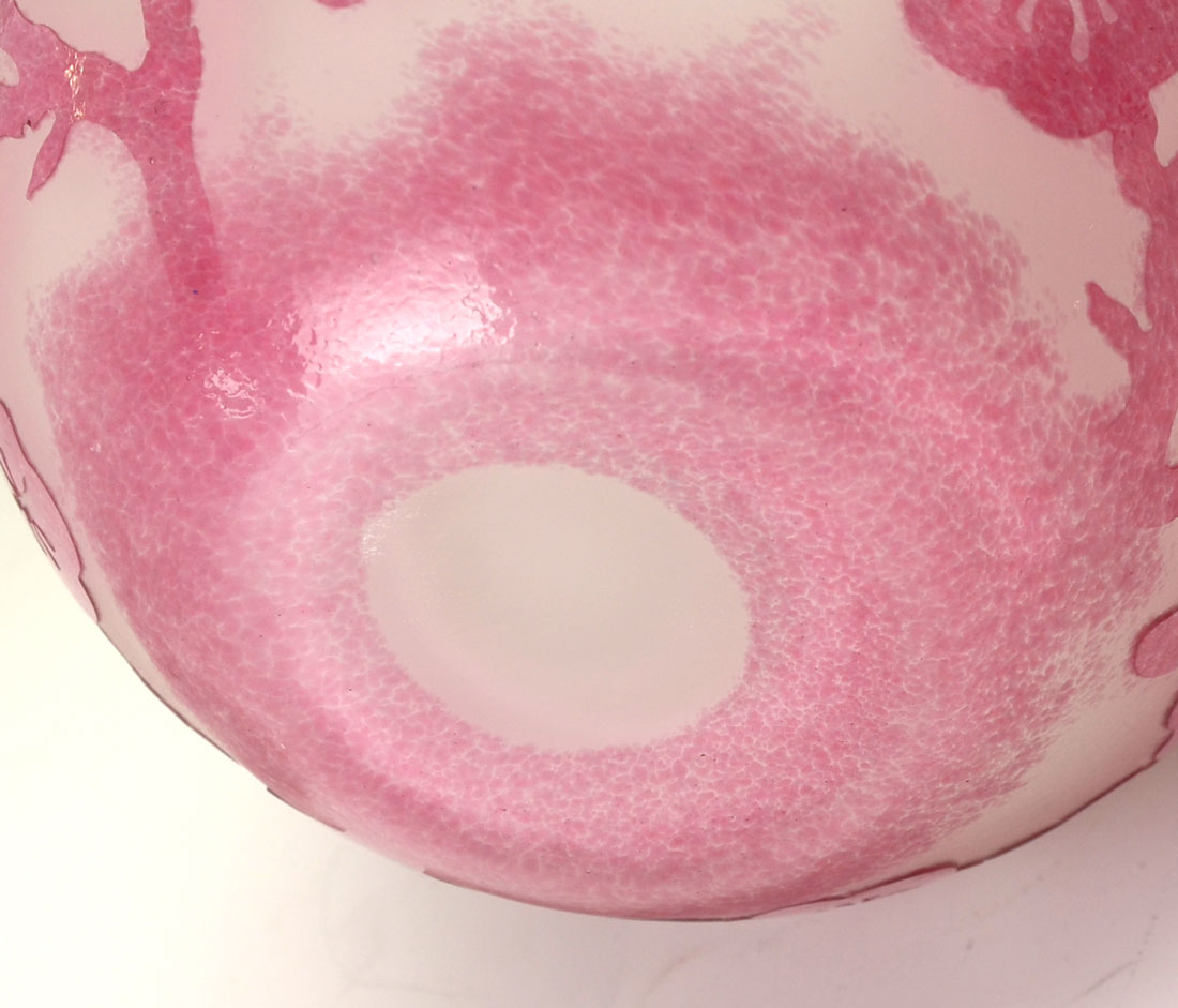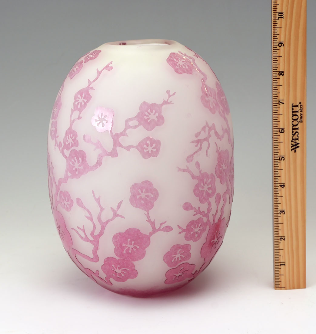 STEUBEN CARDER PINK & WHITE ROSALINE VASE: This Steuben Carder vase was accomplished through acid cutback technique. Pink flower and foliate design on white cased clear. Approx. 9'' h x 6.75'' w.