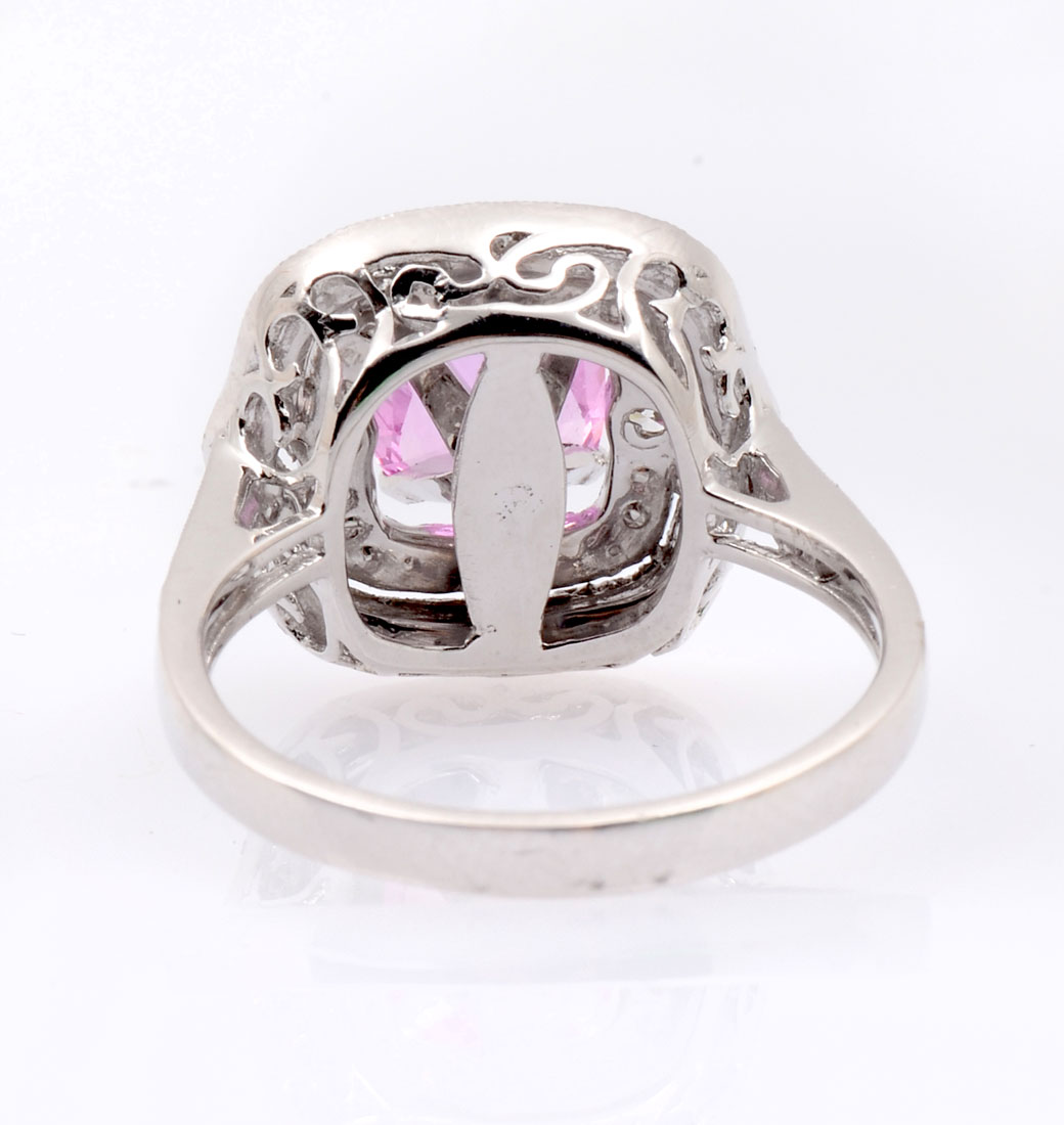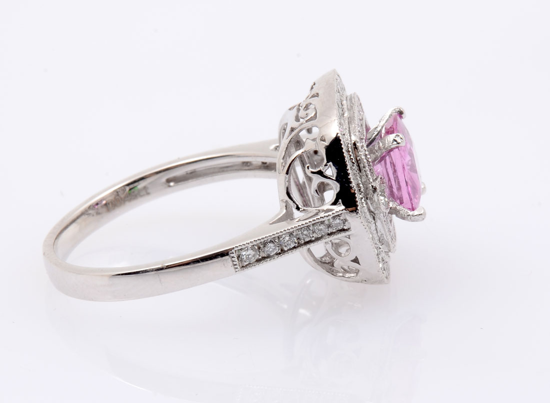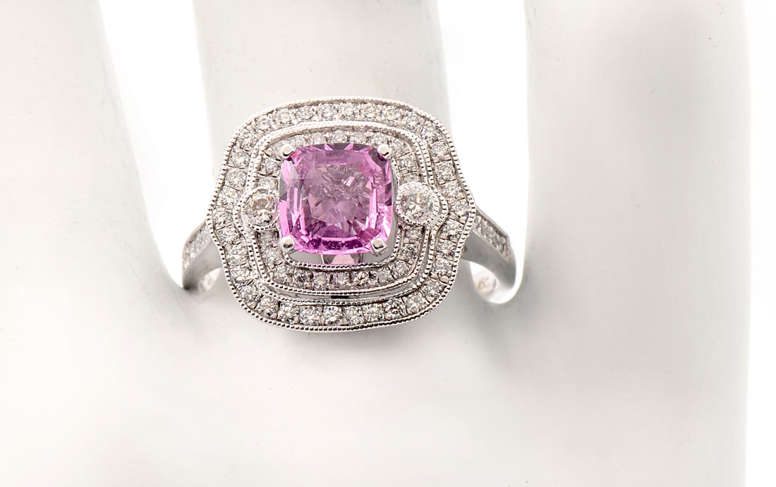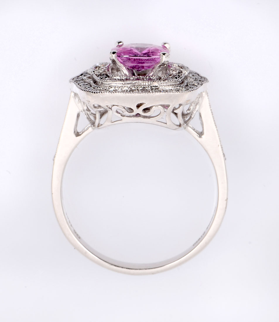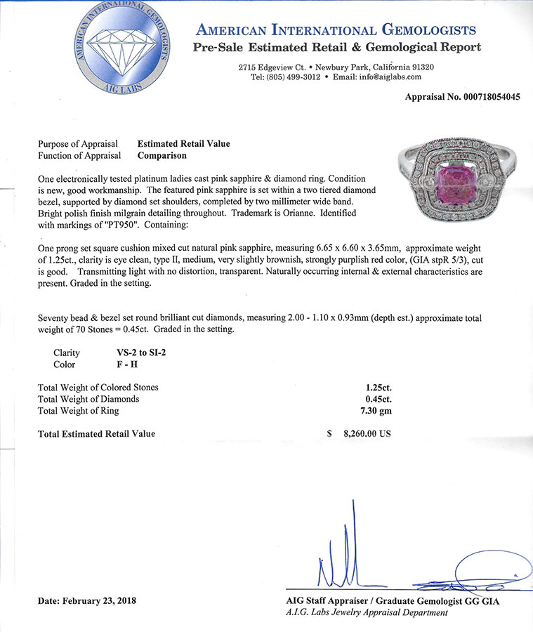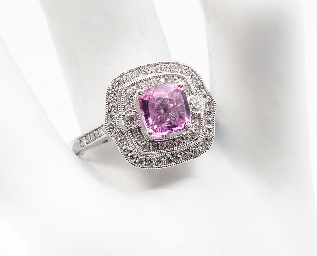 PLATINUM PINK SAPPHIRE & DIAMOND RING: 1.25 CT cushion mixed cut natural pink sapphire is featured within a 2-tiered diamond bezel supported by diamond shoulders. 70 bead and bezel set round brilliant cut diamonds approx .45 CTW are graded VS2 - SI2 in clarity and F-H in color. Weight approx 7.30 grams. Sold with current American International Gemologists appraisal for $8260.