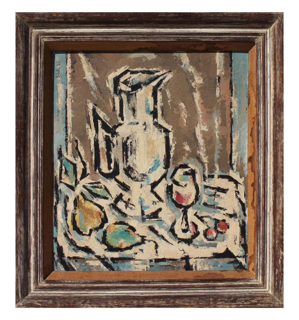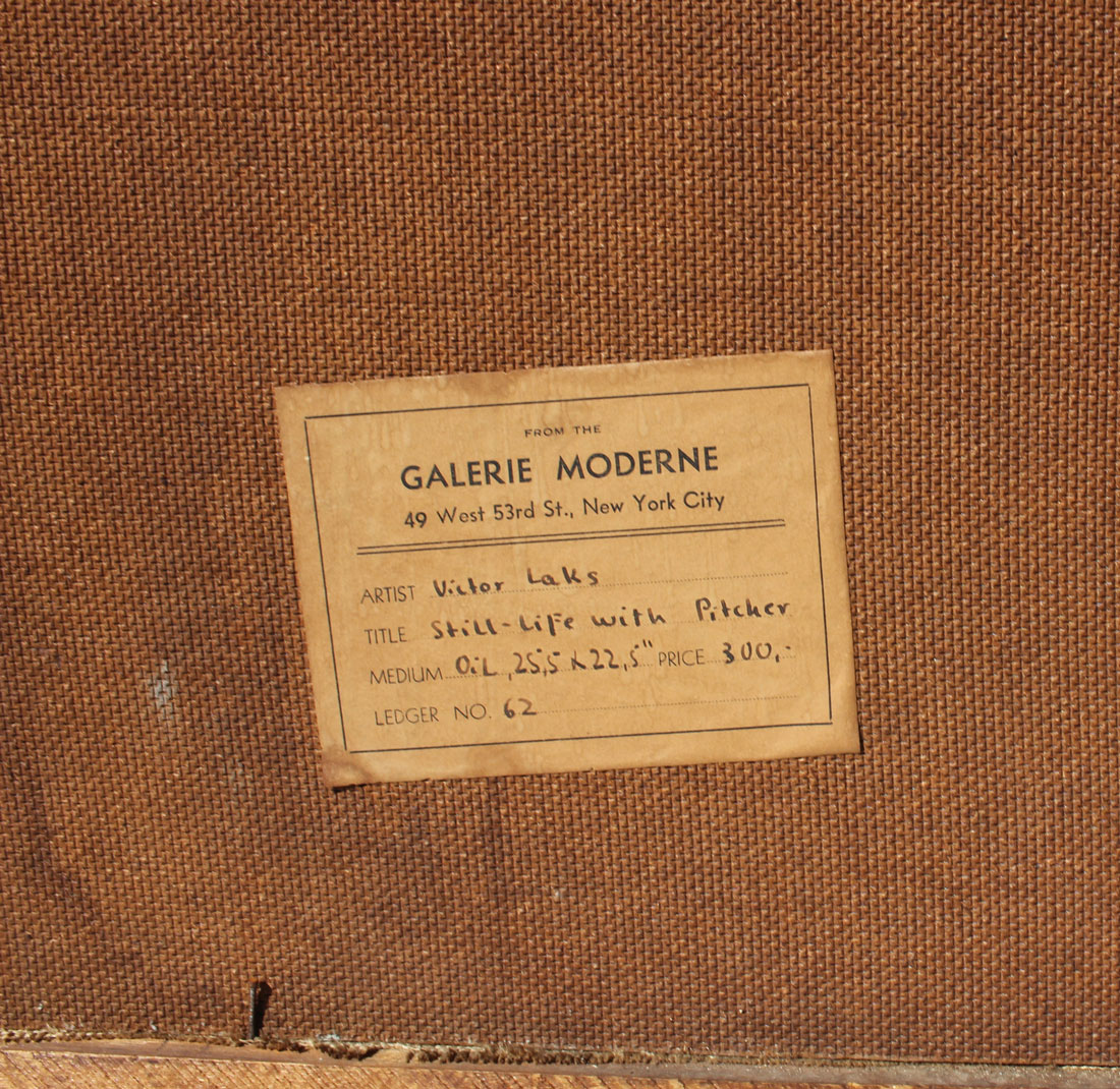 LAKS, Victor, (French, 1924-2011): Still Life with Pitcher, Oil/Masonite, 24'' x 21'', signed upper left and dated '53, Galerie Moderne label affixed verso, distressed frame is 30.50'' x 27''.