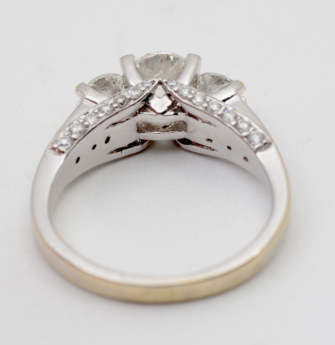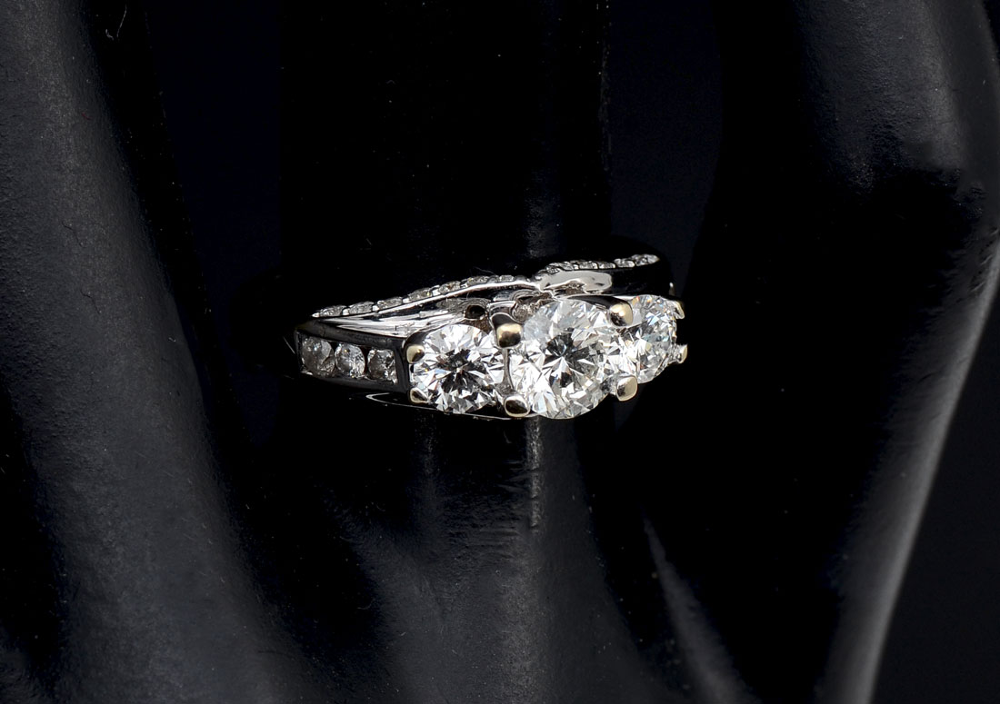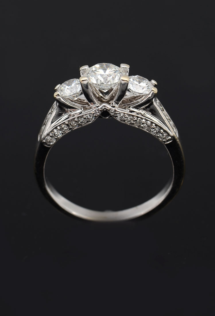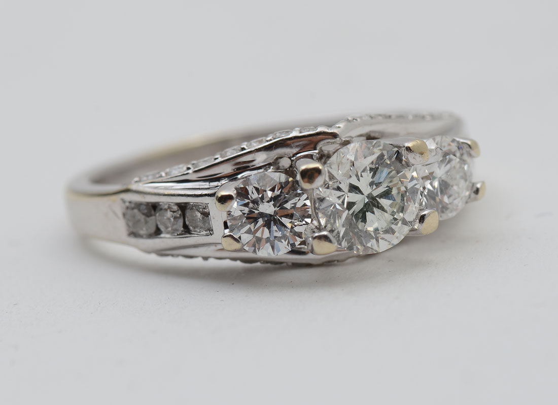 14K 1.50 CTW DIAMOND RING: Beautifully designed 14K white gold ring contains 3 round brilliant cut diamonds. WEIGHT: 1.00 Ct. Approx. Rated SI1 in clarity and G-H in color. 34 round brilliant cut diamonds down the shoulders and in the gallery. WEIGHT: .50 Ct. Approx. Rated SI in clarity and G-H in color. The diamonds are prong set. Weight: 5.1 grams. Size: 5.5