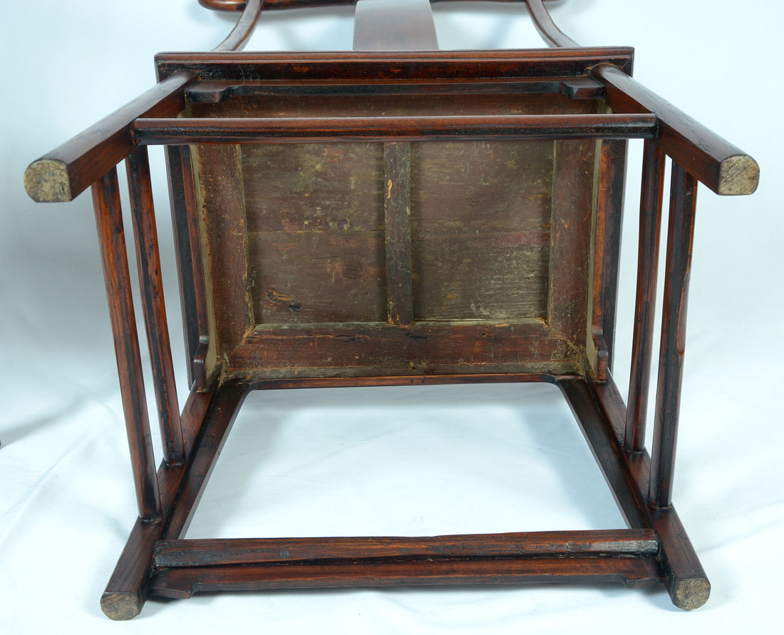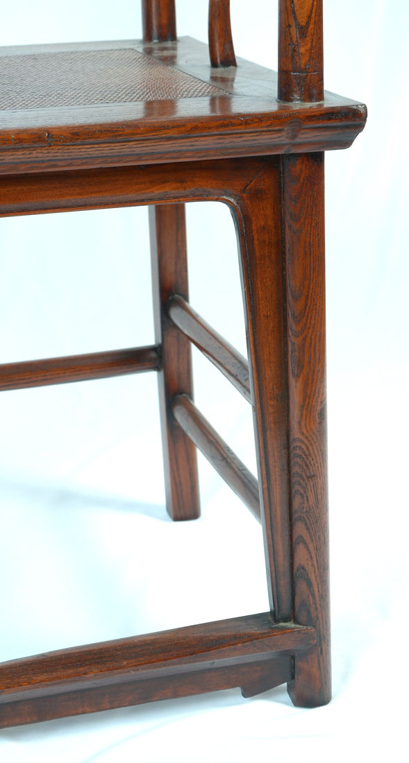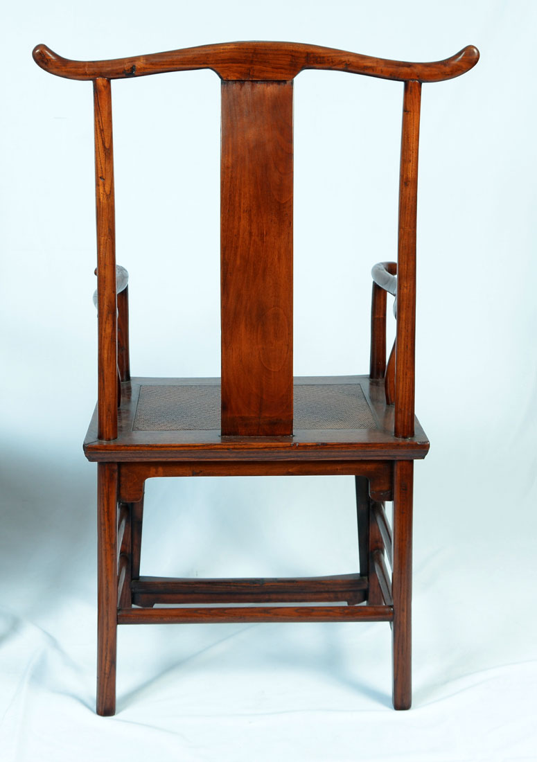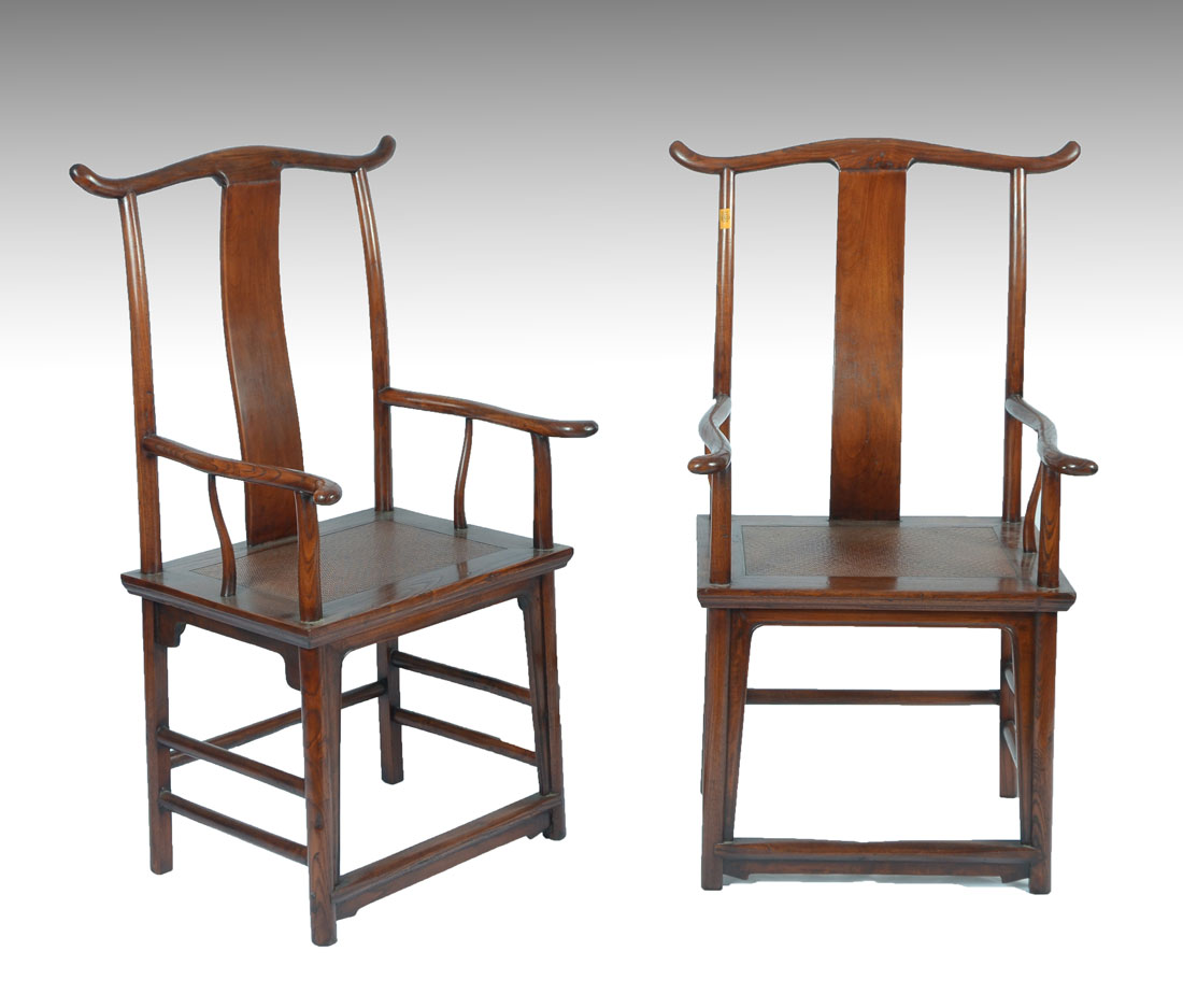 PAIR OF CHINESE CARVED ELMWOOD QING DYNASTY CHAIRS: 2 exquisitely hand crafted Chinese Qing dynasty Elmwood armchairs with serpentine back supports. Solid wood construction with mortised jointing. The seat area is Extremely hand carved to look as if it was woven. Purchased at Hollywood Road, Hong Kong, China. Approx. 44.5'' h x 26.5'' l x 20'' w.