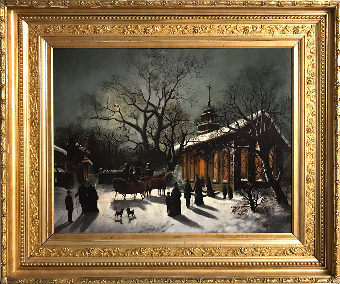 19TH CENTURY NOCTURNAL PAINTING FIGURES BY A CHURCH: Genre Scene Depicting Figures Gathered Around a Room Lit Church in a Snow-Covered Landscape, Oil/Canvas, probably English in origin, 24'' x 30'', no visible signature, period gilded gesso frame is 33.50'' x 40.25''.
