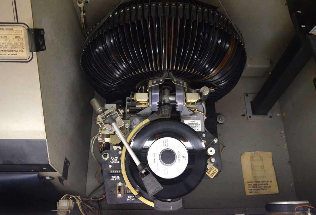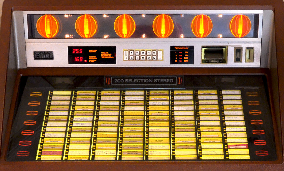 ROWE AMI JUKE BOX MODEL R-91: This Rowe R-91 Jukebox was produced in 1987 by the Ami Entertainment Co. It has 200 songs to pick from for your listening pleasure. Glass panel along top and lower center have orange semi-circle acrylic clusters with lights bordering. Original manual resides on the interior. Approx. 52'' h x 41.25'' l x 26.5'' w.