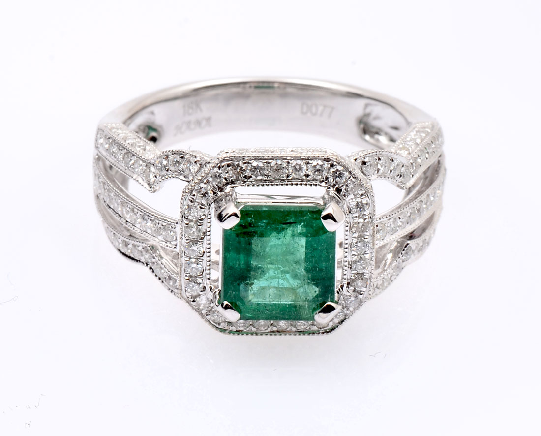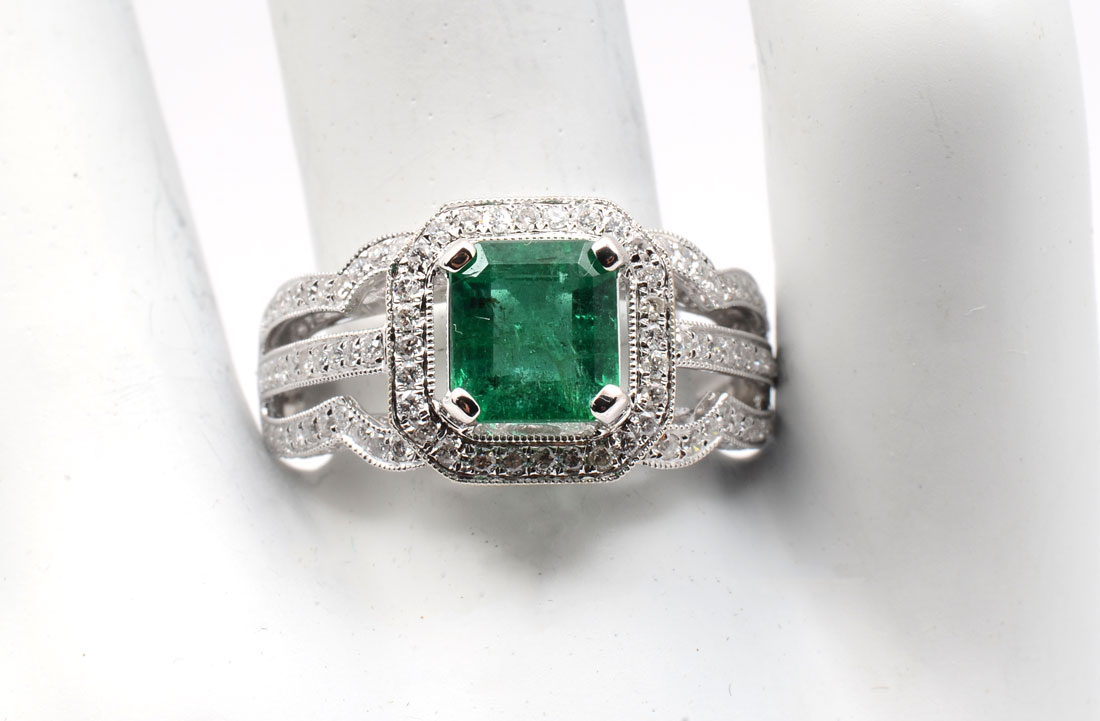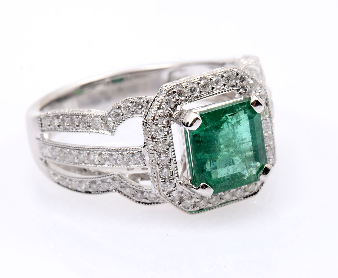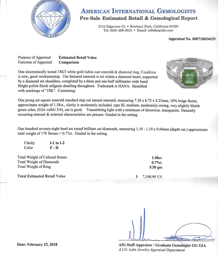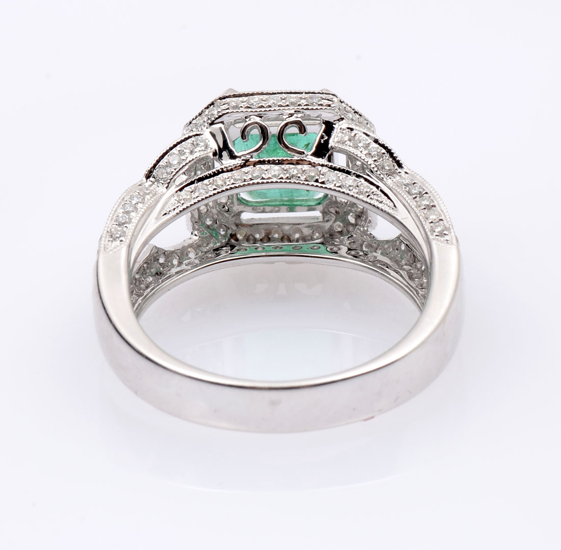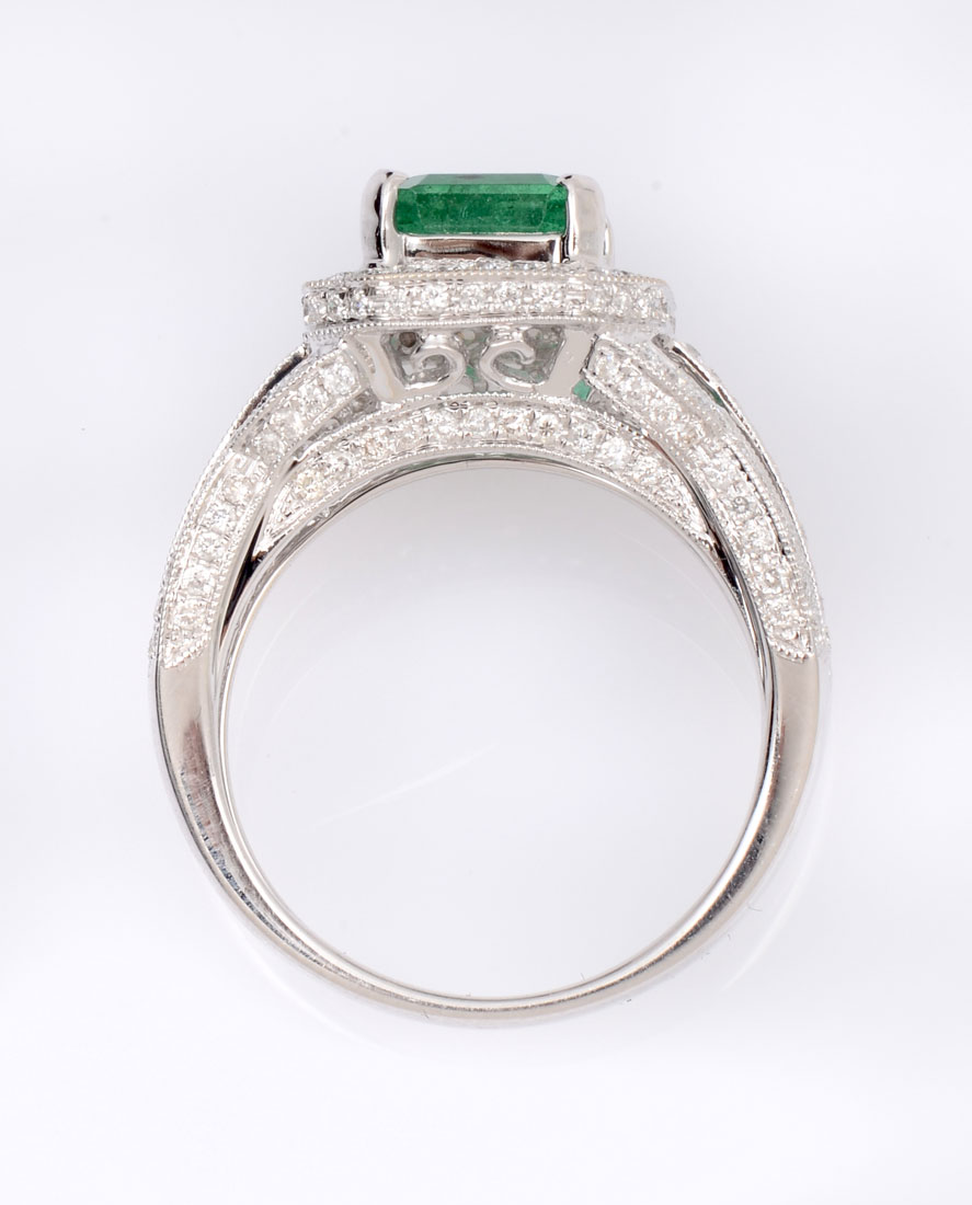 18K EMERALD & DIAMOND RING: 1.58 CT emerald is set within diamond bezel supported by diamond set shoulders. Emerald is standard step cut and is beautifully complimented by 178 bead set round brilliant cut diamonds. Size 6.25. Clarity I-1 to I2 and color is F-H. Weight 5.5 grams. Sold with American International Gemologists appraisal for $7100.