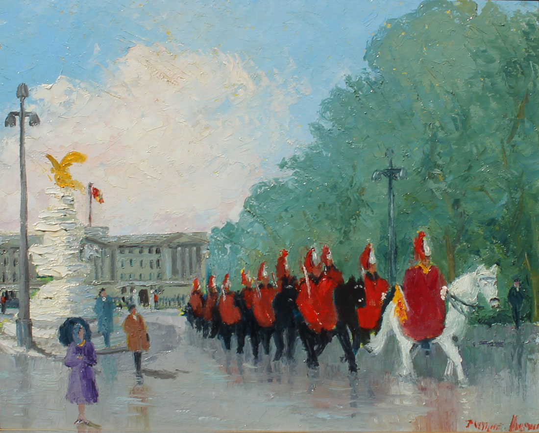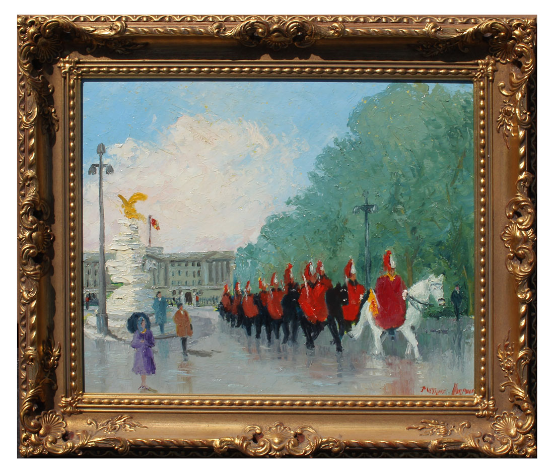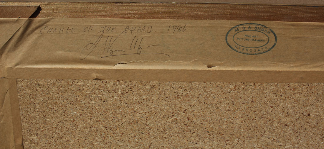 WYNNE-MORGAN, John, (British, 1906-1911): ''Change of the Guard'', Oil/Masonite, 16'' x 20'', signed lower right, signed, titled and dated 1986 verso, M & A Sharp pierce carved gesso frame, 22'' x 26''.