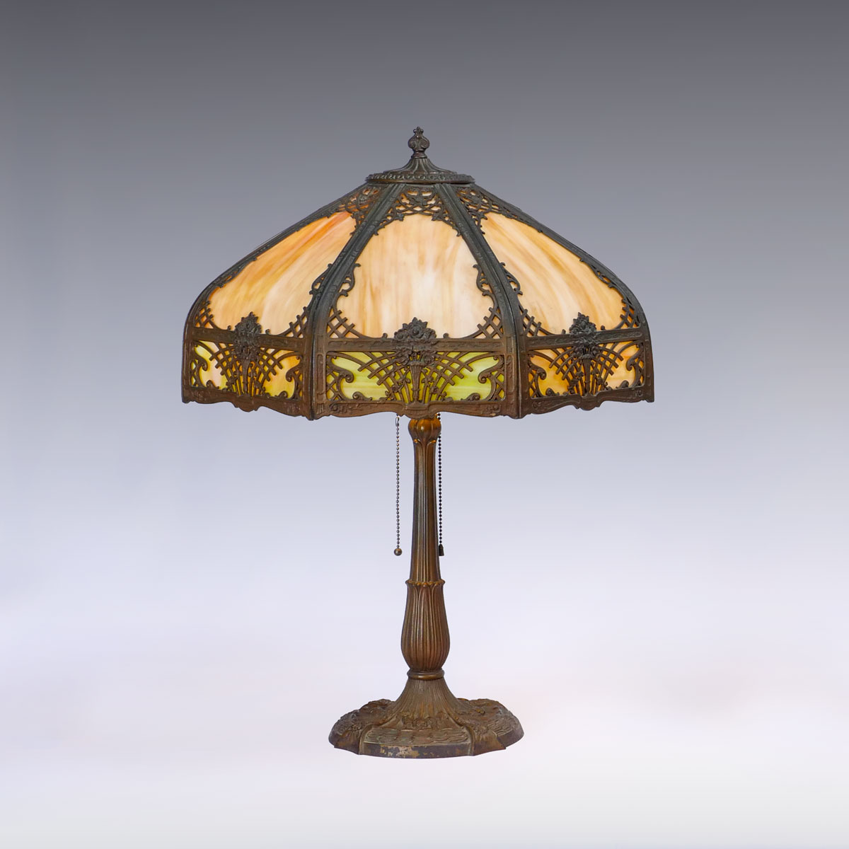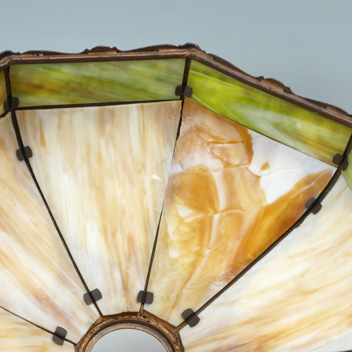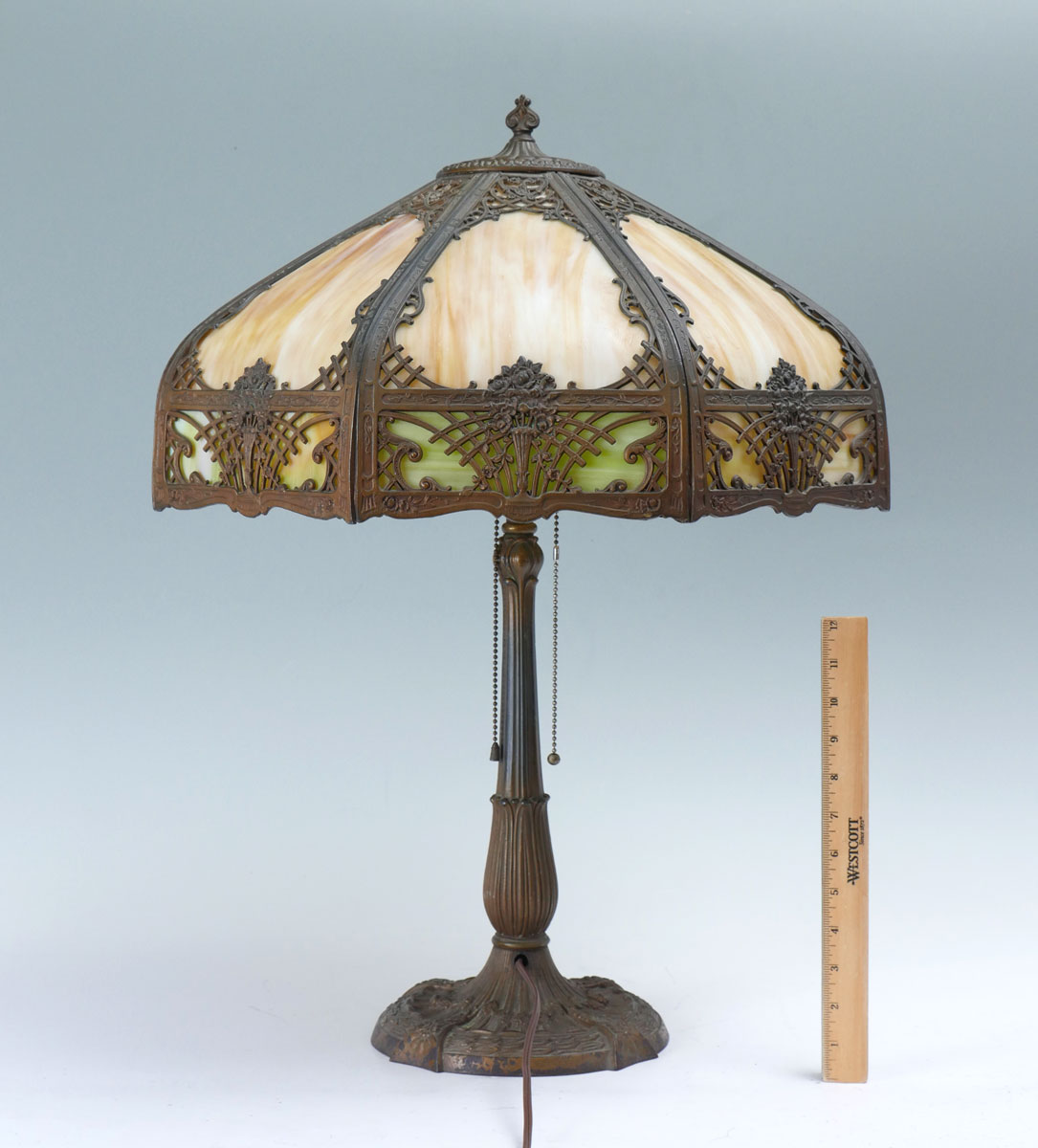 MILLER SLAG GLASS FILIGREE LAMP: Variegated Carmel slag glass panes with green slag glass panes along bottom of shade. Lattice and floral design to shade. Elongated leaf pattern on body and base with foliate complimenting. Signed M L Co 234 located underside of base. 2 lights with 2 pulls. Approx. 28'' h x 20.75'' w. Base approx. 8.5'' w.
