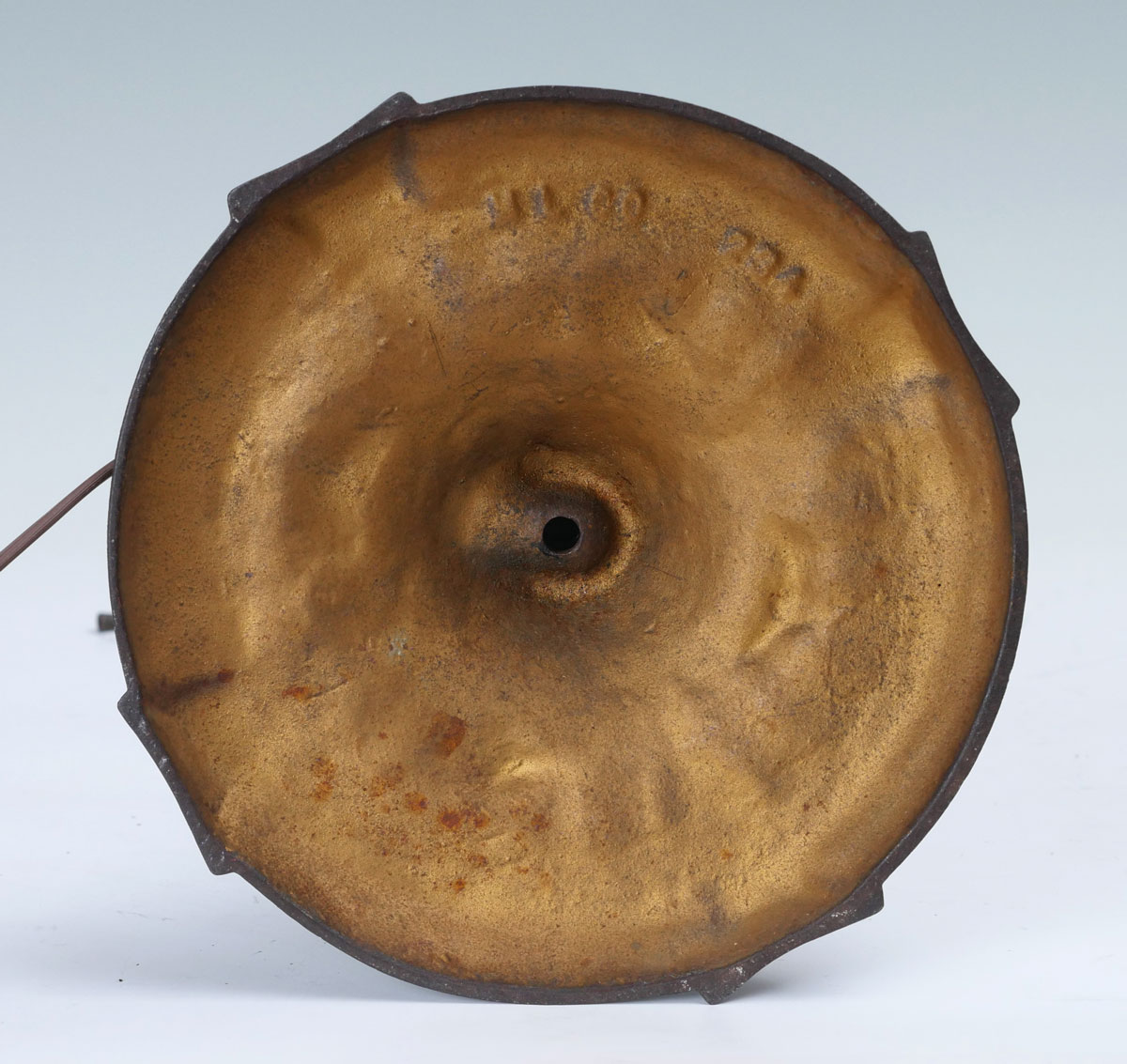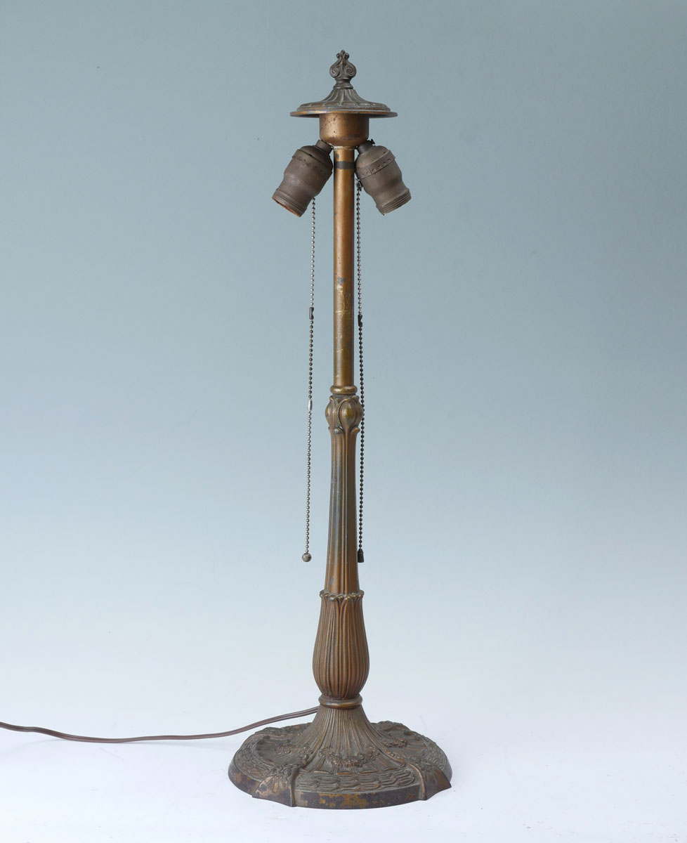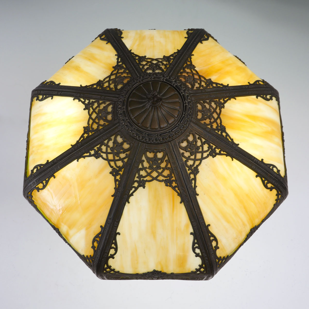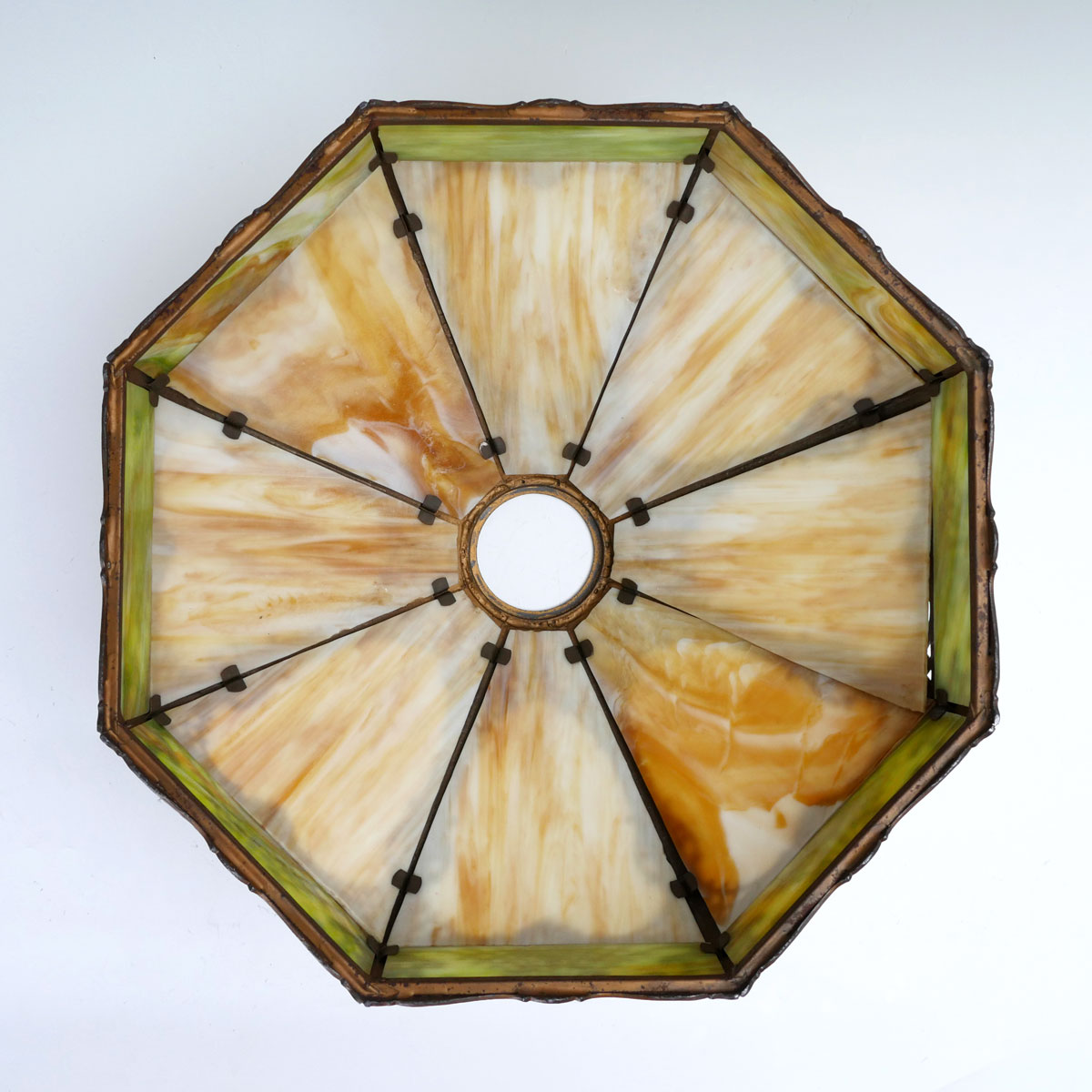 MILLER SLAG GLASS FILIGREE LAMP: Variegated Carmel slag glass panes with green slag glass panes along bottom of shade. Lattice and floral design to shade. Elongated leaf pattern on body and base with foliate complimenting. Signed M L Co 234 located underside of base. 2 lights with 2 pulls. Approx. 28'' h x 20.75'' w. Base approx. 8.5'' w.