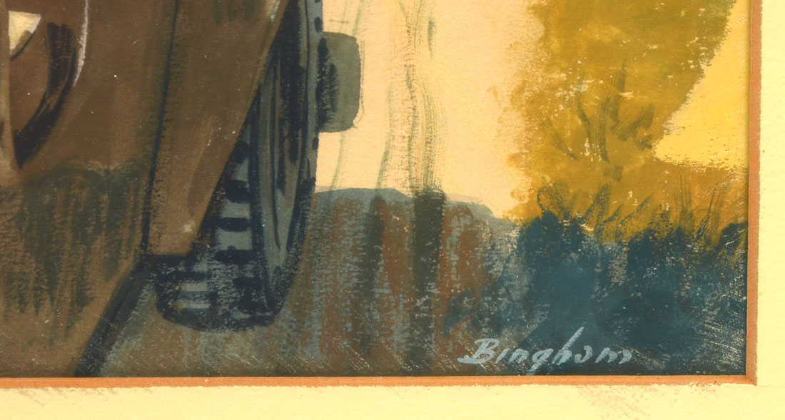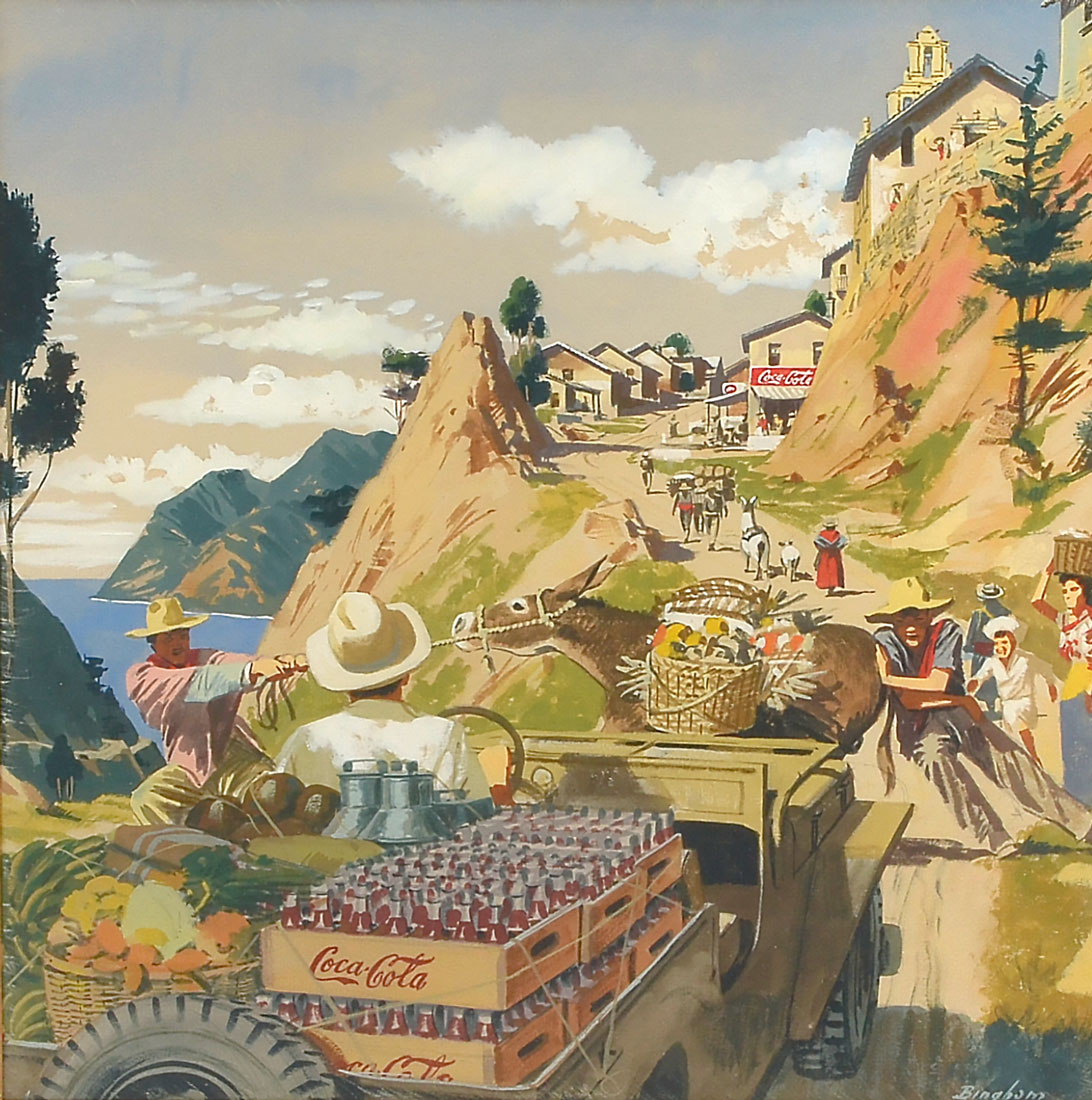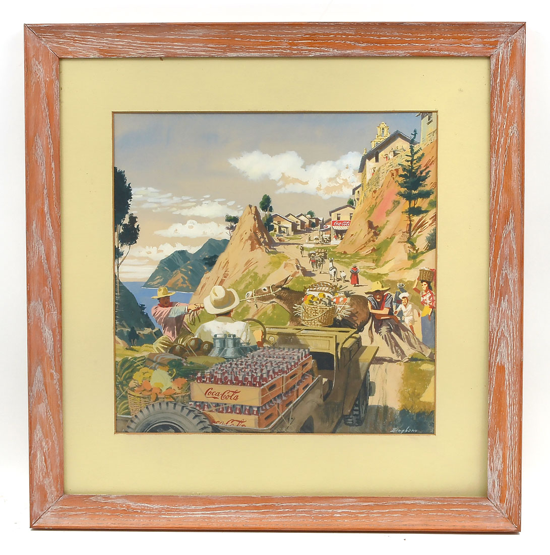 BINGHAM, James R., (American, 1917-1971): Mexican Coastal Villagers Looking on as the Jeep Delivering Cases of Coca Cola is being Detained by a Stubborn Burro, Gouache, sight size 14.5'' x 14.5'', signed lower right, framed, 23.5'' x 22.75''.