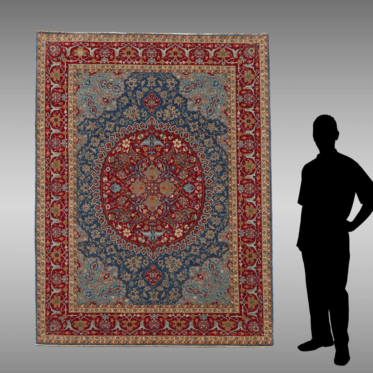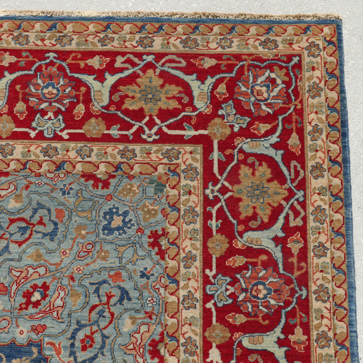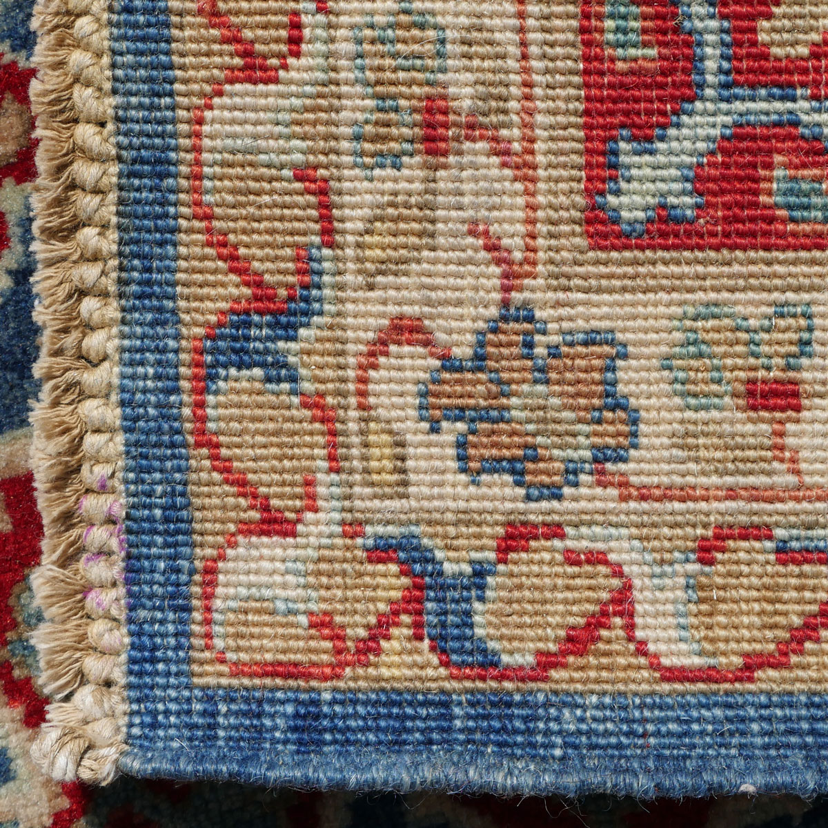 TURKISH HAND KNOTTED WOOL RUG, 5'8'' x 7'7'': This attractive rug has a two-tone blue field with a large round red/rust medallion with spandrels and a matching main border.