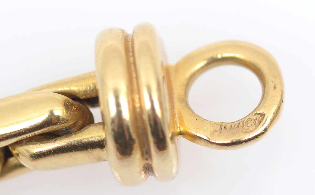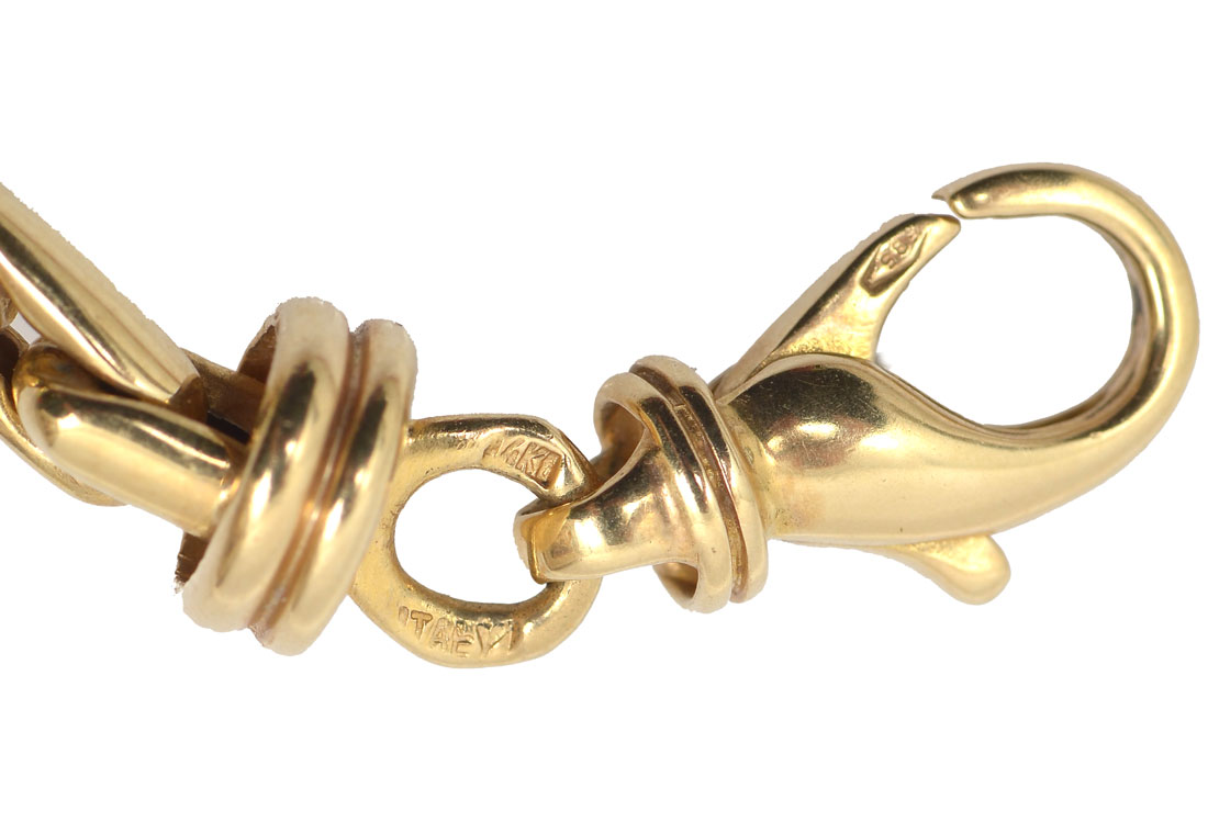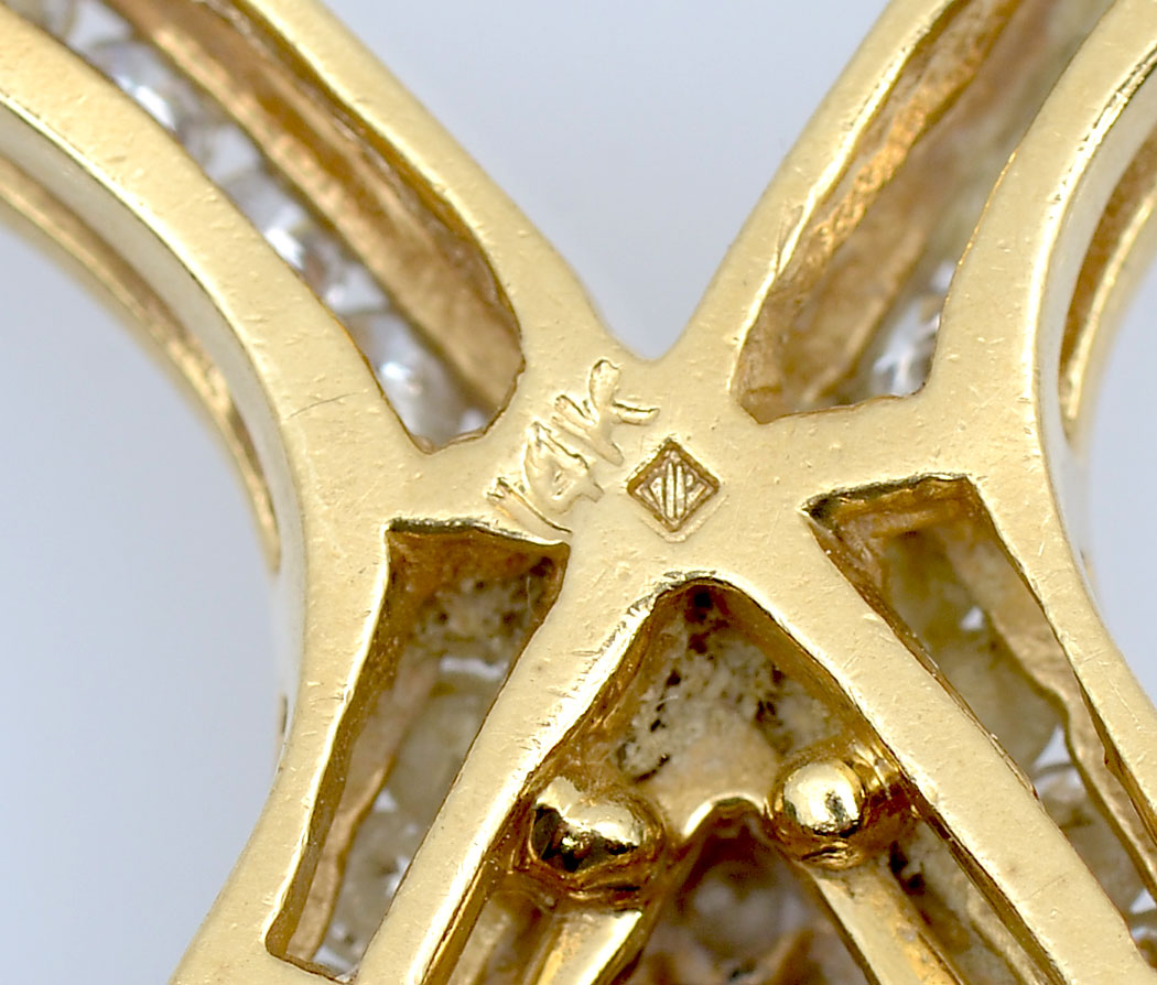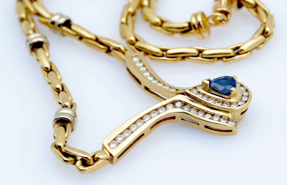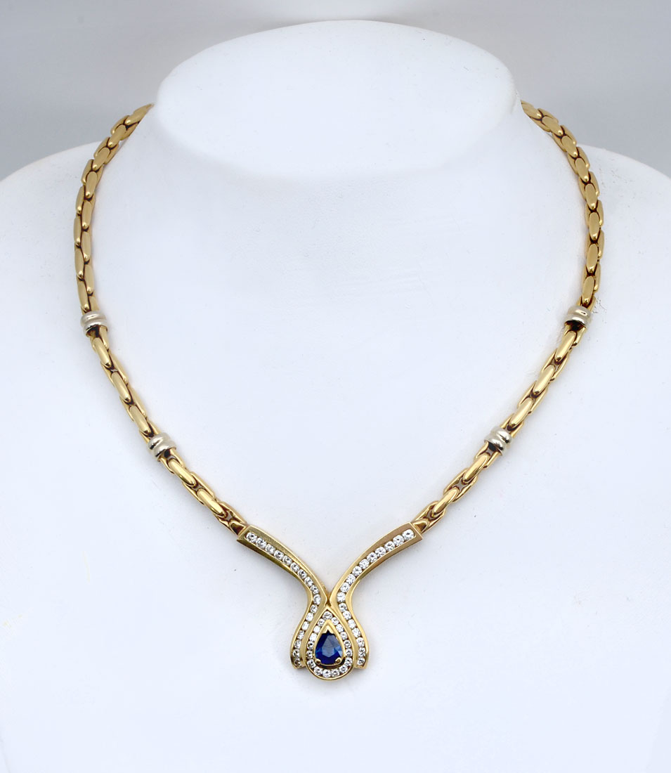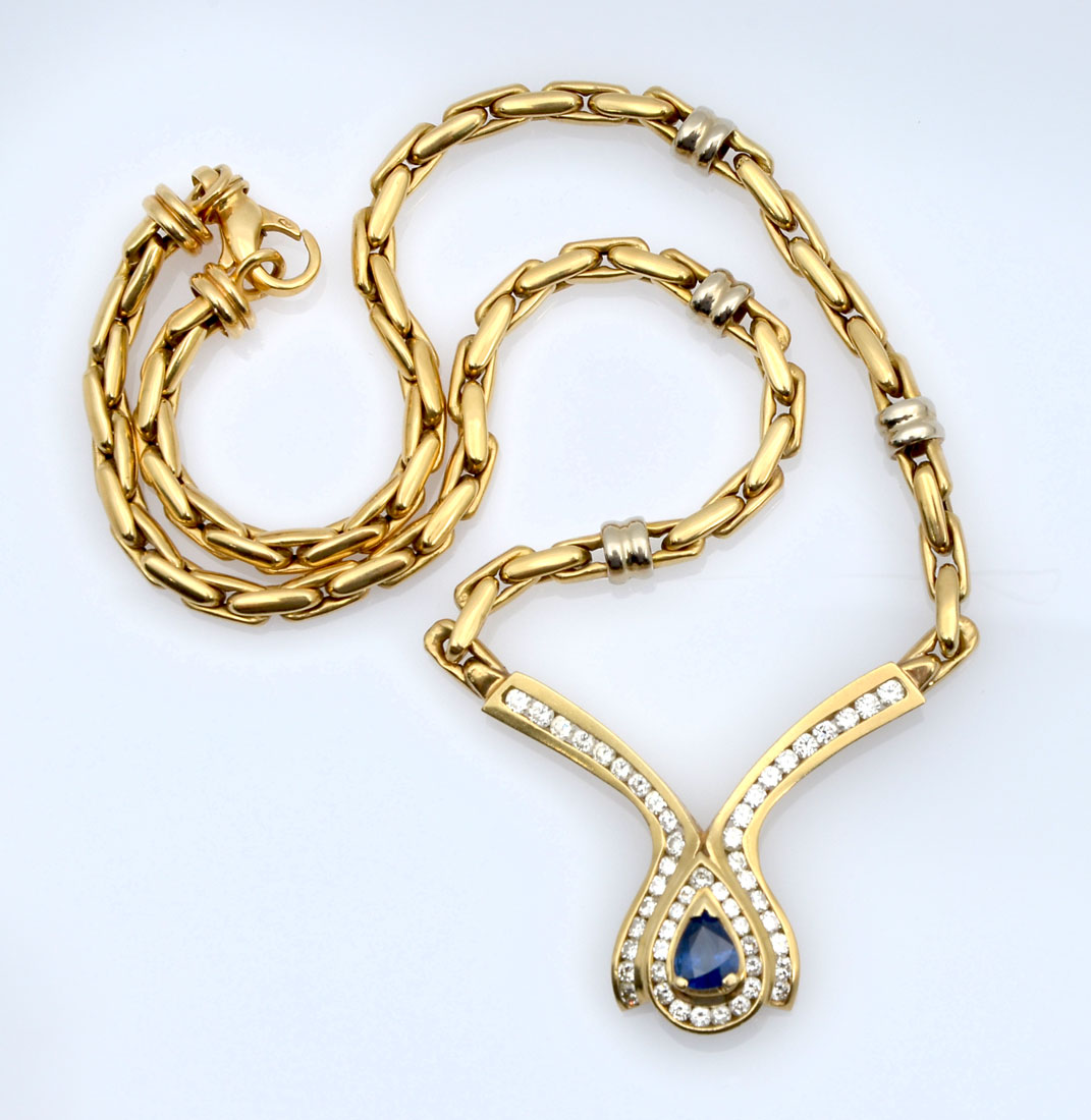 WELL MARKED 14K DIAMOND & SAPPHIRE NECKLACE: 14K yellow with white gold necklace contains one pear shaped sapphire. WEIGHT: 1.88 Ct. Approx. Rated SI in clarity (Type II), B in Hue, 6-7 in Tone and 3 in saturation. 51 round full cut diamonds. WEIGHT: 2.05 Ct. Approx. Rated VS-SI in clarity and G-H in color. The diamonds are channel set. The sapphire is prong set. Fancy link chain with giant lobster claw. Length: 18'' Weight: 37.9 grams. Well marked on the back of the pendant, 14K and perhaps the makers mark as well as on the spring ring.
