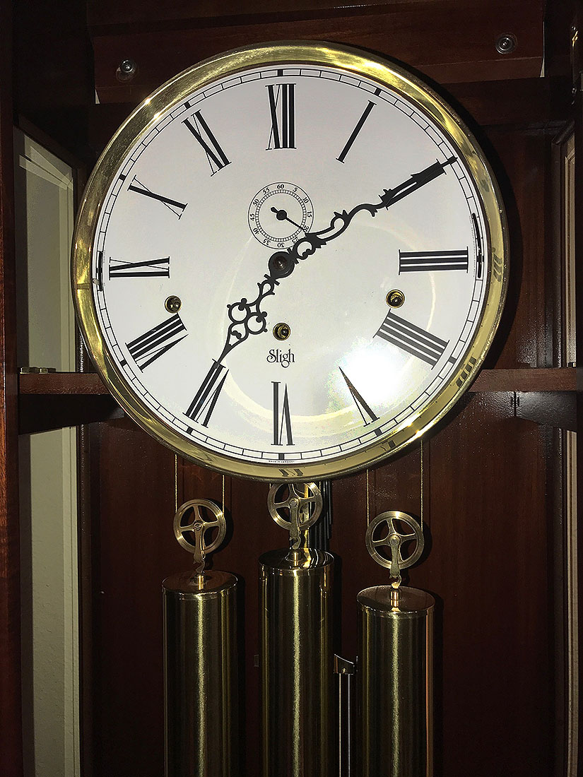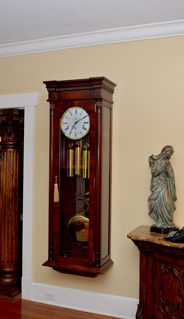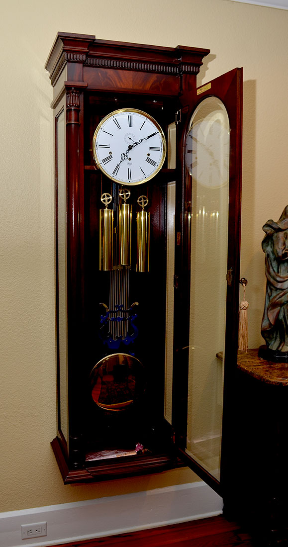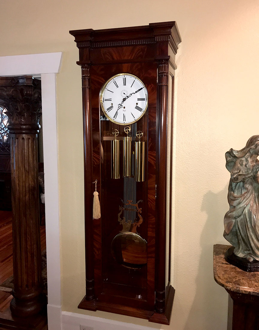 IMPRESSIVE SLIGH MAHOGANY HANGING CLOCK: Well-maintained Solid Mahogany case with beveled glass front and sides. Gridiron brass pendulum with Black Forest clock movement. Approx. 70.75'' h x 23.5'' l x 14'' w.