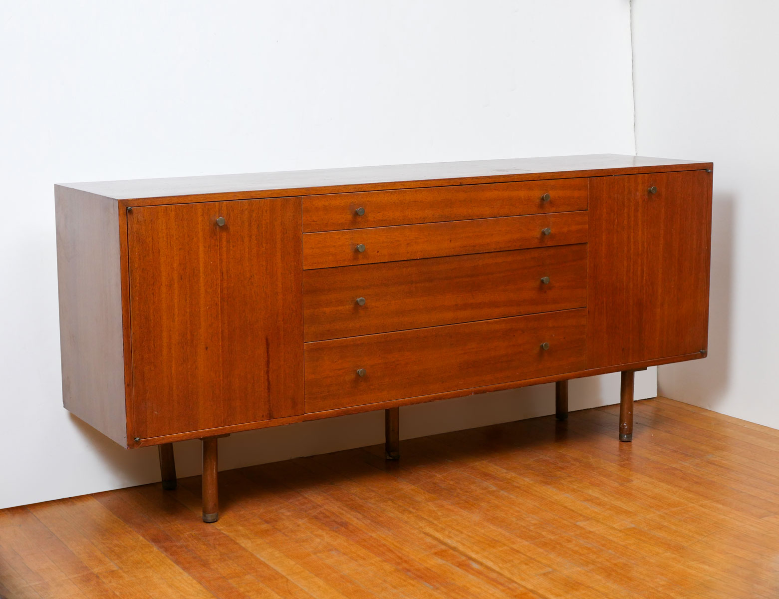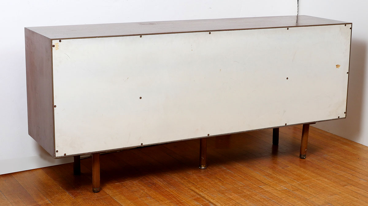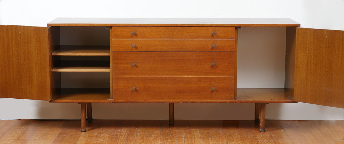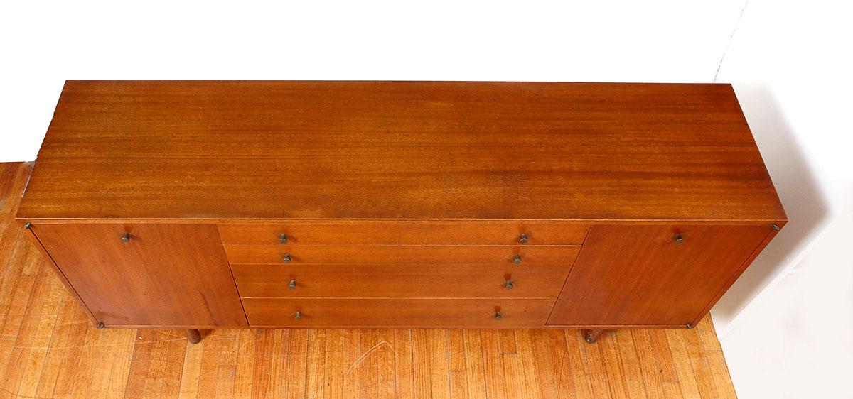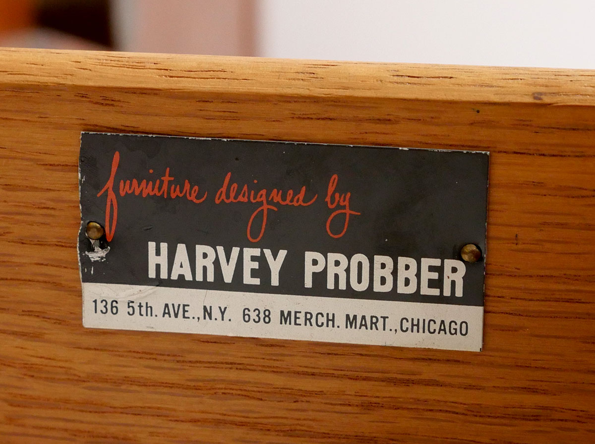HARVEY PROBBER MID CENTURY CREDENZA SIGNED: Designed by Harvey Probber with 4 drawers and 2 Doors, of which all have graduated pulls. Rests on wood supports. Top drawer has the Harvey Probber tag.