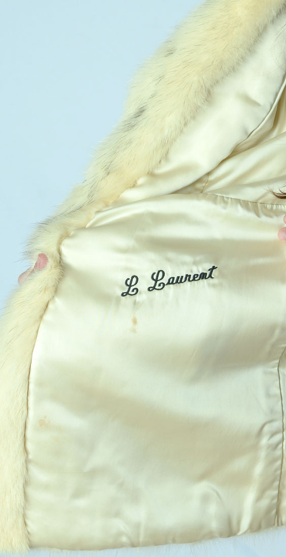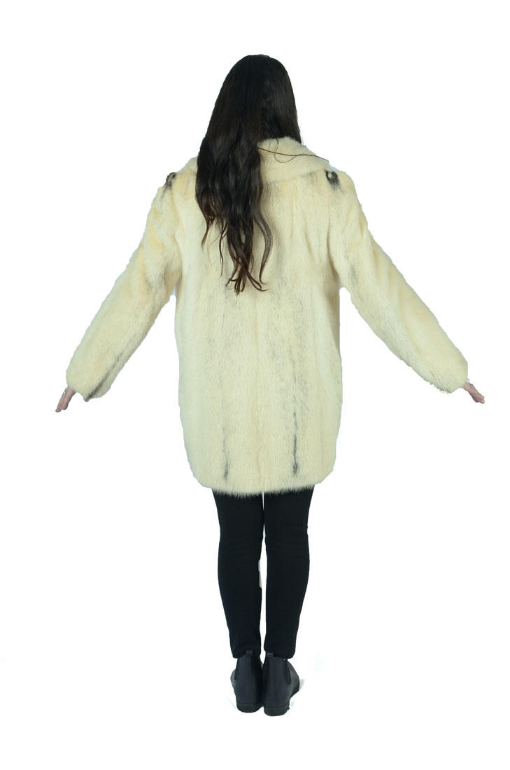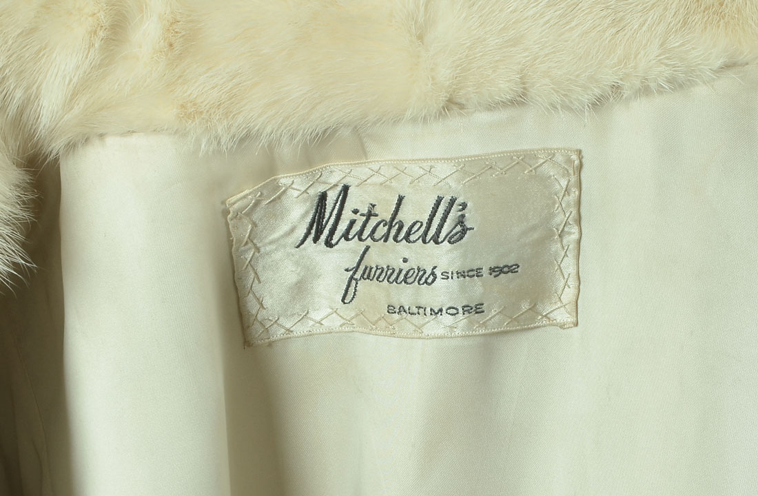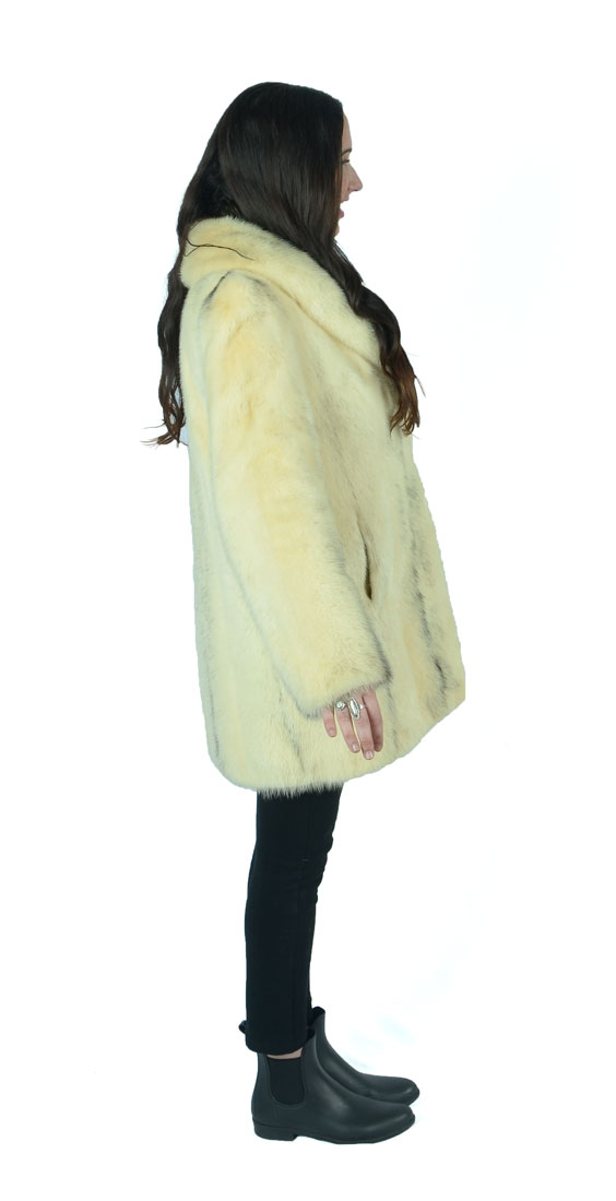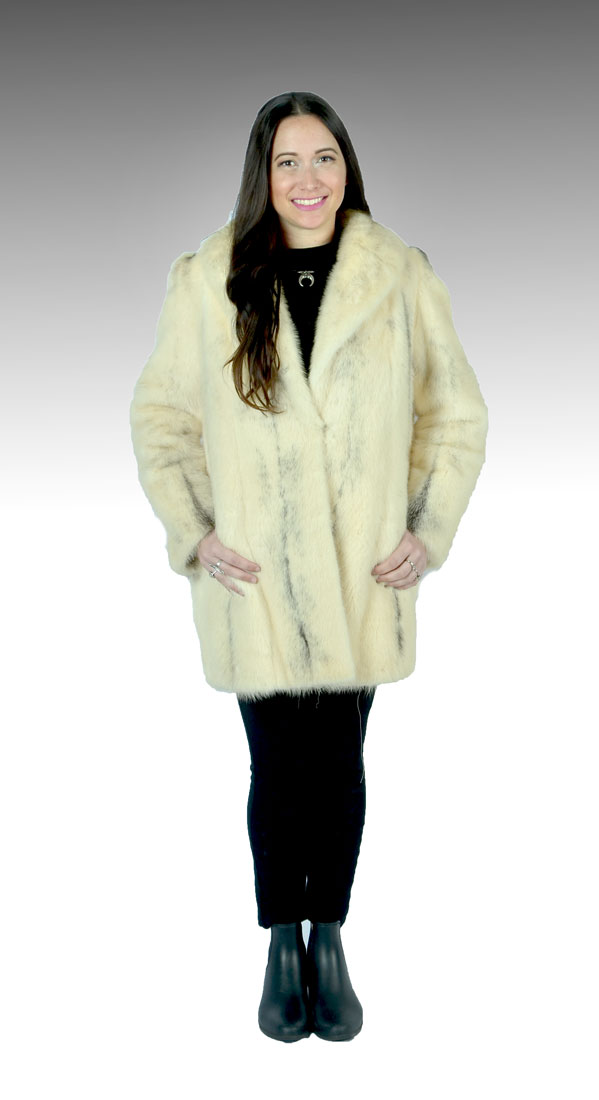 VINTAGE BLONDE MINK JACKET WITH BLACK ACCENTS: Mottled blonde mink is perfectly accented with splashes of black. 2 hook and eye closures in front with 2 front slash pockets. Lining appears to be in good condition with label ''Mitchell's furriers since 1902 Baltimore''. Name embroidered in lining. Approx size 4.