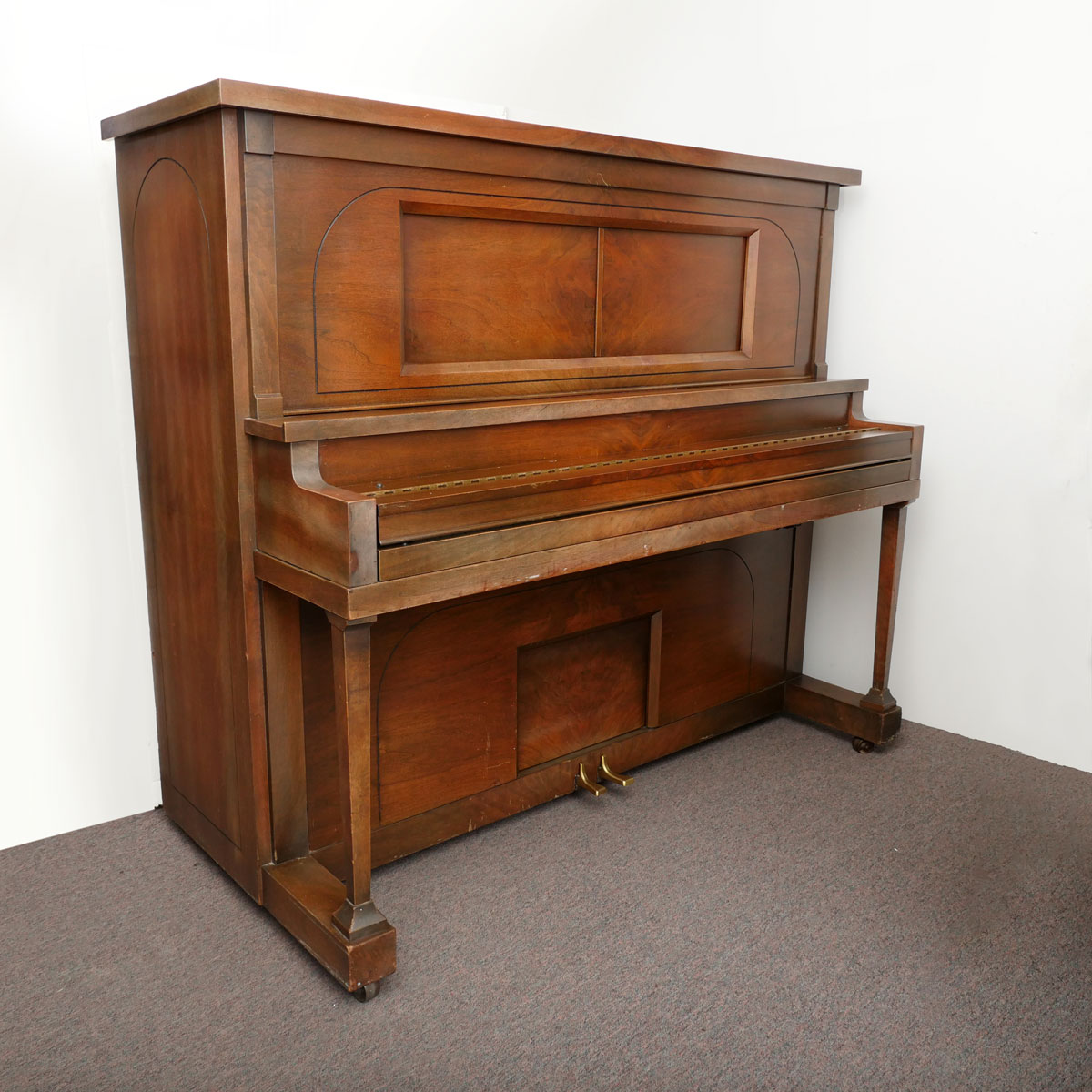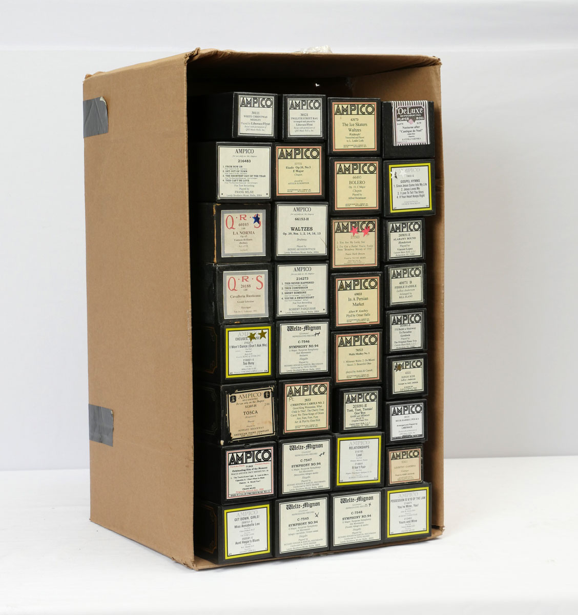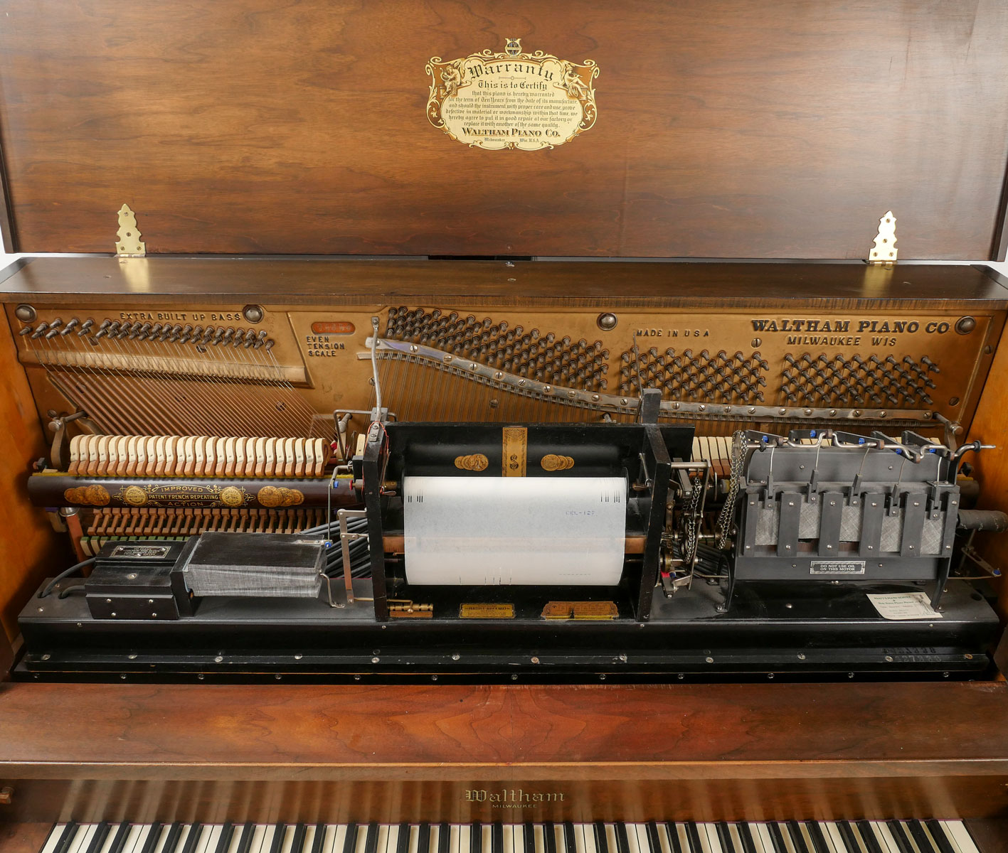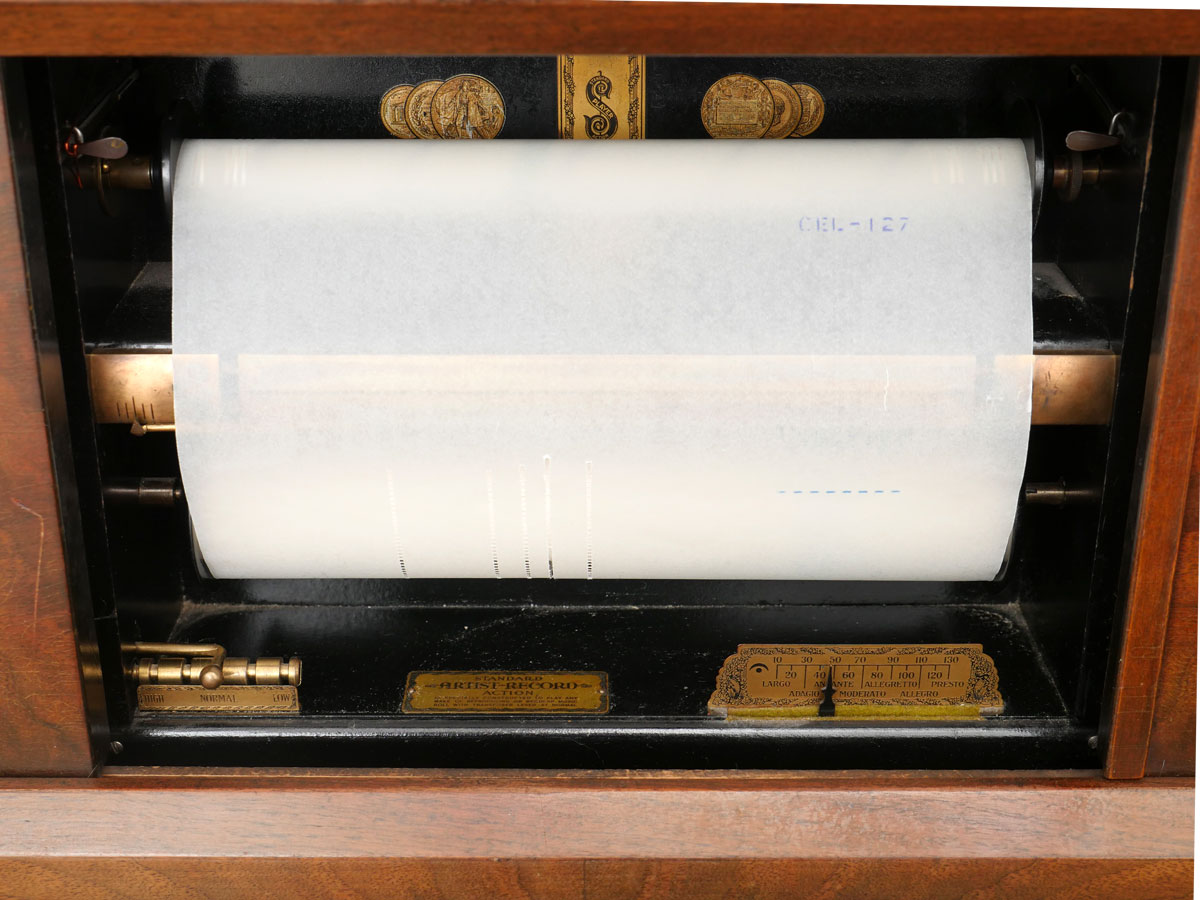 WALTHAM UPRIGHT PLAYER PIANO 7 33 ROLLS: This upright player piano was constructed by Waltham of Milwaukee, Wisconsin with the serial #75354 under the lift top. Included in this lot is an additional 33 player rolls. Equipped with Standard Player Action player. Approx. 53'' h x 61.5'' l x 29'' w.