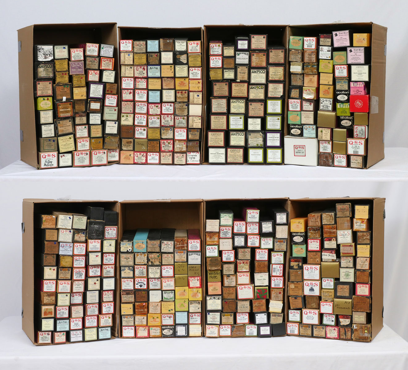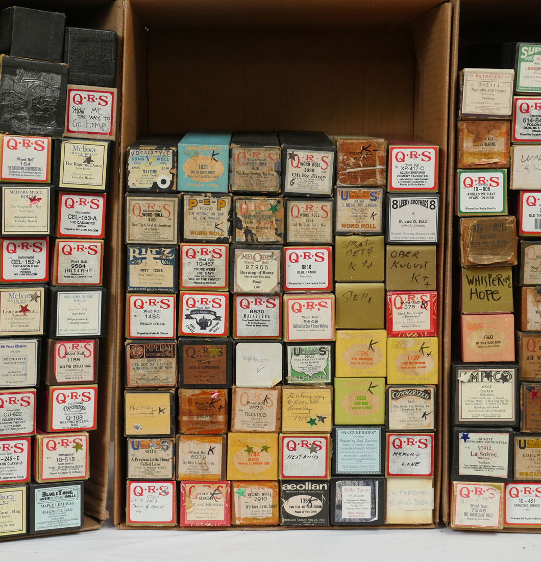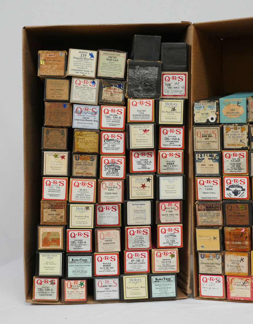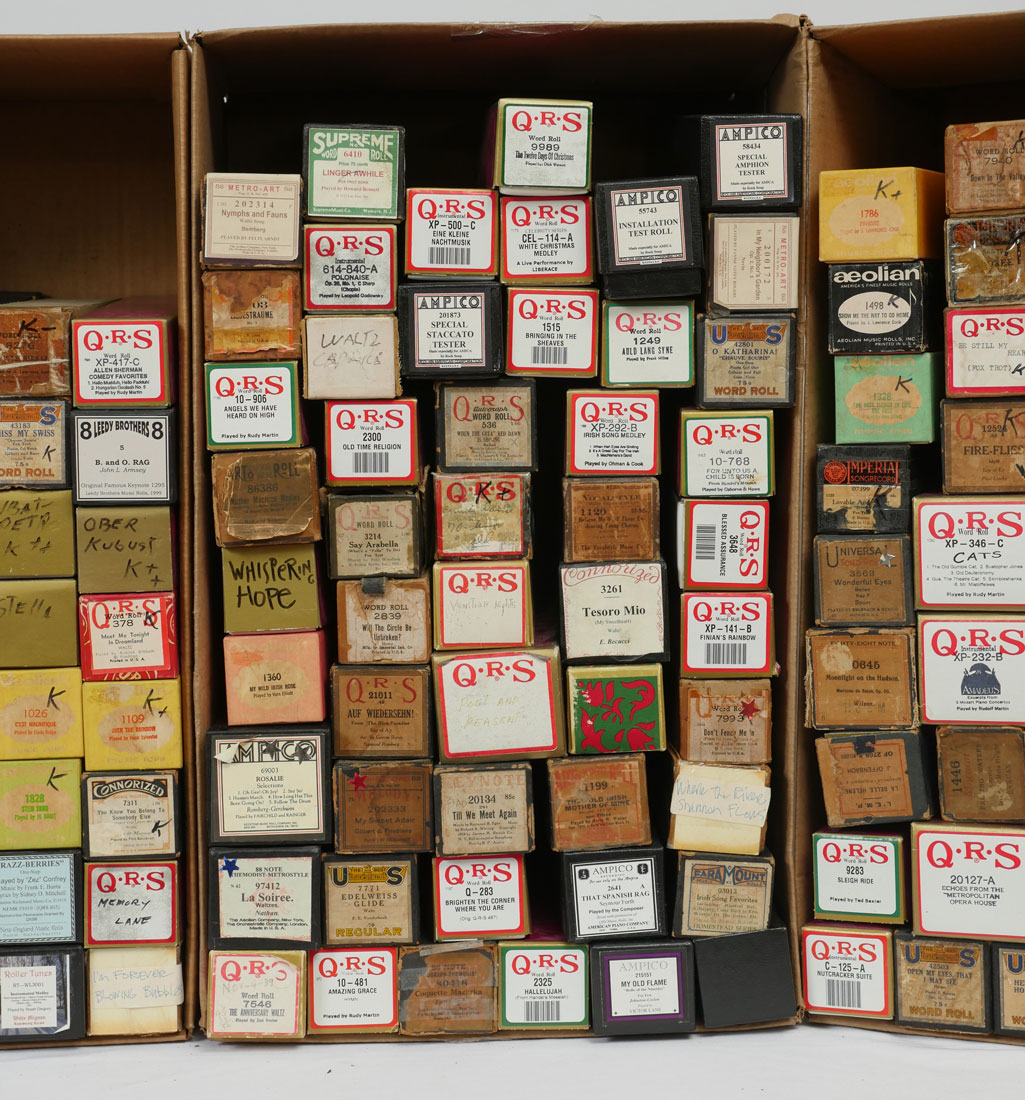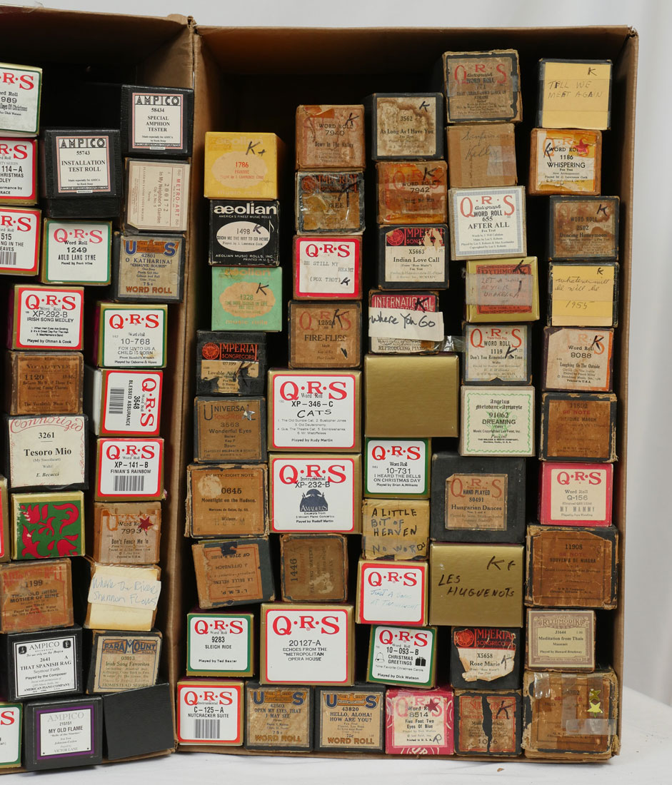 AMPICO AND QRS PLAYER PIANO ROLLS: An eclectic 8 box collection of approximately 300 Ampico & QRS perforated music rolls for a player piano.