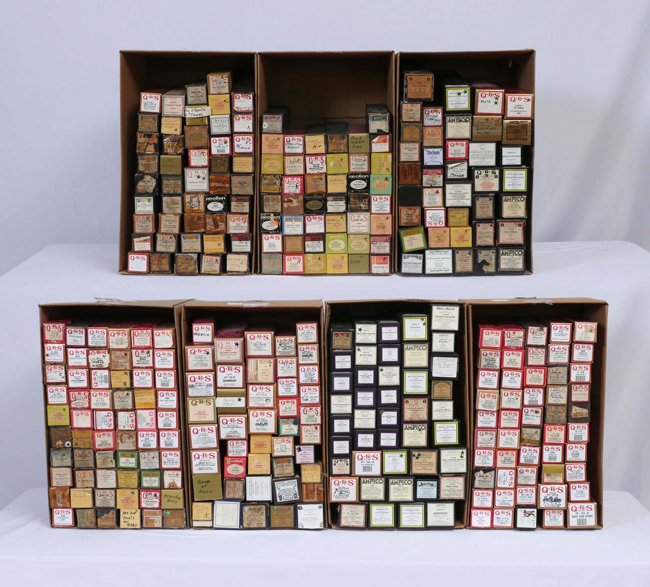 AMPICO AND QRS PLAYER PIANO ROLLS: An eclectic 7 box collection of approximately 250 Ampico & QRS perforated music rolls for a player piano.