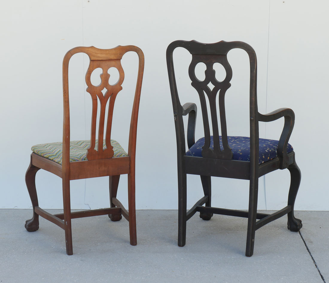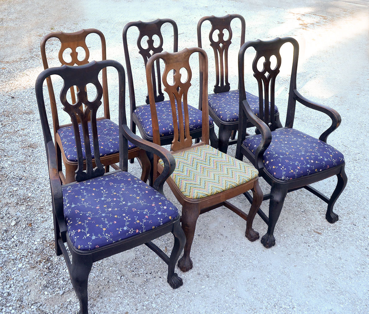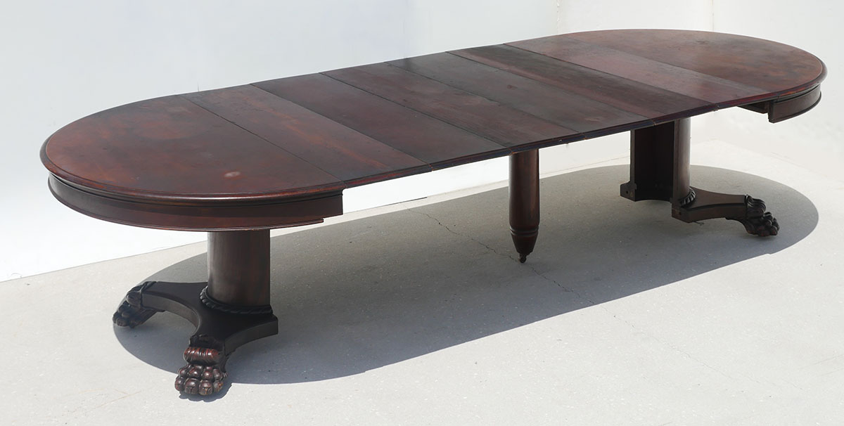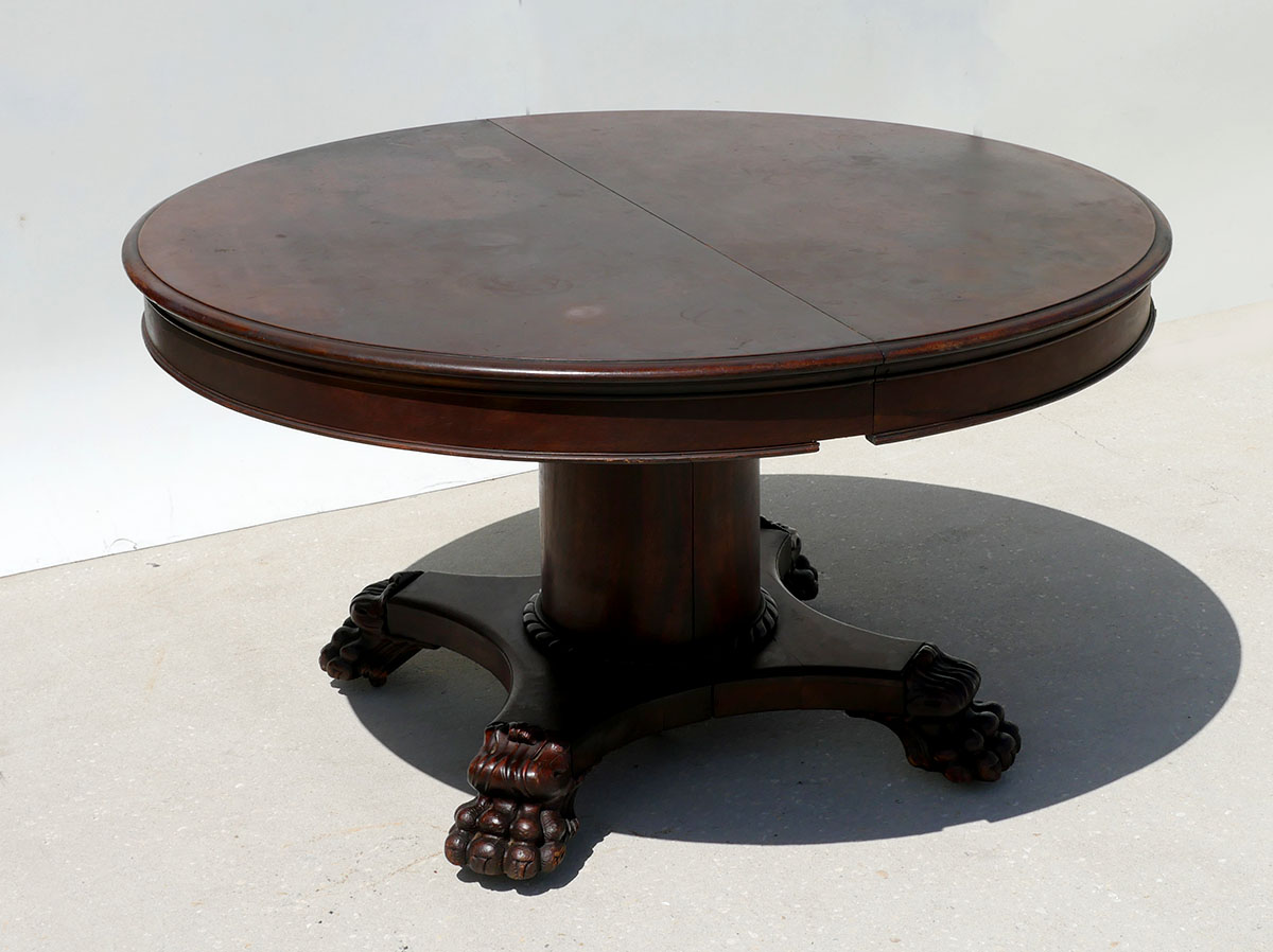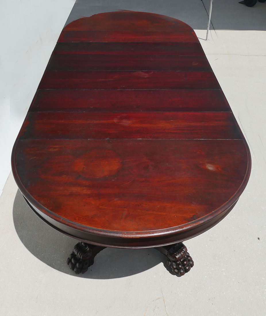 7 PC CARVED HORNER ERA MAHAGONY DINING TABLE & CHAIRS: Carved mahogany dining table attributed to Horner. Center support column for addition of the 6 extension leaves. Large outer column attached to base with 4 5-toed lions paw feet on casters. Approx. 29.5'' h x 54'' w. Leaves are 54'' l x 12'' w. Includes 6- claw on ball feet chairs that have a carved and pierced back support. 4 chairs are upholstered in a blue ground with scrolling foliate design, and 2 are hand stitched in a v-line pattern.