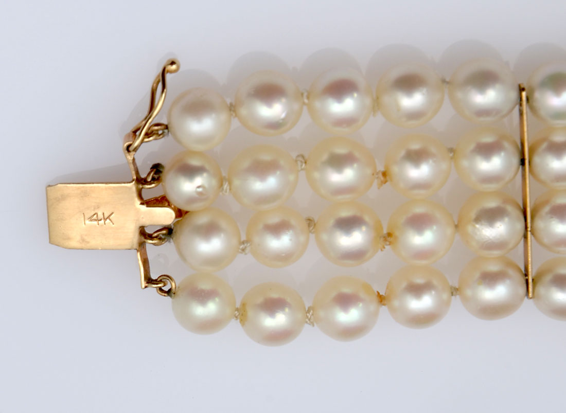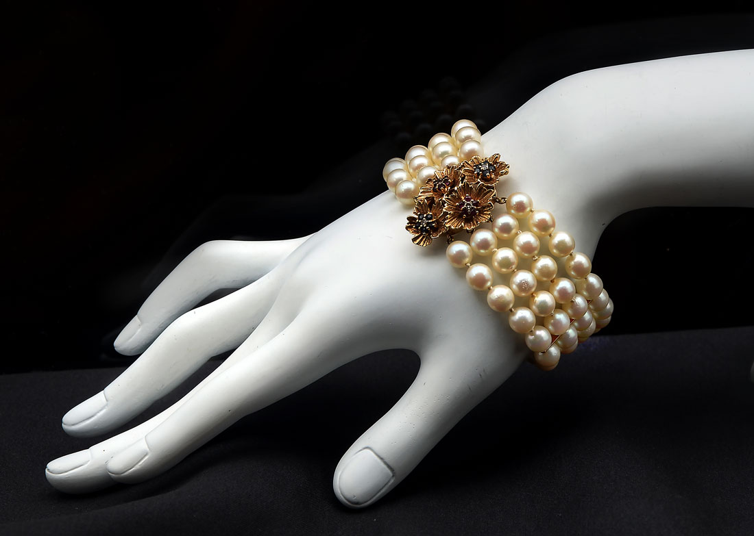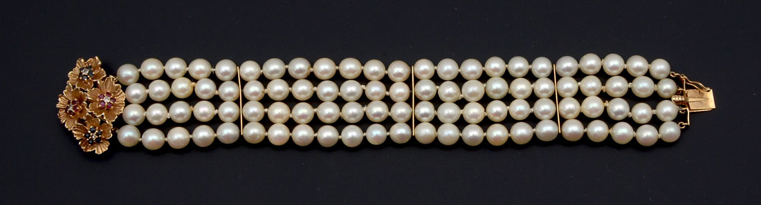 14K CULTURED PEARL & GEMSTONE BRACELET: 14K yellow gold clasp contains round faceted rubies, sapphires and diamonds. TOTAL WEIGHT: 1.00 Ct. Approx. Four strands of 7.00 mm cultured pearls, approx 1'' wide. Slightly blemished with high luster. 14K spacers. Length: 8'' Gold Weight: 10.0 grams. approx.
