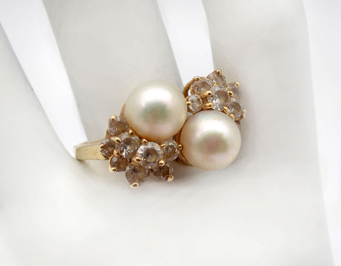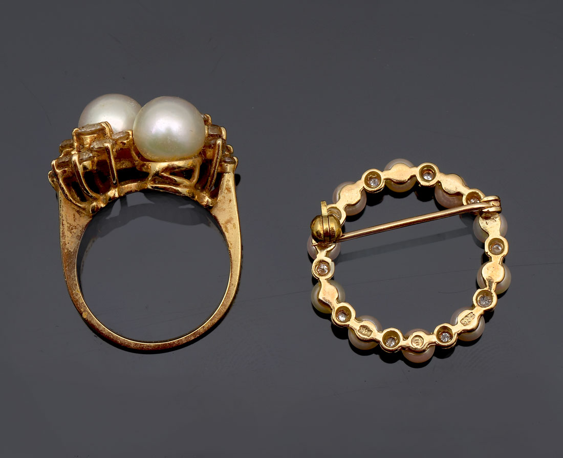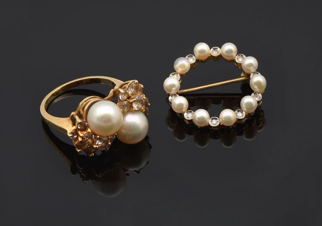 14K PEARL RING AND CIRCLE PIN: 14K yellow gold ring contains round cut CZ's and two 8.00 mm cultured pearls. 14K yellow gold pin contains 10 cultured pearls and 10 round full cut diamonds. Weight: 05 Ct. Weight: 8.8 grams Size: 7.