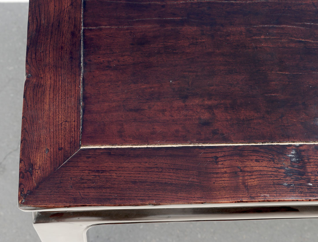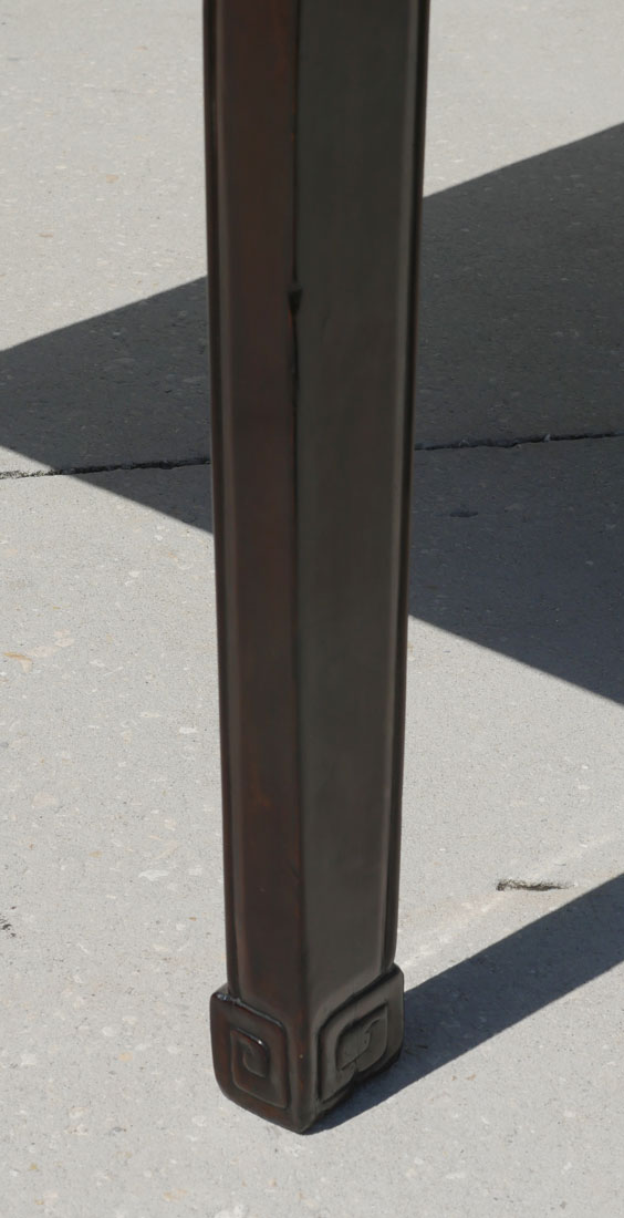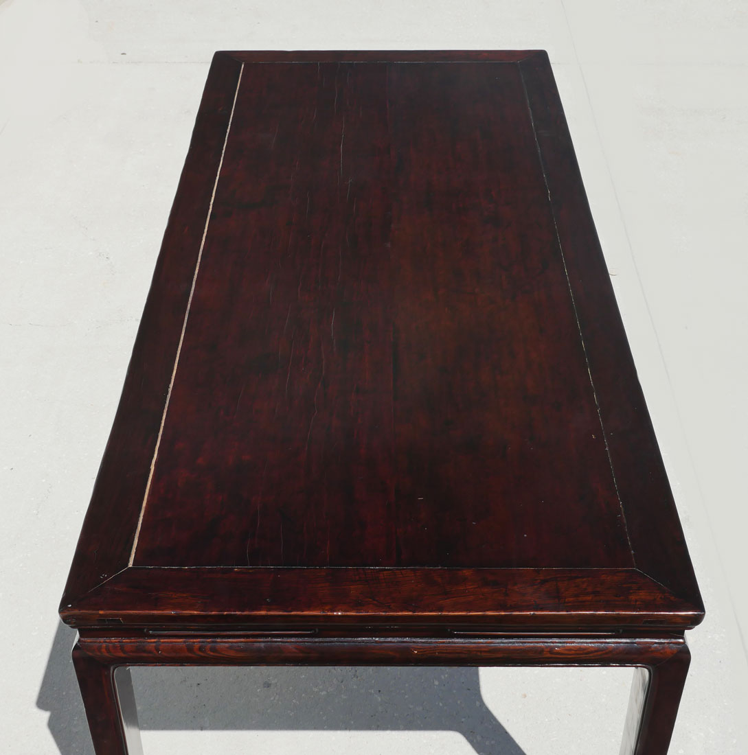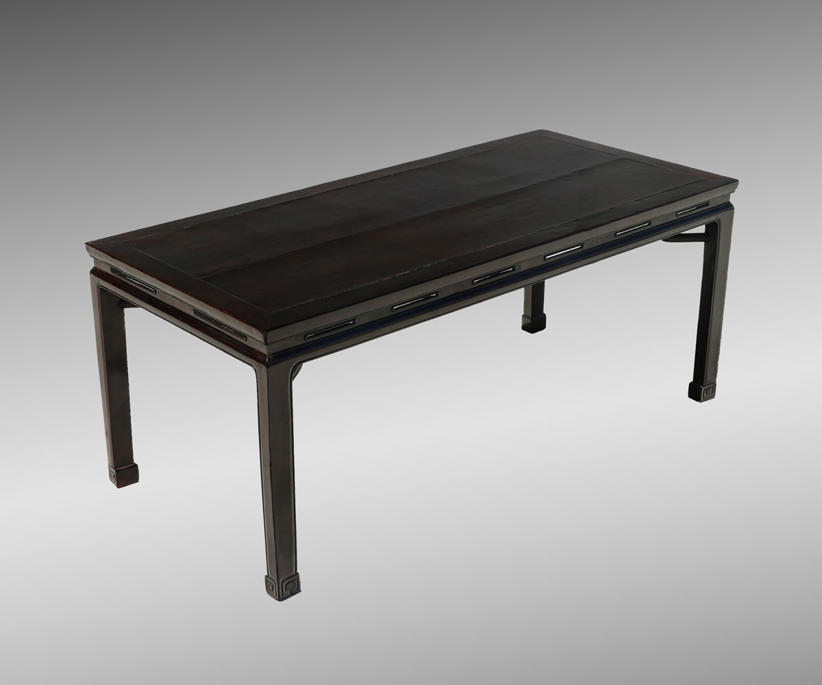 CHINESE CARVED AND PIERCED ELMWOOD DINING TABLE: Solid Chinese carved elm wood dining table with mortised joints and carved S-shaped supports under corners. Incised border on all sides with scrolled feet. Pierced elongated ovals accent all sides. Approx. 31.25'' h x 76.25'' l x 34.75'' w.