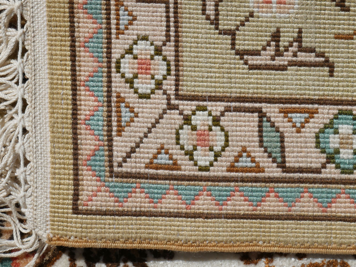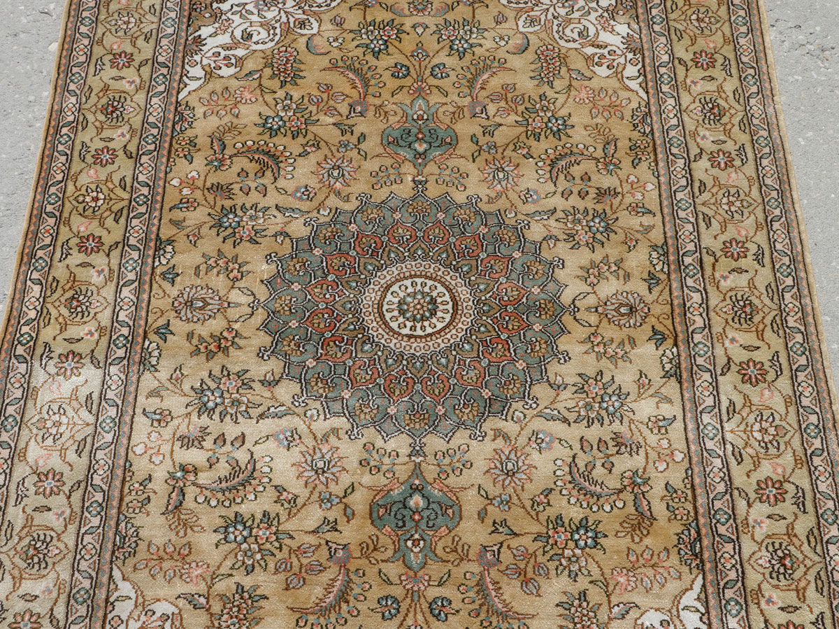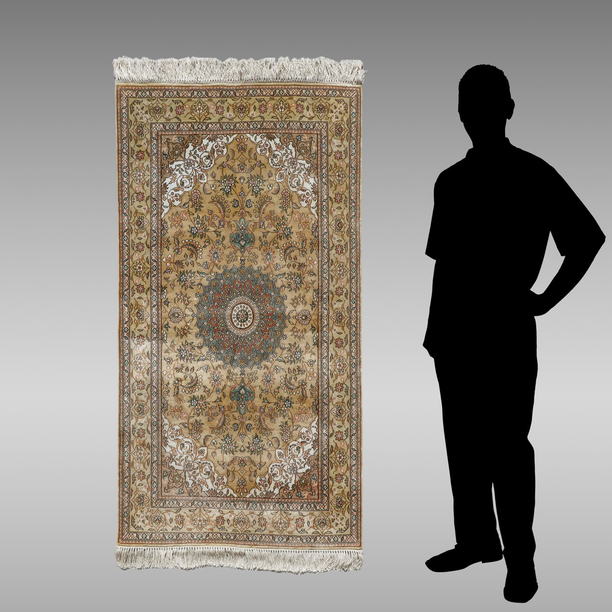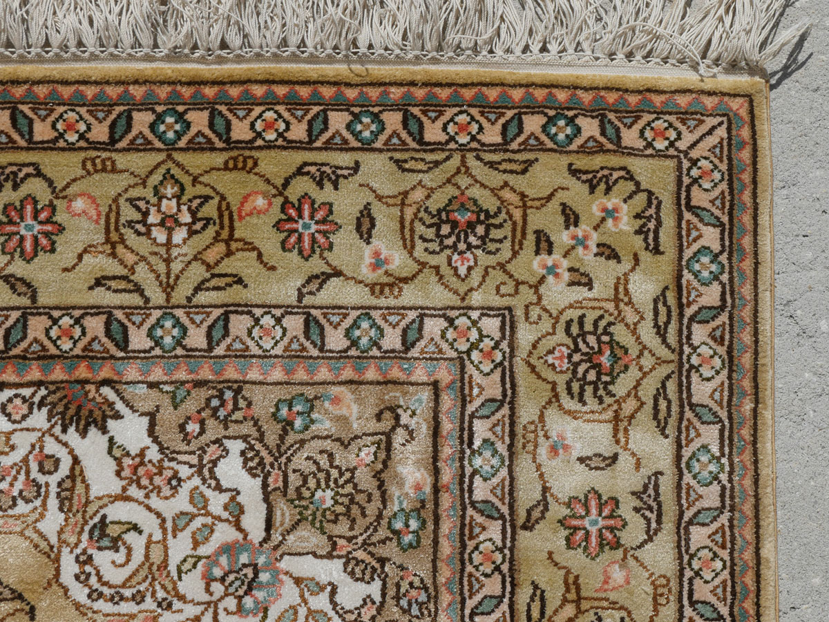 TURKISH HAND KNOTTED SILK ON SILK RUG, 3' X 3'5'': This rug has a lovely pale yellow field with a round aqua, rust, pink, and white central medallion and spandrels. An open design of flowers and leaves linked by vines completes the field.