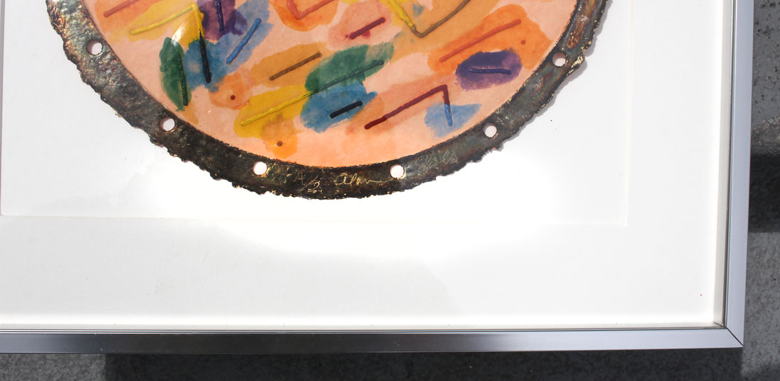 SHIELDS, Alan (American, 1944-2005): Mixed Media Composition with Watercolor and Applied Decoration, 10'' in diameter, framed 15.25'' x 15.25''.
