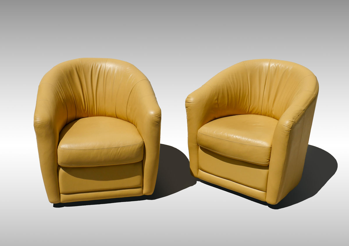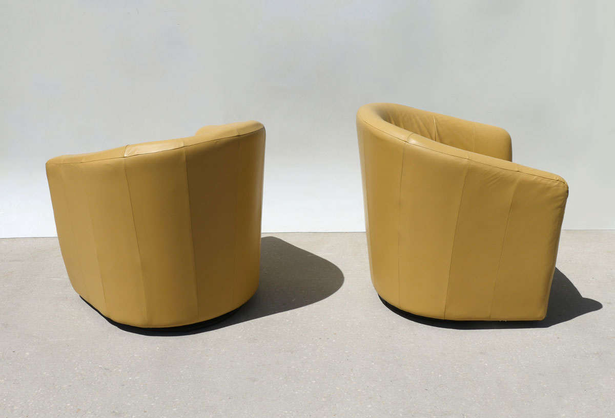 PAIR OF ITALIAN LEATHER BARREL-BACK CHAIRS: 2 Mid-Century Italian butterscotch vertically stitched leather barrel-back swivel club chairs. Approx. 32'' h x 32'' x 31'' w.