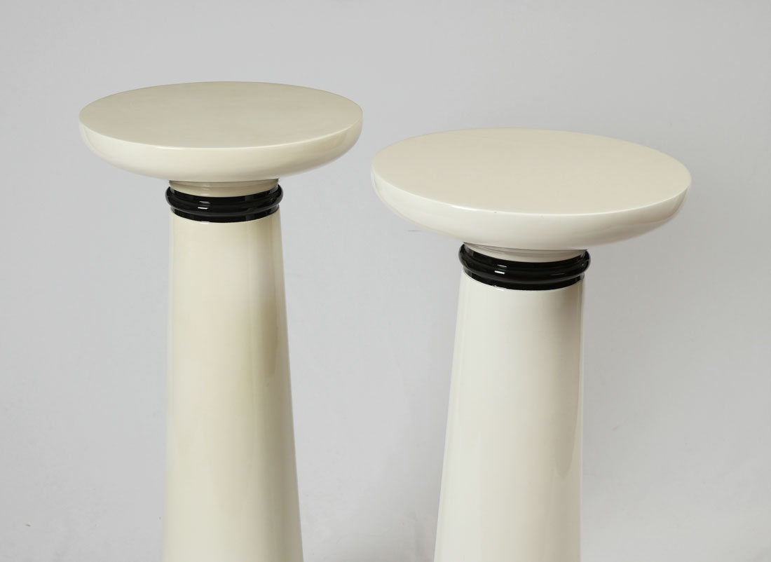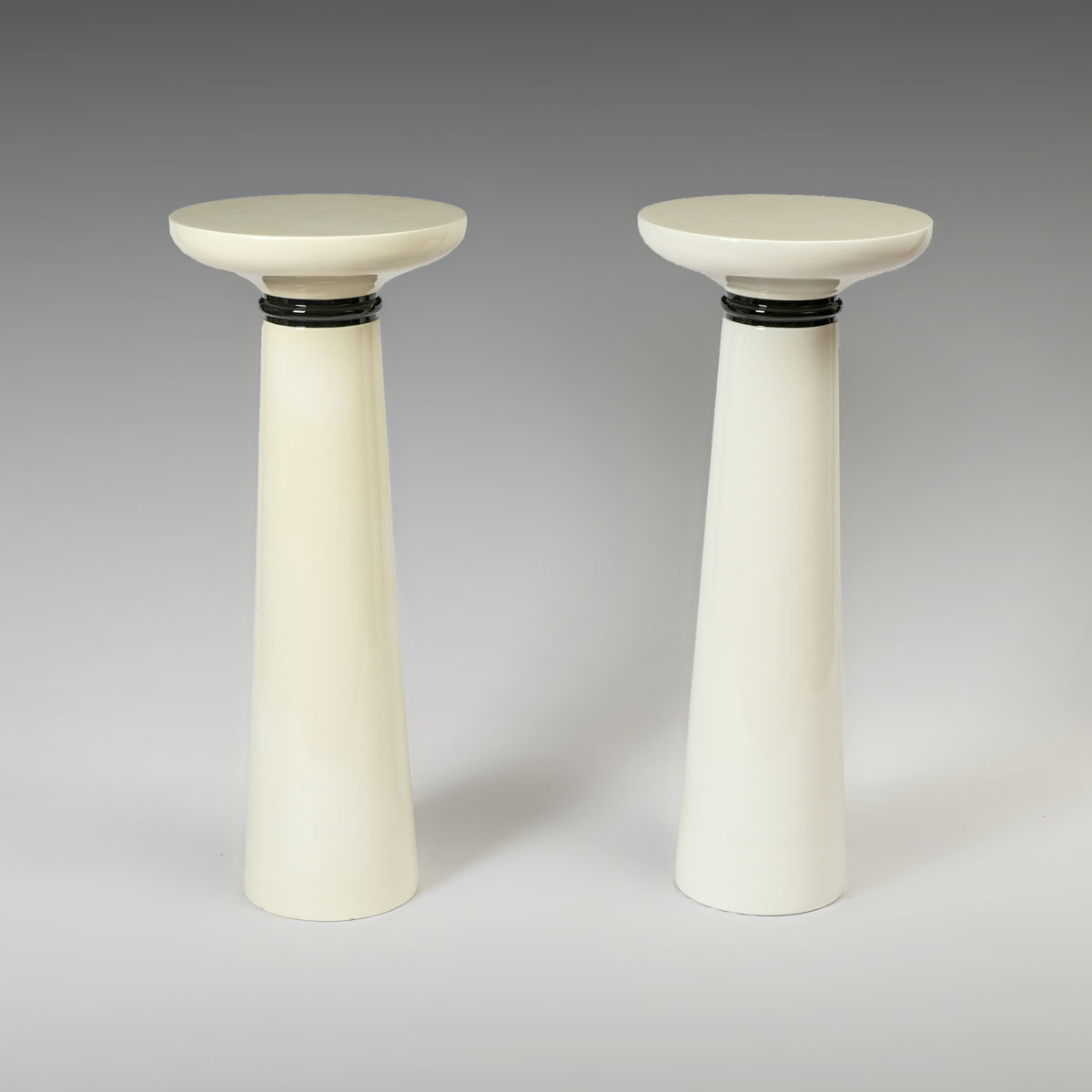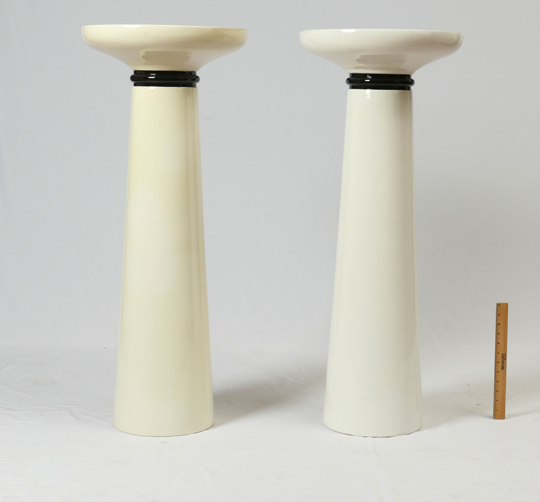 PAIR OF MODERN PEDESTALS: 2 modern white with a black collar fiberglass pedestals. Approx. 39.25'' h x 16'' w.